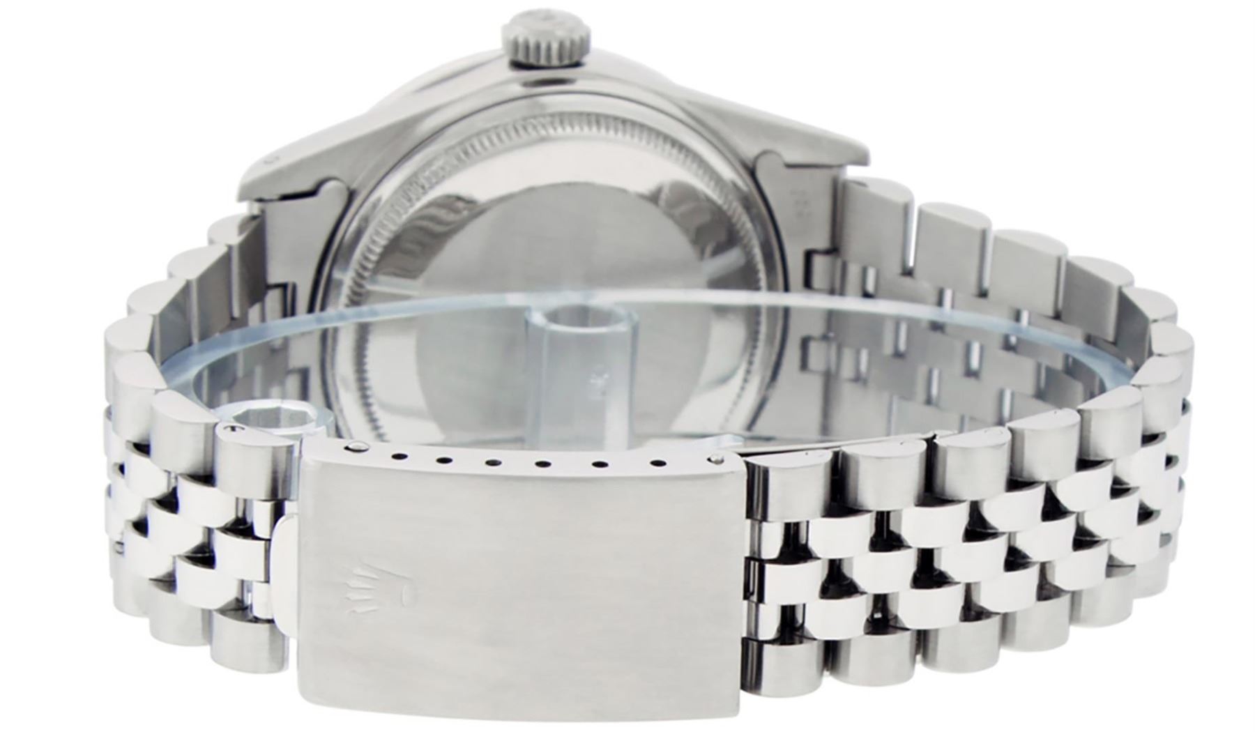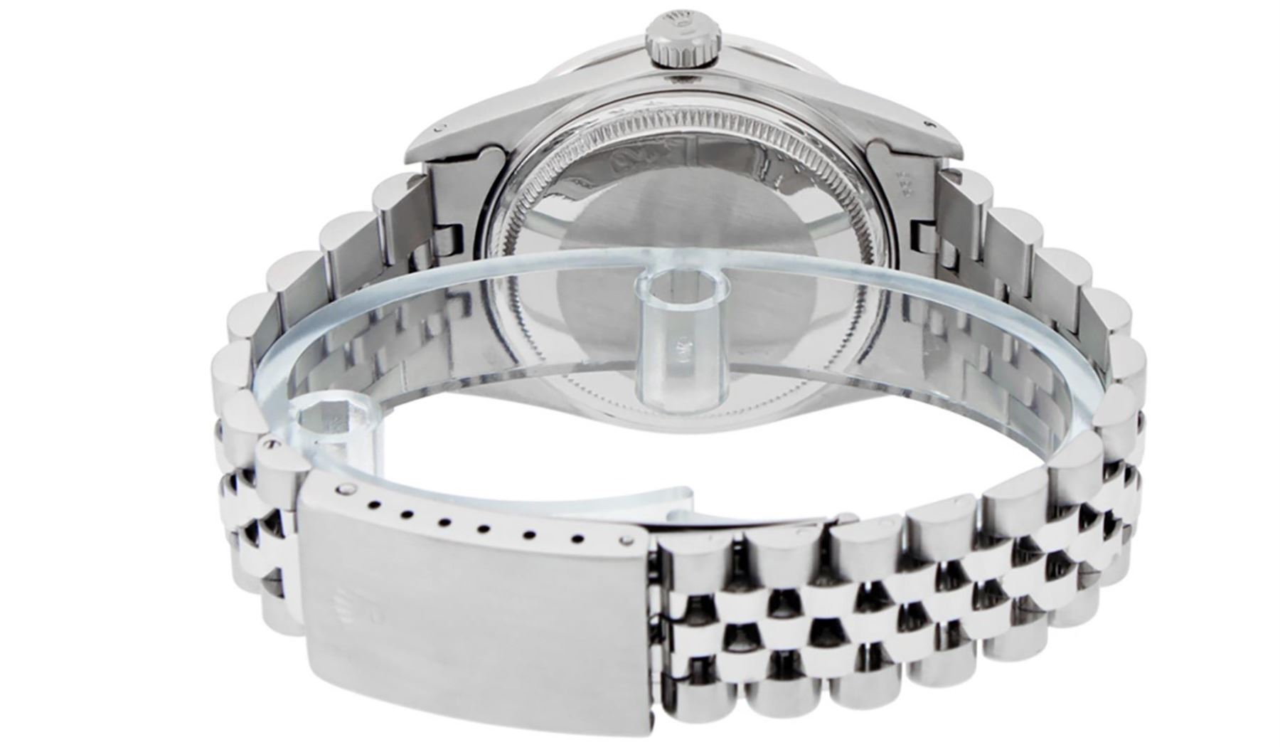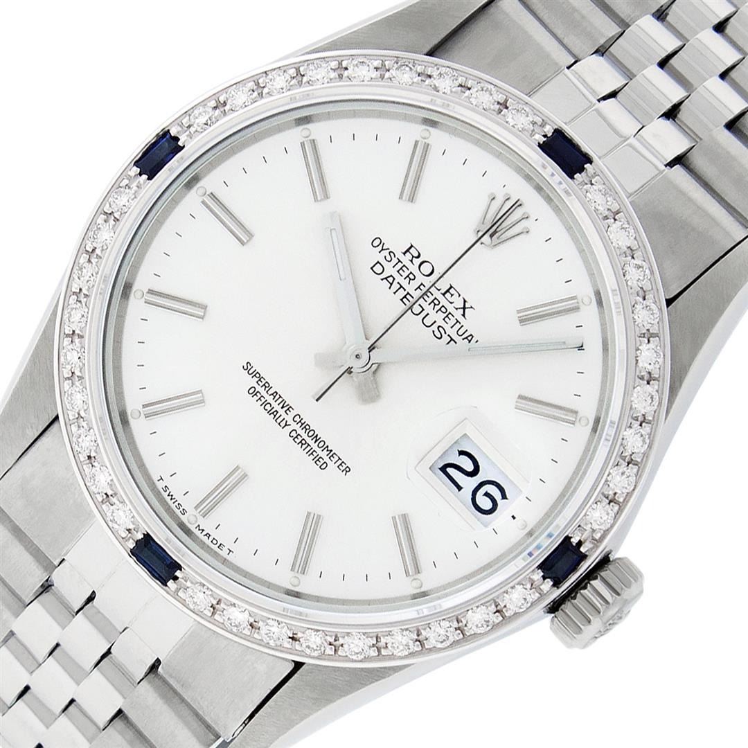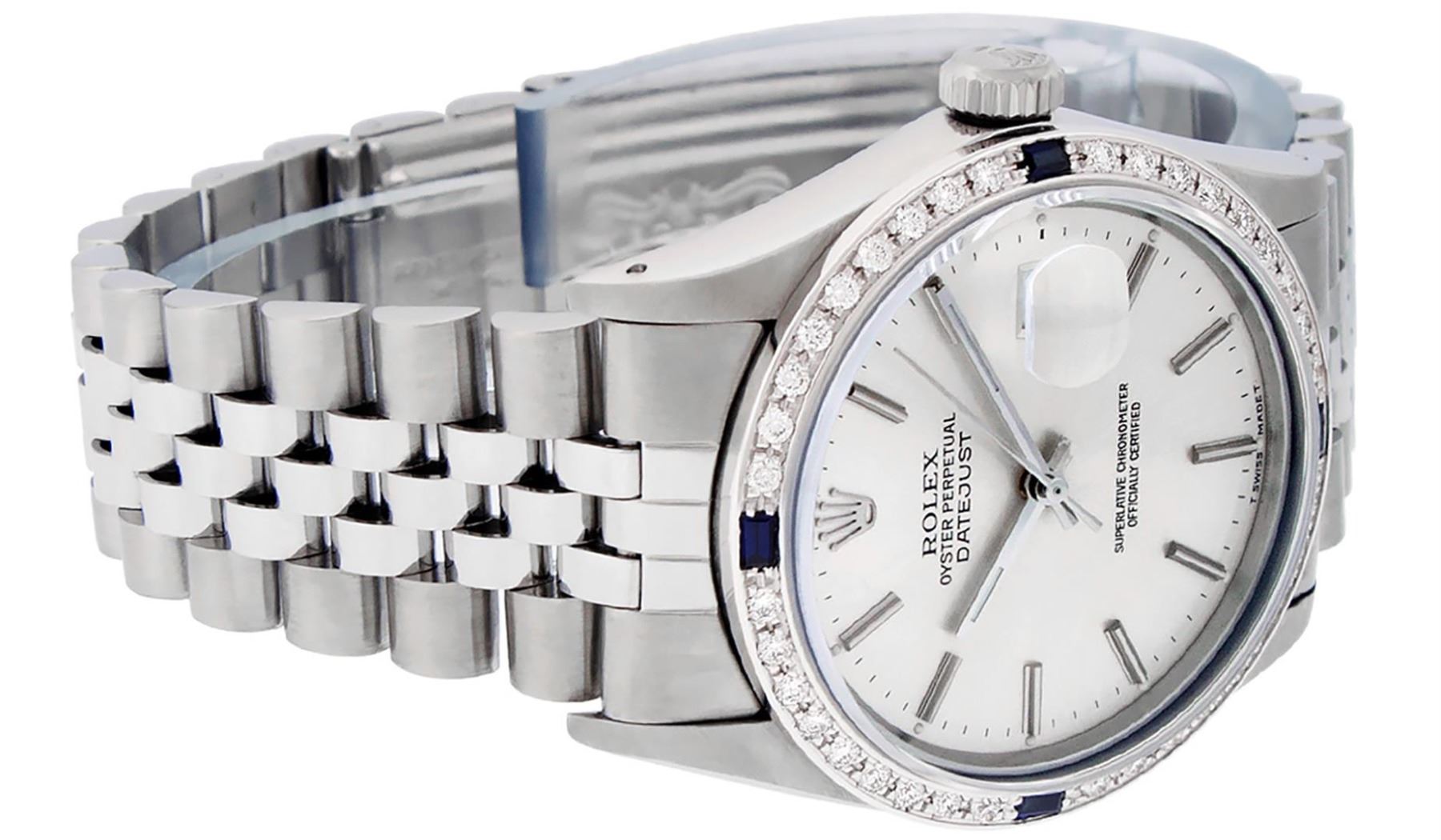 One Mens Pre Owned Stainless Steel Rolex Datejust Polished Bright with Satin Finish, This Watch Has Been Serviced & Electronically Tested, Stainless Steel Case: 36mm, Rolex Stainless Steel Crown, Custom Bezel: New 18K White Gold Sapphire Beadset Diamond Bezel, Diamond + Gem Count: 36 Diamonds + 4 Sapphires, Clarity: SI-VS, Color: G to H. Custom Crystal: New Sapphire With Date Window. Custom Hands: New Luminescent Hands. Rolex Movement: Automatic Winding Movement 3035. Rolex Dial: Silver Index With Dash Track & Lumi Dots. Date Window: 3 O'Clock Position Date Display, Quickset, Model: Datejust, Condition: G-6 Extra Fine. Rolex Bracelet: Stainless Steel Jubilee Band. Bracelet: 7.0 Inch Length, Adjustable. Standard Clasp, With Rolex Logo. This Watch Has Been Serviced Time Tested And Is In Excellent Condition It Is Free Of All Scratches And Dents.
