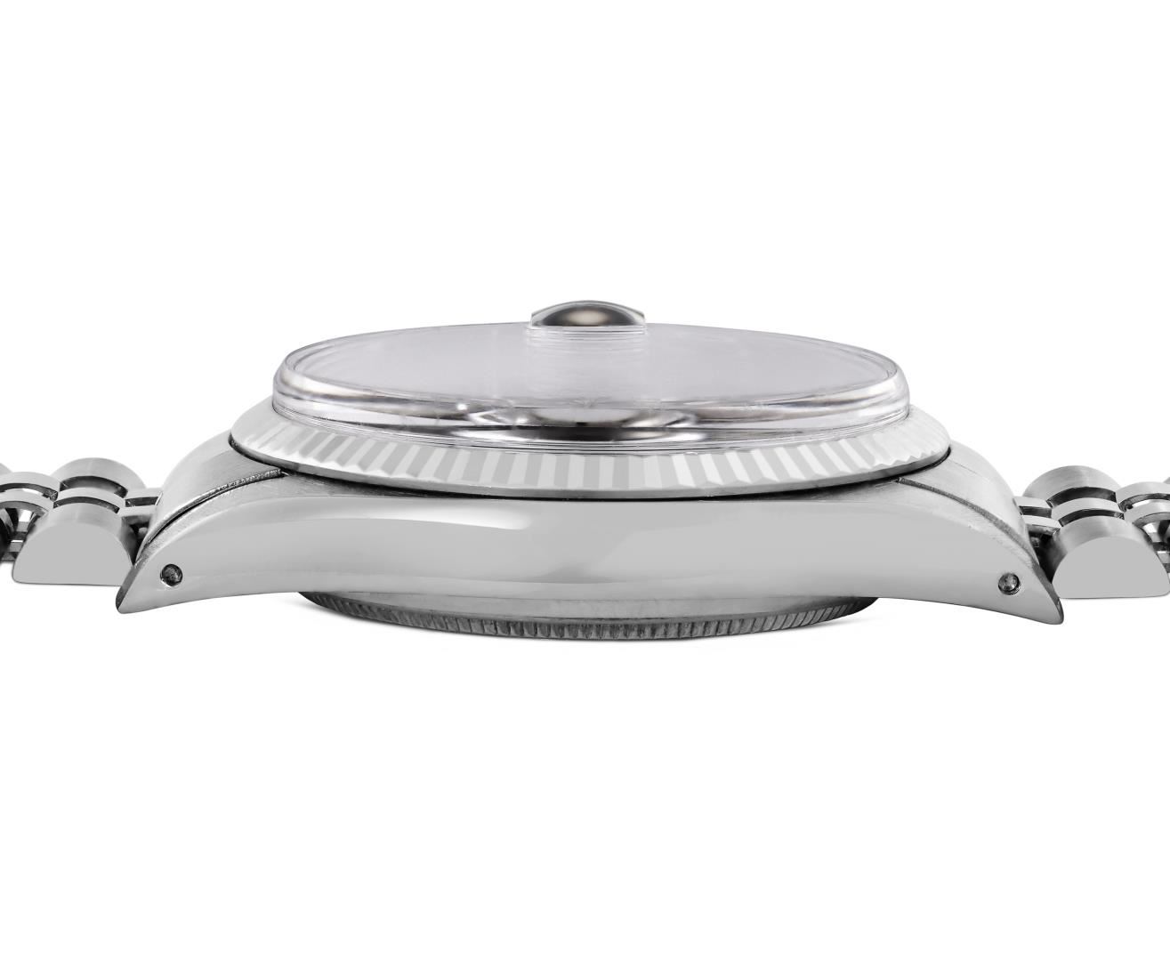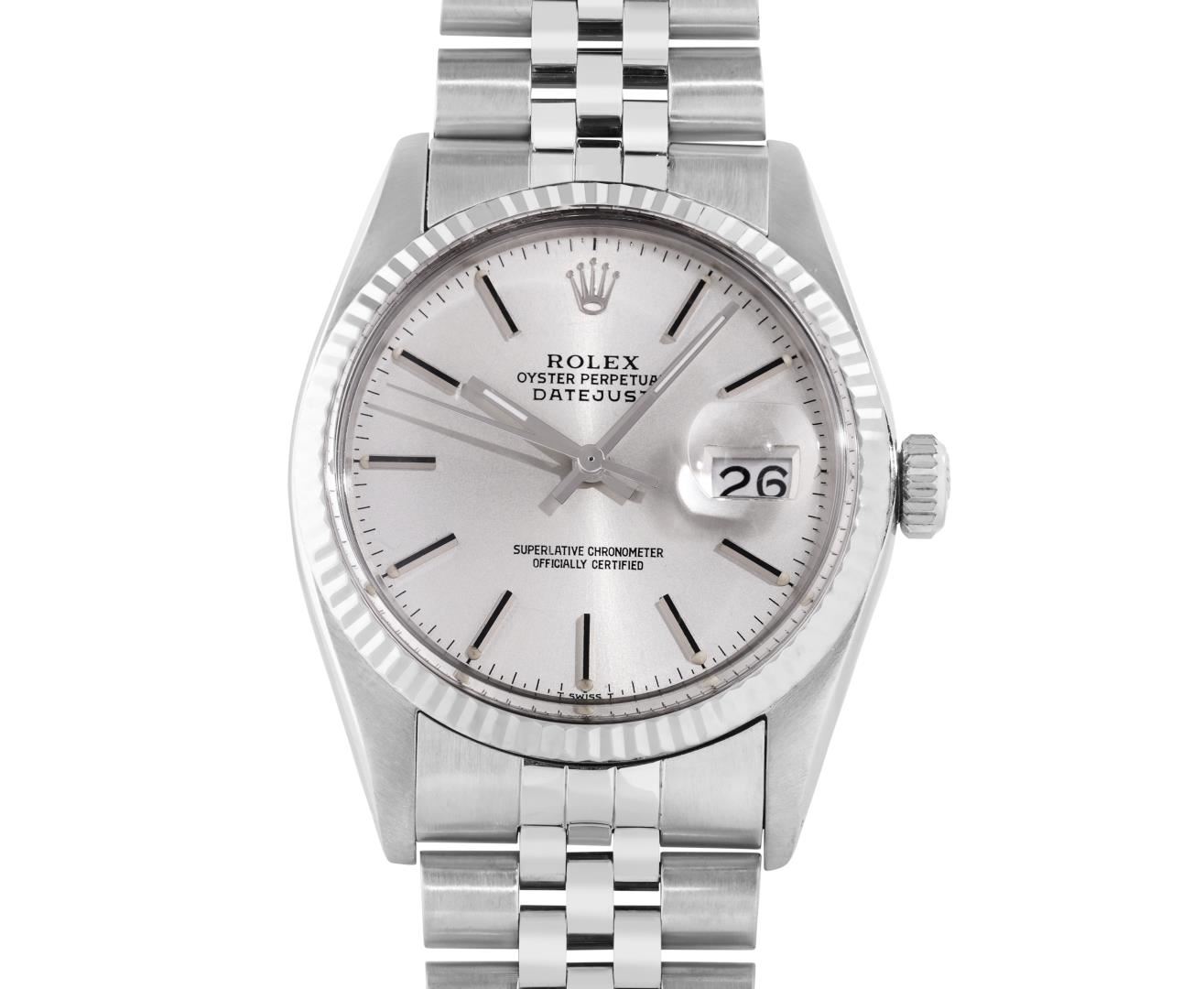 One Mens Pre Owned Rolex Stainless Steel Datejust Polished Bright with Satin Finish, Serviced And Electronically Tested, Rolex Stainless Steel Case: 36mm, Rolex Stainless Steel Crown, Rolex Bezel: 18K White Gold Fluted Bezel. Custom Crystal: New Acrylic Crystal With Magnifying Date Window. Rolex Movement: Automatic Winding Movement Caliber 3035. Rolex Dial: Silver Index With Dash Track and Lumi Dots. Hands: White Lumi Hands. Date Window: 3 O'Clock Position Date Display, Quickset, Model: Quickset Datejust. Condition: G-6 Extra Fine. Rolex Bracelet: Stainless Steel Jubilee Band. Bright Polish & Satin Finish. 7.0 Inch Length, Adjustable. Standard Clasp, With Rolex Logo. This Watch Has Been Serviced Time Tested And Is In Excellent Condition It Is Free Of All Scratches And Dents.