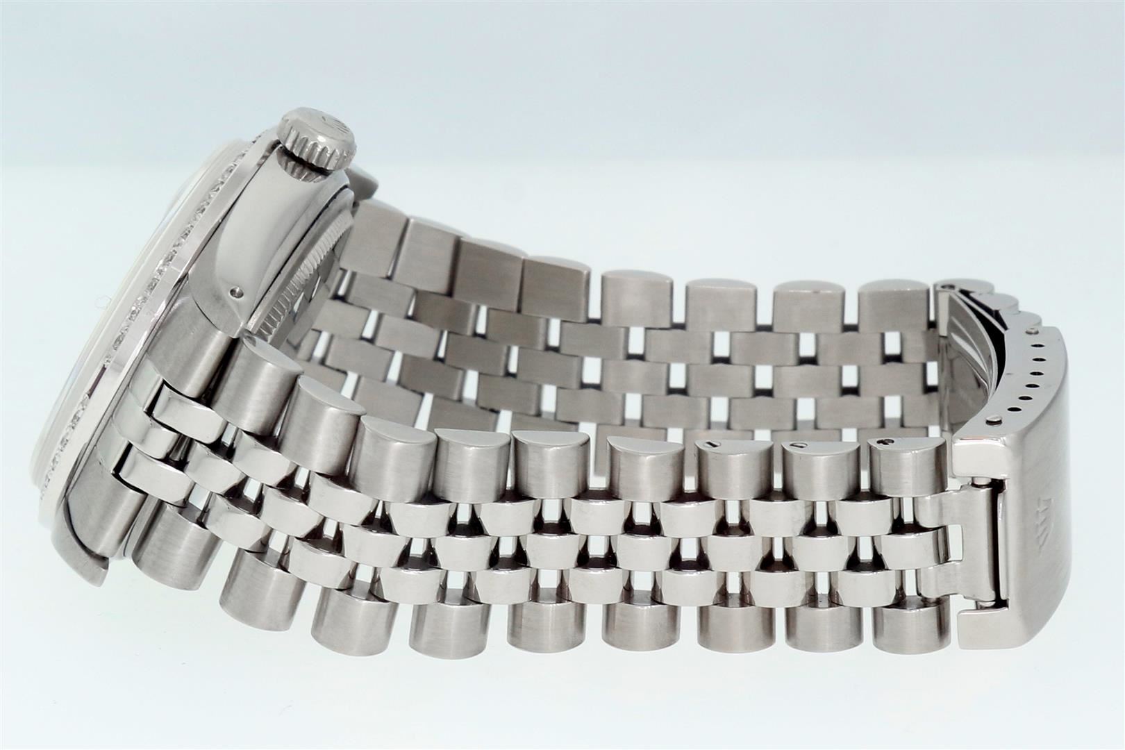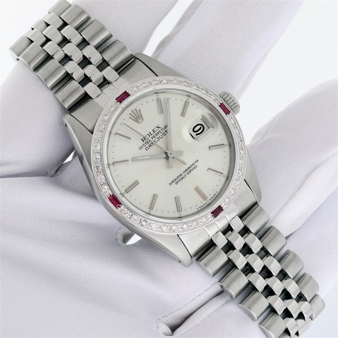 One Mens Pre Owned Rolex Datejust Polished Bright with Satin Finish, This Watch Has Been Serviced & Electronically Tested, Rolex Stainless Steel Case: 36mm, Rolex Stainless Steel Crown, Custom Bezel: New 18K White Gold Ruby Beadset Diamond Bezel, Diamond + Gem Count: 36 Diamonds + 4 Rubies, Clarity: SI-VS, Color: G to H. Custom Crystal: New Sapphire With Date Window. Custom Hands: New Luminescent Hands. Rolex Movement: Automatic Winding Movement. Rolex Dial: Silver Index Dial. Date Window: 3 O'Clock Position Date Display, Quickset, Model: Datejust, Condition: G-6 Extra Fine. Rolex Bracelet: Stainless Steel Jubilee Band. Bracelet: 7.0 Inch Length, Adjustable. Standard Clasp, With Rolex Logo. This Watch Has Been Serviced Time Tested And Is In Excellent Condition It Is Free Of All Scratches And Dents.