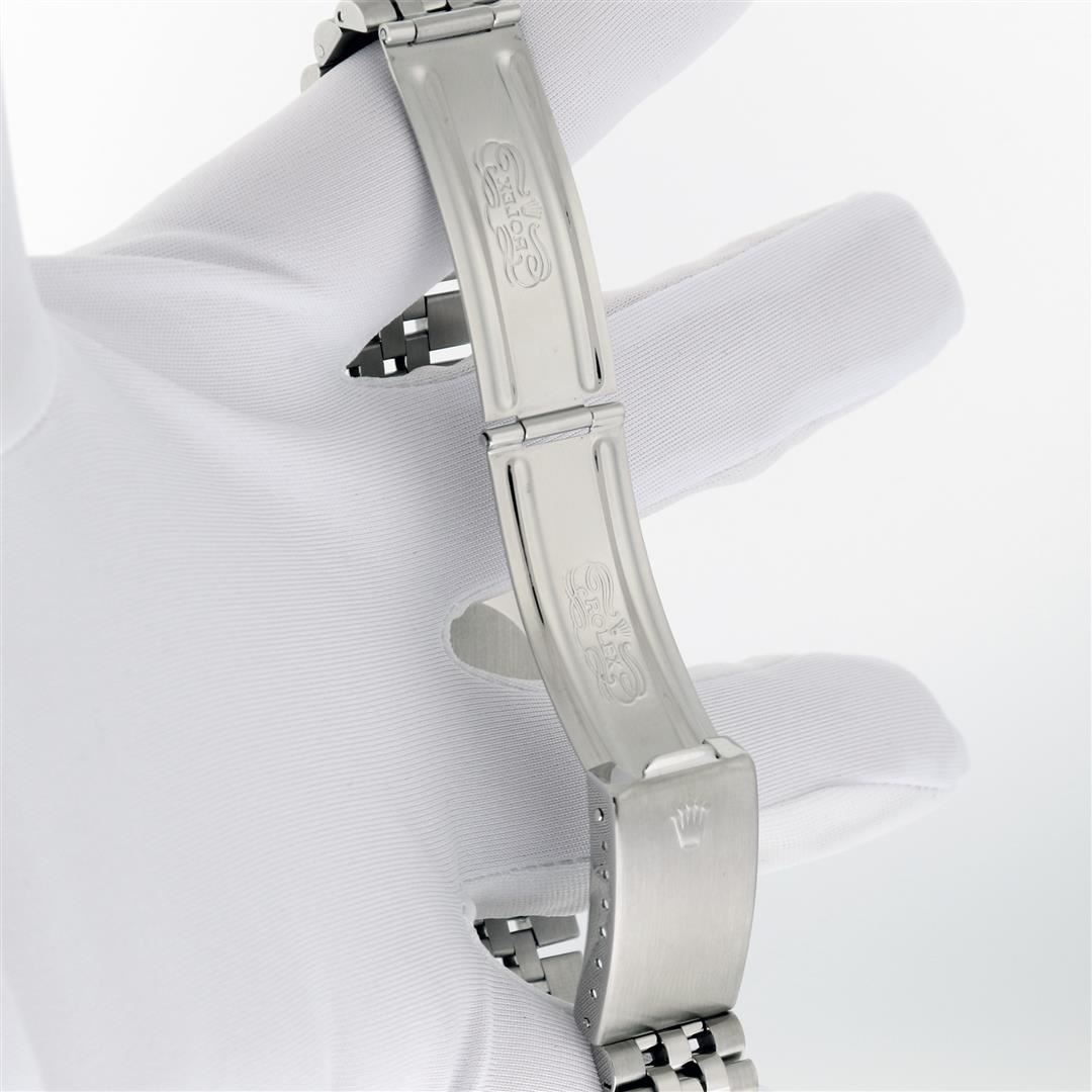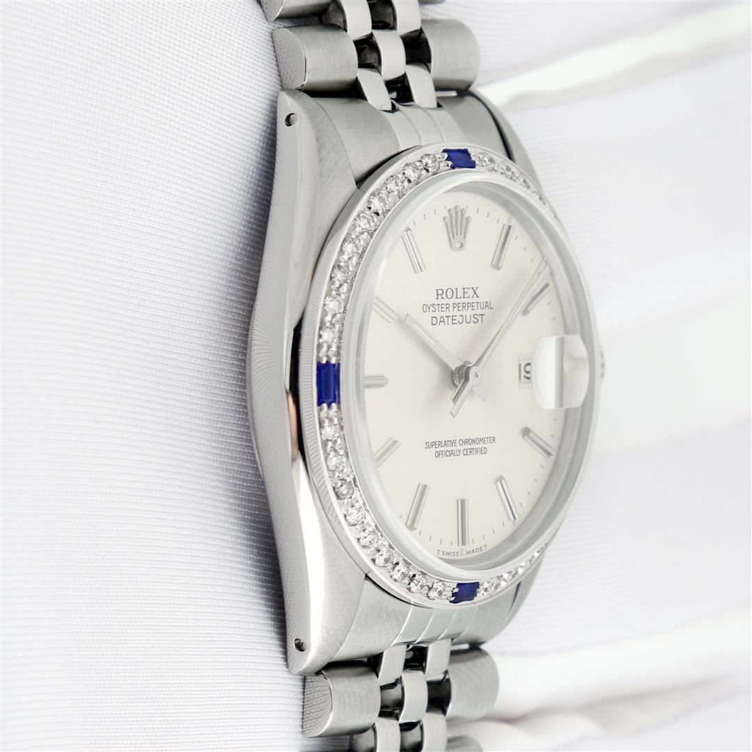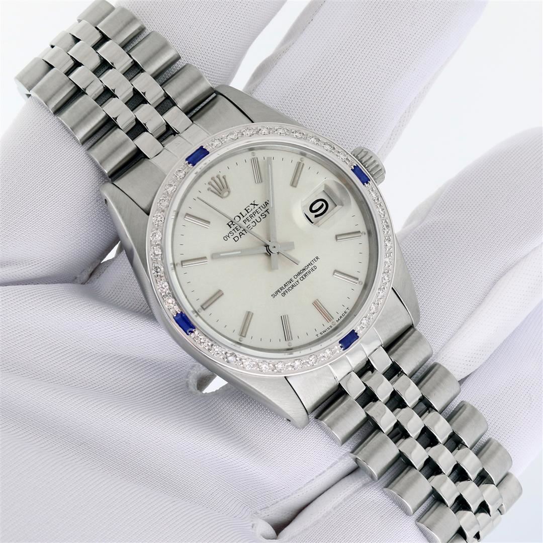 One Mens Pre Owned Rolex Datejust Polished Bright with Satin Finish, This Watch Has Been Serviced & Electronically Tested, Rolex Stainless Steel Case: 36mm, Rolex Stainless Steel Crown, Custom Bezel: New 18K White Gold Sapphire Bead-set Diamond Bezel, Diamond + Gem Count: 36 Diamonds + 4 Sapphires, Clarity: SI-VS, Color: G to H. Custom Crystal: New Sapphire With Date Window. Custom Hands: New Luminescent Hands. Rolex Movement: Automatic Winding Movement. Rolex Dial: Silver Index Dial With Dash Track. Date Window: 3 O'Clock Position Date Display, Quickset, Model: Datejust, Condition: G-6 Extra Fine. Rolex Bracelet: Stainless Steel Jubilee Band. Bracelet: 7.0 Inch Length, Adjustable. Standard Clasp, With Rolex Logo. This Watch Has Been Serviced Time Tested And Is In Excellent Condition It Is Free Of All Scratches And Dents.