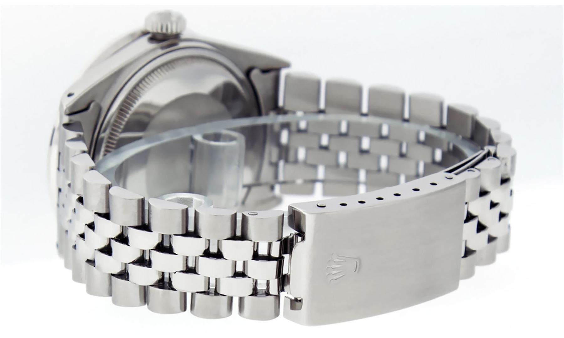 One Mens Pre Owned Stainless Steel Rolex Datejust Polished, Serviced & Electronically Tested, Rolex Stainless Steel Case: 36mm, Rolex Stainless Steel Crown, Custom Bezel: New 18K White Gold Bead set Diamond Bezel, Diamond Count: 46 Diamonds In Bezel, Total Weight 1.40 Carat, Clarity: SI-VS, Color: G to H. Custom Crystal: New Sapphire With Date Window. Custom Hands: New Luminescent Hands. Rolex Movement: Automatic Winding Movement. Custom Dial: Refinished To Green Vignette With Custom Added Diamonds, Diamond Count: 10 Diamonds in Dial, G To H In Color, Clarity: VS2. Date Window: 3 O'clock Position Date Display, Quickset, Model: Datejust. Condition: G-6 Extra Fine. Rolex Bracelet: Stainless Steel Jubilee Band. Bright Polish & Satin Finish. 7.0 Inch Length, Adjustable. Standard Clasp, With Rolex Logo. This Watch Has Been Serviced Time Tested And Is In Excellent Condition It Is Free Of All Scratches And Dents.