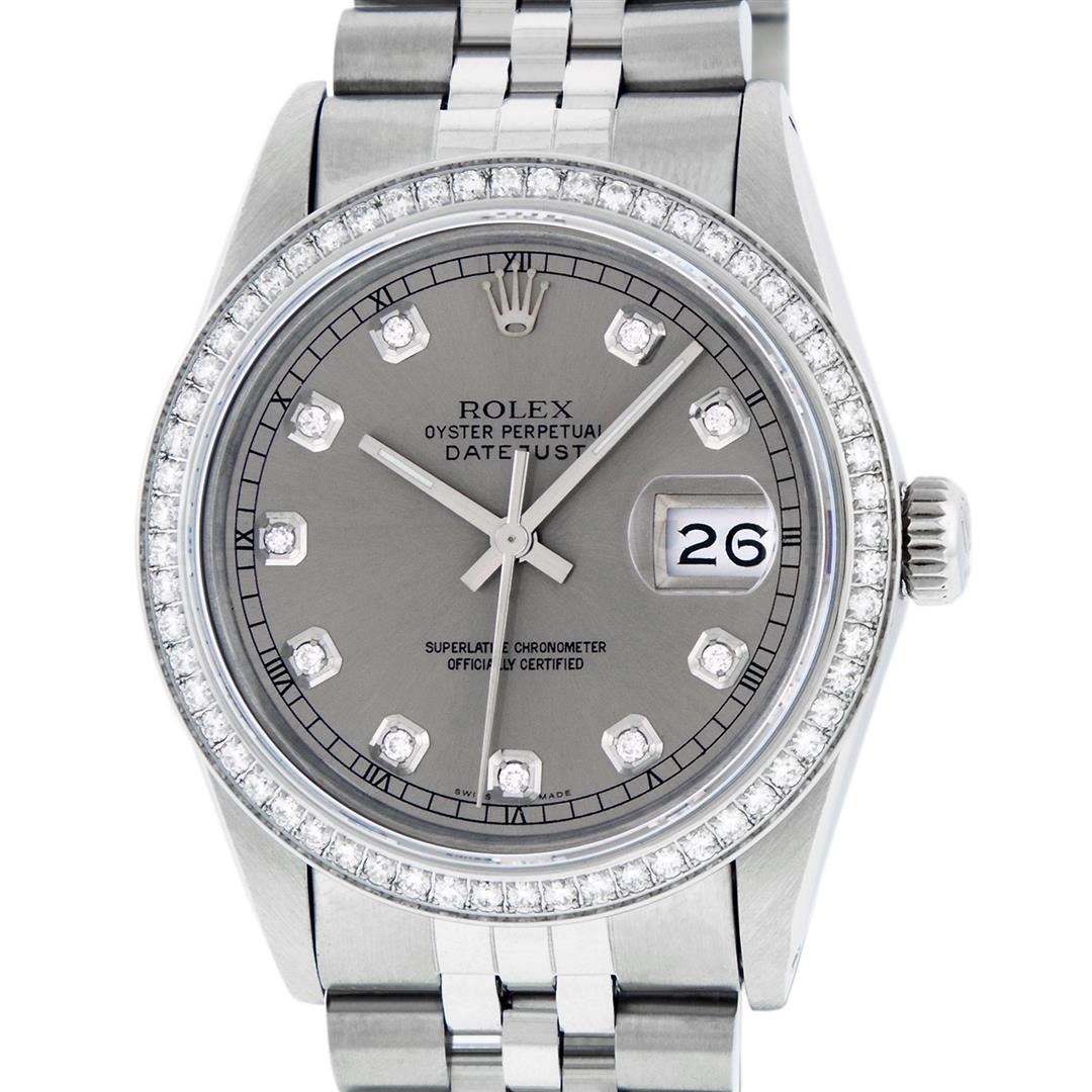 One Mens Rolex Stainless Steel Datejust Polished Bright with Satin Finish, This Watch Has Been Serviced & Electronically Tested, Stainless Steel Case: 36mm, Stainless Steel Crown, Custom Bezel: New Stainless Steel Beadset Diamond Bezel, Diamond Count: 54 Diamonds, Total Weight 1.00 Carat, Clarity: SI-VS, Color: G to H. Custom Crystal: New Synthetic Sapphire Cyclops Lens. Custom Hands: New Luminescent Hands. Movement: Automatic Winding Movement. Custom Dial: Slate Grey Diamond Dial, Diamond Count: 10 Diamonds In Dial, Color: G to H, Clarity: VS2-SI1. Date Window: 3 O'Clock Position Date Display, Quickset, Model: Datejust. Condition: G-6 Extra Fine. Bracelet: Stainless Steel Jubilee Band. Bright Polish & Satin Finish. 7.0 Inch Length, Adjustable. Standard Clasp, With Rolex Logo. This Watch Has Been Serviced Time Tested And Is In Excellent Condition It Is Free Of All Scratches And Dents.