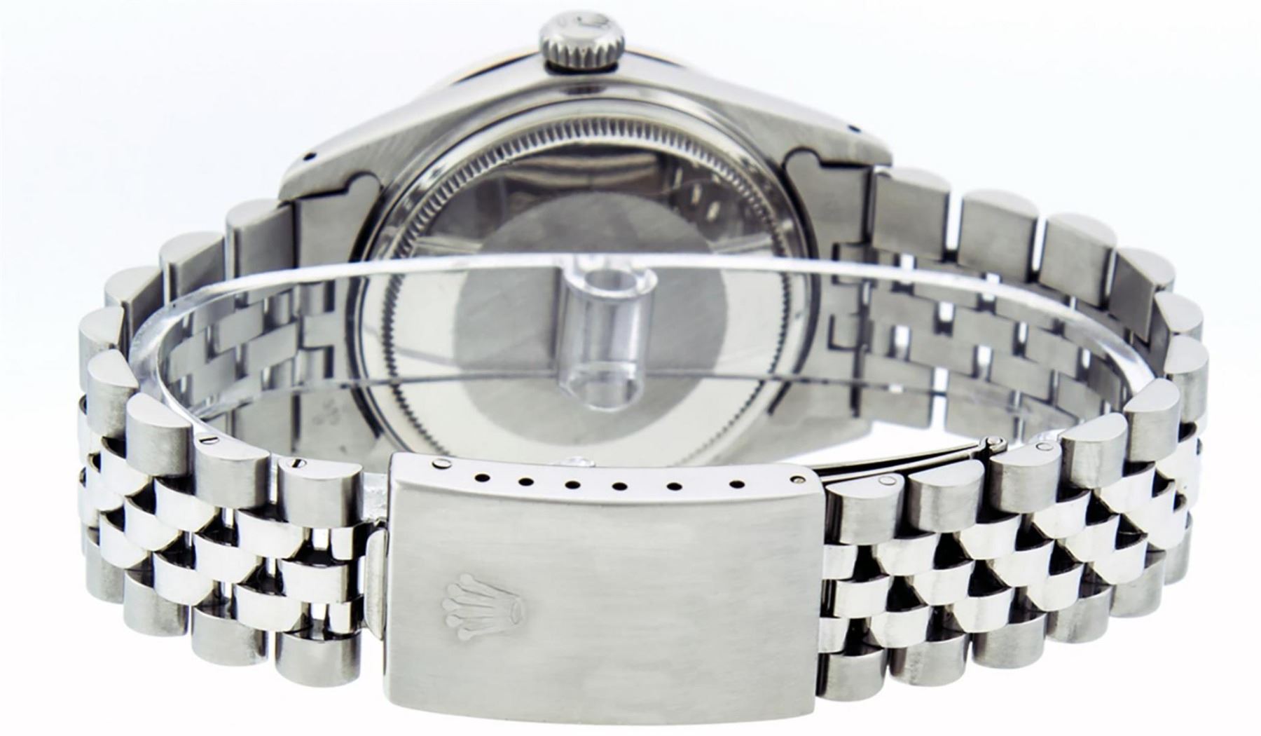 One Mens Pre Owned Stainless Steel Rolex Datejust Polished Bright with Satin Finish, Serviced & Electronically Tested, Rolex Stainless Steel Case: 36mm, Stainless Steel Crown, Rolex Bezel: 14K White Gold Fluted Bezel. Custom Crystal: New Acrylic Cyclops Lens. Custom Hands: New Luminescent Hands. Rolex Movement: Automatic Winding Movement. Custom Dial: Refinished to Slate Grey With Added Diamonds With Dash Tracks, Diamond Count: 10 Diamonds in Dial, G To H In Color, SI-VS Clarity. Date Window: 3 O'Clock Position Date Display, Quickset, Model: Datejust, Condition: G-6 Extra Fine. Rolex Bracelet: Stainless Steel Jubilee Band. Bright Polish & Satin Finish. 7.0 Inch Length, Adjustable. Standard Clasp, With Rolex Logo. Watch Has Been Serviced And Polished It Is Free Of All Scratches And Dents.