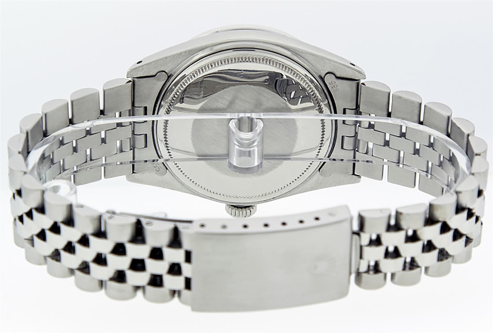 One Mens Pre Owned Stainless Steel Rolex Datejust Polished Bright with Satin Finish, Serviced & Electronically Tested, Rolex Stainless Steel Case: 36mm, Stainless Steel Crown, Rolex Bezel: 14K White Gold Fluted Bezel. Custom Crystal: New Acrylic Cyclops Lens. Custom Hands: New Luminescent Hands. Rolex Movement: Automatic Winding Movement. Custom Dial: Refinished to Slate Grey With Added Diamonds With Dash Tracks, Diamond Count: 10 Diamonds in Dial, G To H In Color, SI-VS Clarity. Date Window: 3 O'Clock Position Date Display, Quickset, Model: Datejust, Condition: G-6 Extra Fine. Rolex Bracelet: Stainless Steel Jubilee Band. Bright Polish & Satin Finish. 7.0 Inch Length, Adjustable. Standard Clasp, With Rolex Logo. Watch Has Been Serviced And Polished It Is Free Of All Scratches And Dents.