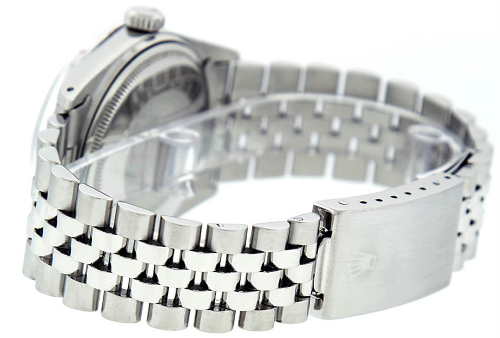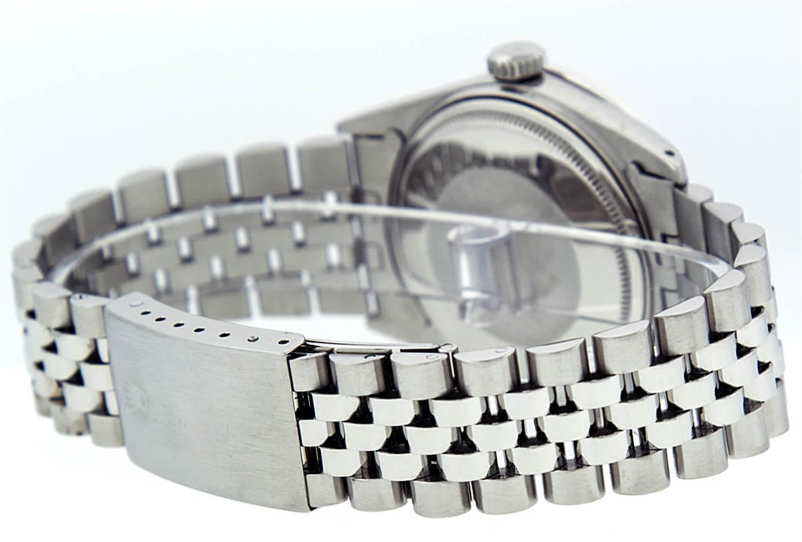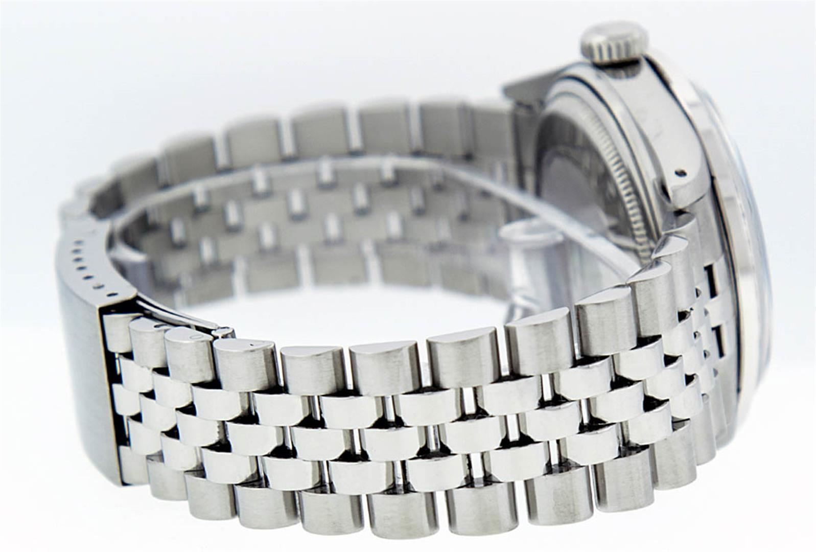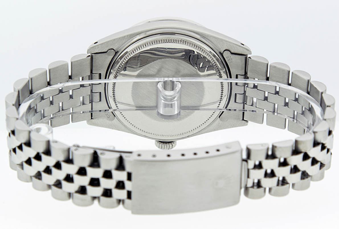 One Mens Rolex Datejust Polished, Serviced & Electronically Tested, Stainless Steel Case:36mm, Stainless Steel Crown, Custom Bezel: 18K White Beadset Diamond Bezel, Diamond Count: 44 Diamonds . Total Weight 1.00 Carat, Clarity: SI-VS, Color: G to H. Custom Crystal: Synthetic Sapphire Cyclops Lens. Movement: Automatic Winding Movement Caliber 3035. Custom Dial: Slate Grey With Diamond Hour Markers, 10 Diamond Dial. G To H In Color, Clarity: SI-VS. Date Window: 3 O'Clock Position Date Display, Quickset, Model: Datejust. Condition: G-6 Extra Fine. Bracelet: Stainless Steel Jubilee. Bright Polish & Satin Finish. 7.0 Inch Length, Adjustable. Standard Clasp, With Rolex Logo.