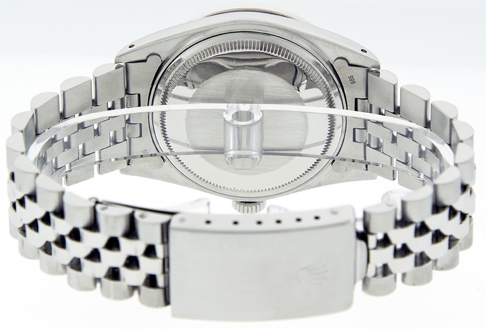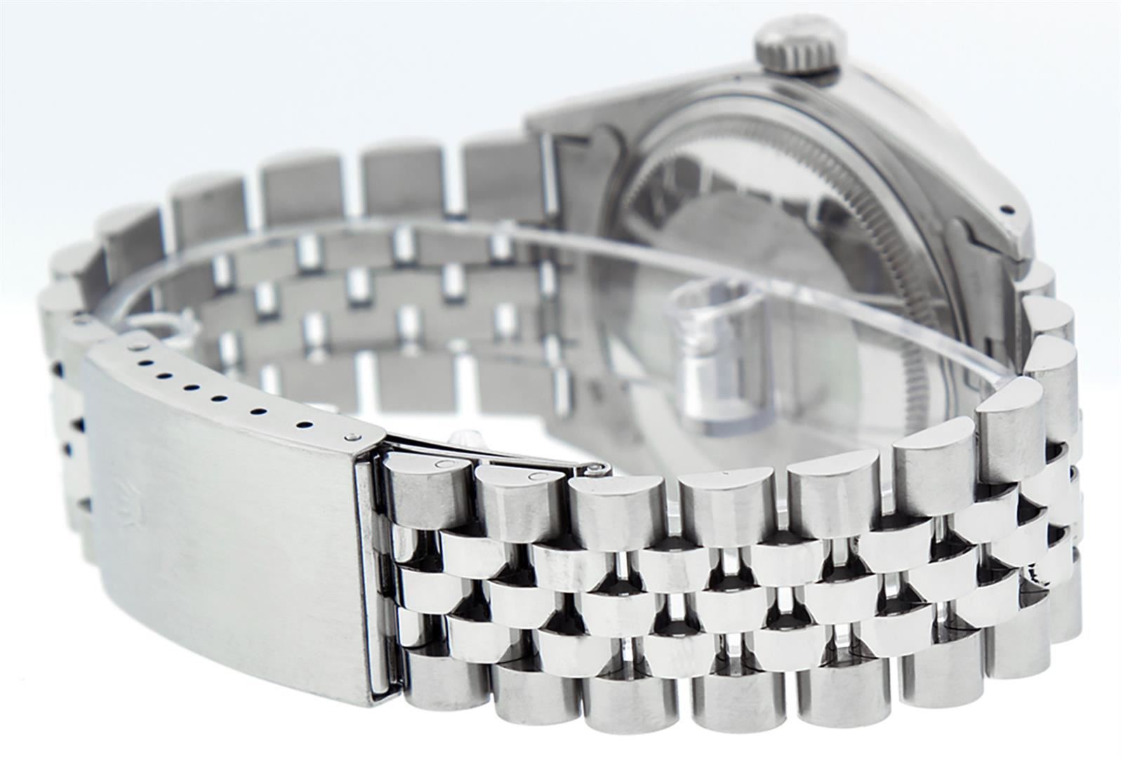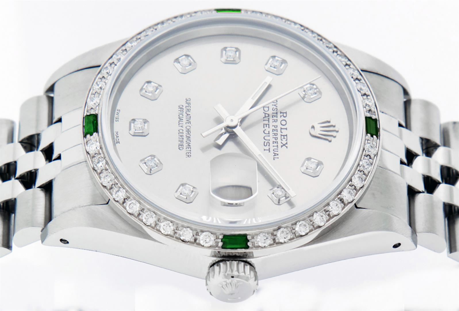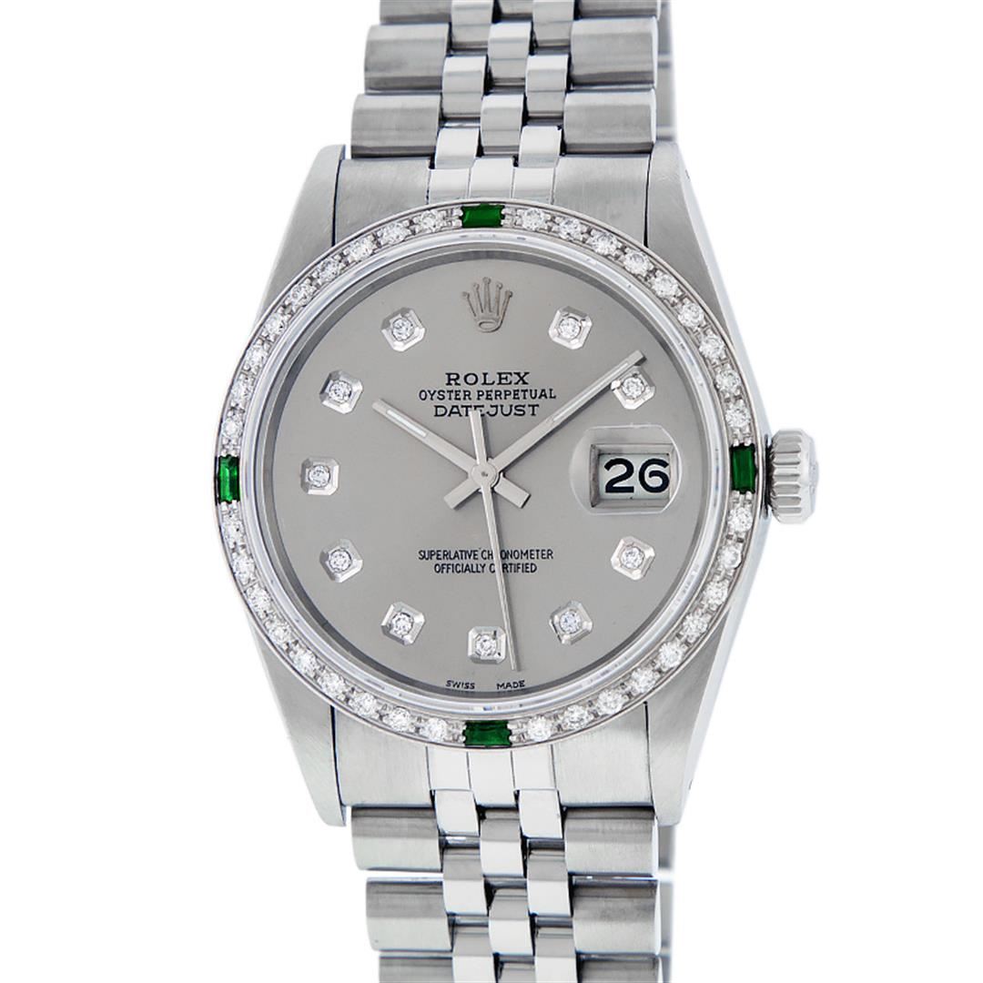 One Mens Pre Owned Stainless Steel Rolex Datejust Polished, Serviced & Electronically Tested, Rolex Stainless Steel Case: 36mm, Rolex Stainless Steel Crown, Custom Bezel: New 18K White Gold Emerald Beadset Diamond Bezel, Diamond + Gem Count: 36 Diamonds + 4 Emeralds, Clarity: SI-VS, Color: G to H. Custom Crystal: New Sapphire With Magnified Date. Custom Hands: New Luminescent Hands. Rolex Movement: Automatic Winding Movement. Custom Dial: Refinished To Slate Grey With Custom Added Diamonds, 10 Diamonds in Dial, G To H In Color, Clarity: SI-VS. Date Window: 3 O'Clock Position Date Display, Quickset, Model: Datejust. Condition: G-6 Extra Fine. Rolex Bracelet: Stainless Steel Jubilee. Bright Polish & Satin Finish. 7.0 Inch Length, Adjustable. Standard Clasp, With Rolex Logo. This Watch Has Been Serviced Time Tested And Is In Excellent Condition It Is Free Of All Scratches And Dents.