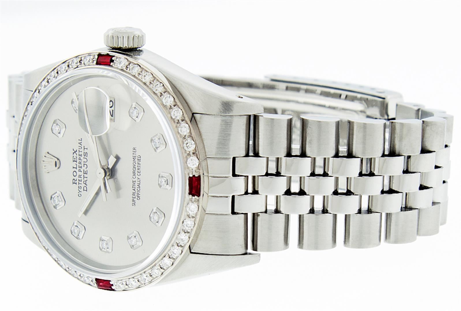 One Mens Rolex Sapphire Quickset Datejust Polished Bright with Satin Finish, Serviced & Electronically Tested, Stainless Steel Case:36mm, Stainless Steel Crown, Custom Bezel: 18K White Gold Ruby Beadset Diamond Bezel, Diamond + Gem Count: 36 Diamonds + 4 Rubys Total Weight 1.00 Carat, Clarity: Si-VS, Color: G to H. Custom Crystal: Synthetic Sapphire Cyclops Lens. Movement: Automatic Winding Movement Caliber 3135. Custom Dial: Slate Grey Dial Set With Diamond Hour Markers, 10 Diamond in Dial G To H In Color, Si-VS Clarity. Date Window: 3 O'Clock Position Date Display, Quickset, Model: 16234 Sapphire Datejust. Condition: G-6 Extra Fine. Bracelet:Stainless Steel Rolex Jubilee Band. Bright Polish & Satin Finish. 7.0 Inch Length, Adjustable. Standard Clasp, With Rolex Logo.