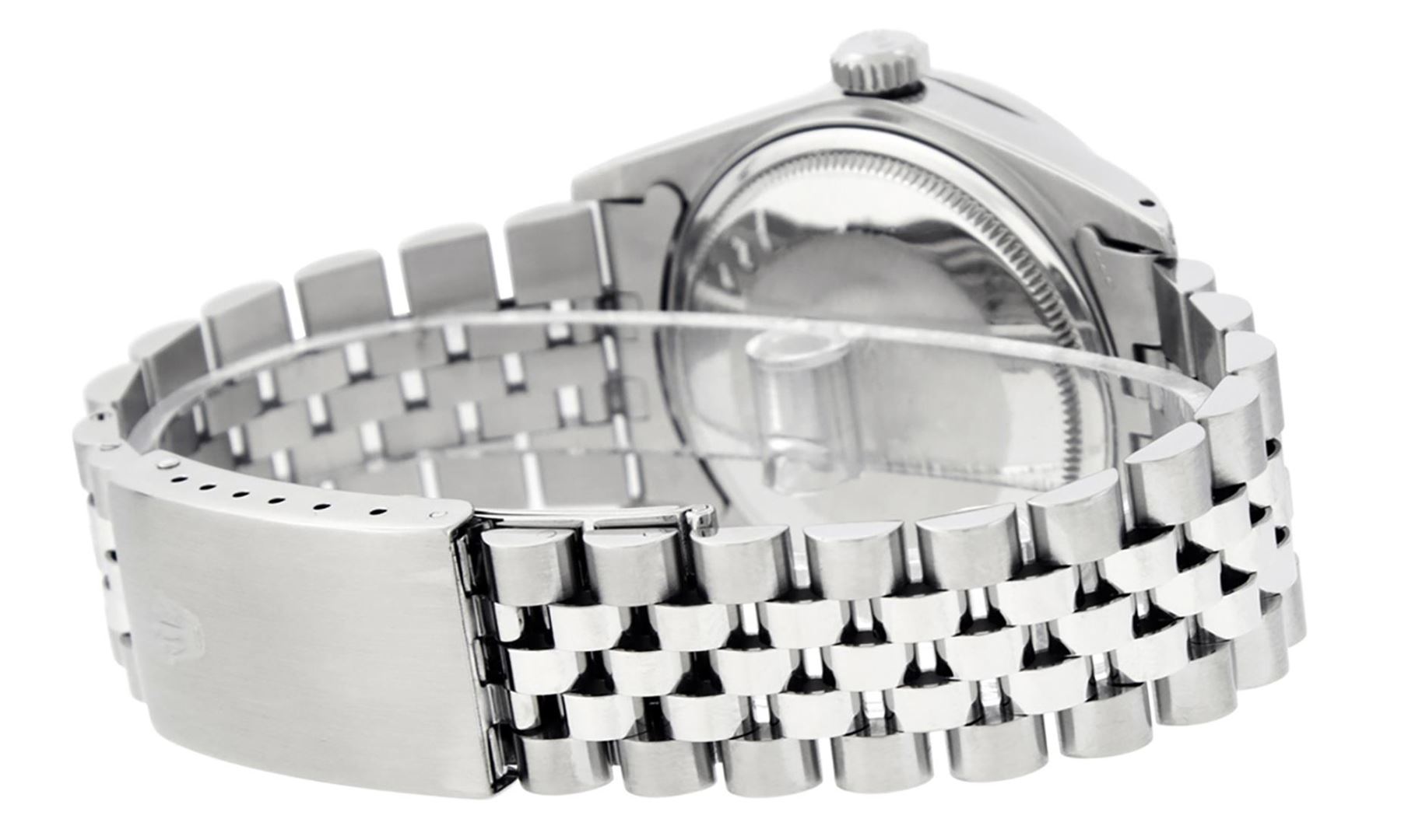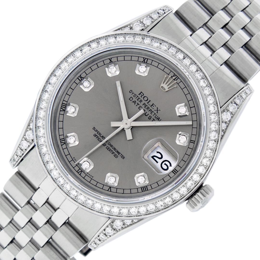 One Mens Pre Owned Stainless Steel Rolex Datejust Polished Bright with Satin Finish, Serviced And Electronically Tested, Rolex Stainless Steel Case: 36mm, Custom Diamonds On Lugs: 28 Added Diamonds On Lugs. Rolex Stainless Steel Crown, Custom Bezel: New Stainless Steel Beadset Diamond Bezel, Diamond Count: 54 Diamonds On Bezel. Custom Crystal: New Sapphire With Date Window. Custom Hands: New Luminescent Hands. Rolex Movement: Automatic Winding Movement 3035. Custom Dial: Custom Grey Dial With Added Diamonds, Diamond Count: 10 Diamonds On Dial With Roman Track. Date Window: 3 O'Clock Position Date Display, Quickset, Model: Datejust Condition: G-6 Extra Fine. Rolex Bracelet: Stainless Steel Jubilee Band. Bright Polish And Satin Finish. 7.0 Inch Length, Adjustable. Standard Clasp, With Rolex Logo. This Watch Has Been Serviced And Polished And Its Free Of All Dents And Scratches.