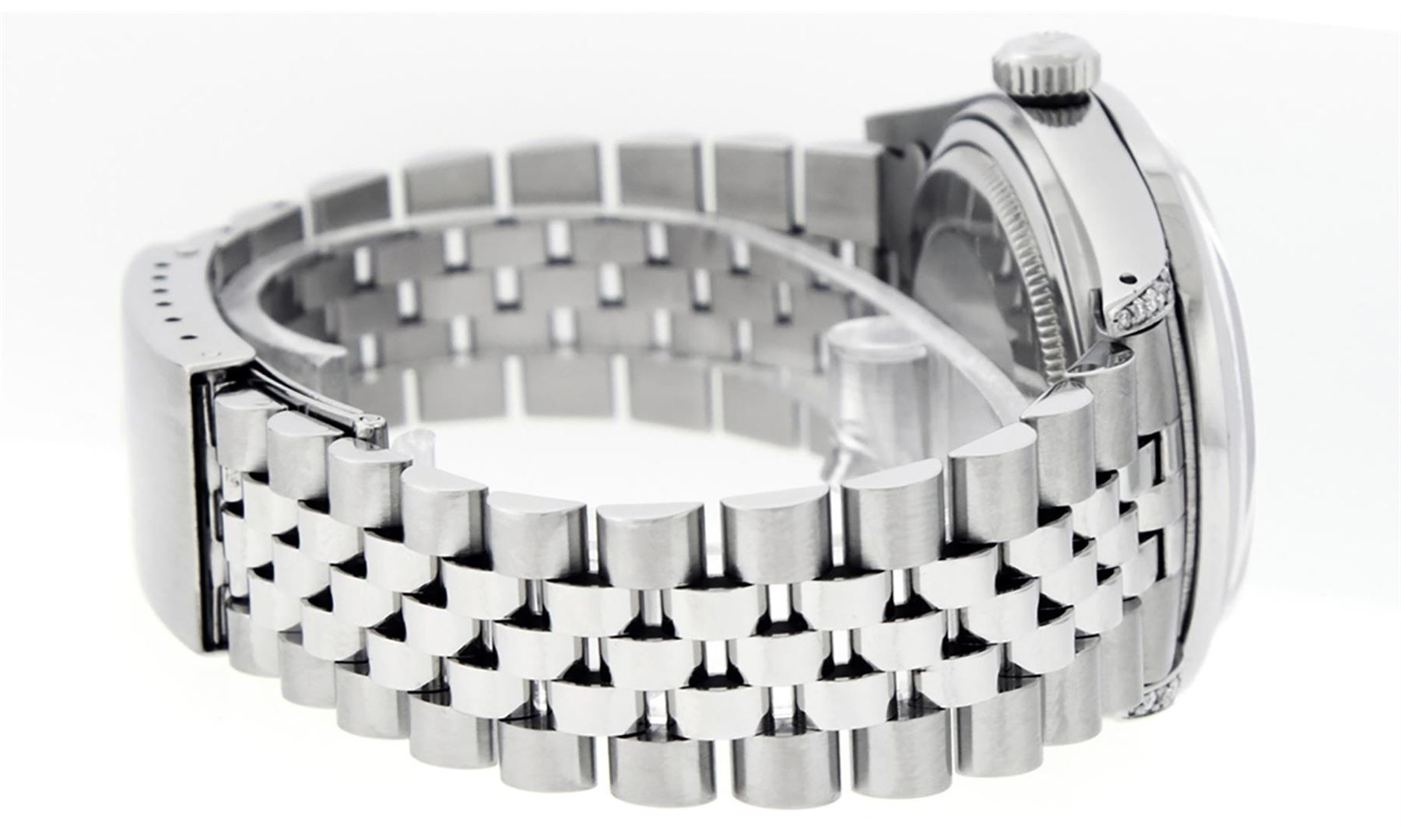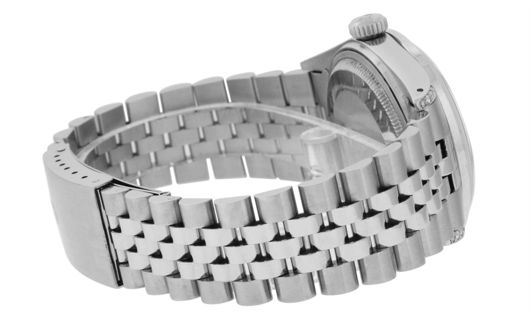 One Mens Pre Owned Rolex Datejust Polished Bright with Satin Finish, Serviced & Electronically Tested, Rolex Stainless Steel Case: 36mm, Custom Diamonds On Lugs: 28 Diamonds On Lugs, Color: G to H, Clarity: SI-VS. Rolex Stainless Steel Crown, Custom Bezel: New Stainless Steel Beadset Diamond Bezel, Diamond Count: 54 Diamonds On Bezel, Clarity: SI-VS, Color: G to H. Custom Crystal: New Sapphire With Date Window. Custom Hands: New Luminescent Hands. Rolex Movement: Automatic Winding Movement. Custom Dial: Refinished Slate Grey With Custom Added Diamonds, Diamond Count: 10 Diamonds In Dial With Roman Track, Diamond Color: G To H In Color, Clarity: VS. Date Window: 3 O'Clock Position Date Display, Quickset, Model: Datejust Condition: G-6 Extra Fine. Rolex Bracelet: Stainless Steel Jubilee Band. Bright Polish & Satin Finish. 7.0 Inch Length, Adjustable. Standard Clasp, With Rolex Logo. This Watch Has Been Serviced And Polished And Its Free Of All Dents And Scratches.
