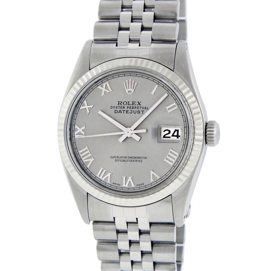 One Mens Rolex Datejust Polished, Serviced & Electronically Tested, Stainless Steel Case:36mm, Stainless Steel Crown, Bezel: 14K White Gold Fluted Bezel. Custom Crystal: Acrylic Cyclops Lens. Movement: Automatic Winding Movement Caliber 3035. Custom Dial: Slate Grey Roman With Square Track. Date Window: 3 O'Clock Position Date Display, Quickset, Model: Datejust, Condition: G-6 Extra Fine. Bracelet: Stainless Steel Jubilee. Bright Polish & Satin Finish. 7.0 Inch Length, Adjustable. Standard Clasp, With Rolex Logo. This watch has been serviced and polished and its free of all dents and scratches.