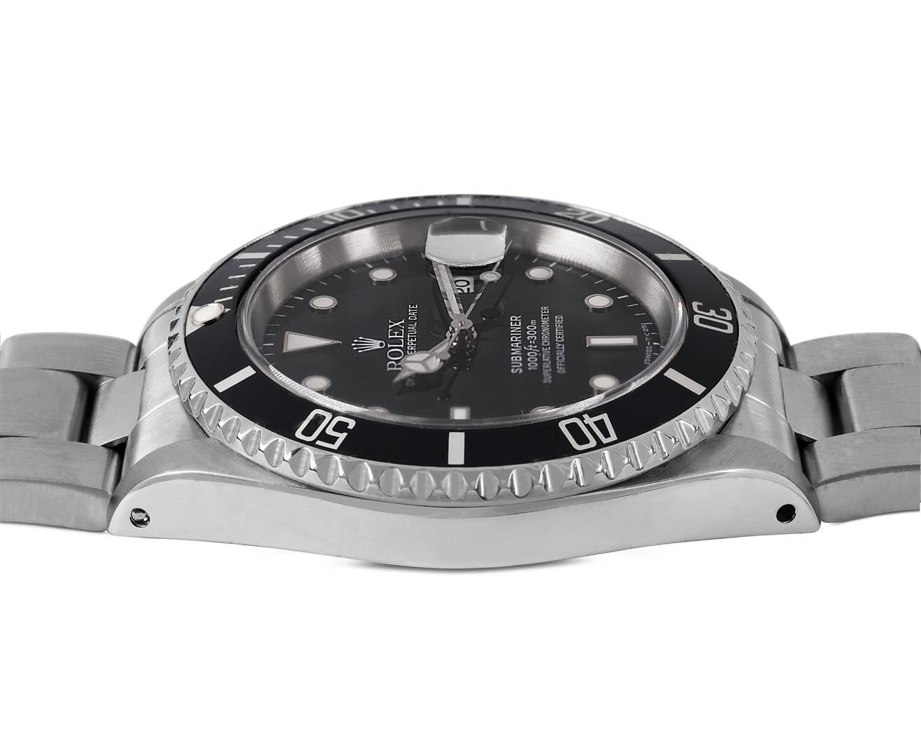 One Mens Pre Owned Stainless Rolex Submariner With Date Polished, Serviced & Electronically Tested, Rolex Stainless Steel Case: 40mm, Rolex Stainless Steel Crown, Rolex Bezel: Stainless Steel Rotatable Bezel With Black Insert. Crystal: Sapphire With Magnified Date Window. Rolex Movement: Automatic Winding Movement Caliber 3135. Rolex Dial: Black Submariner Dial with Luminous Index Hour Markers And Dash Track. Date Window: 3 O'Clock Position Date Display, Model: Date Submariner, Quickset, Condition: G-6 Extra Fine. Rolex Bracelet: Stainless Steel Oyster Band. Bright Polish & Satin Finish. 7.0 Inch Length, Adjustable. Fold Clasp, With Rolex Logo. This Watch Comes With A Rolex Box.