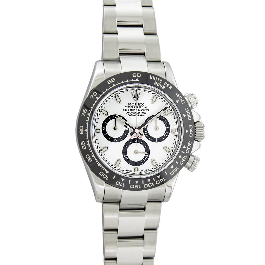 One Mens Pre Owned Rolex Stainless Steel Ceramic Daytona Polished Bright with Satin Finish, This Watch Has Been Serviced & Electronically Tested, Rolex Stainless Steel Case: 40mm, Rolex Bezel: Stainless Steel Bezel With Black Ceramic Insert. Rolex Crystal: Sapphire. Rolex Hands: Daytona Hands. Rolex Movement: Automatic Movement 4130. Rolex Dial: White Daytona Dial. Functions: Time With Running Seconds, 30 Minute Chronograph, 12 Hour Chronograph. Model: 116500 Ceramic Daytona. Condition: G-6 Extra Fine. Rolex Bracelet: Stainless Steel Oyster Band. Bright Polish & Satin Finish. 7.00 Inch Length, Adjustable. Flip Lock Clasp with Rolex Logo. This Watch Has Been Serviced Time Tested And Is In Excellent Condition It Is Free Of All Scratches And Dents. This Watch Comes With A Rolex Box.