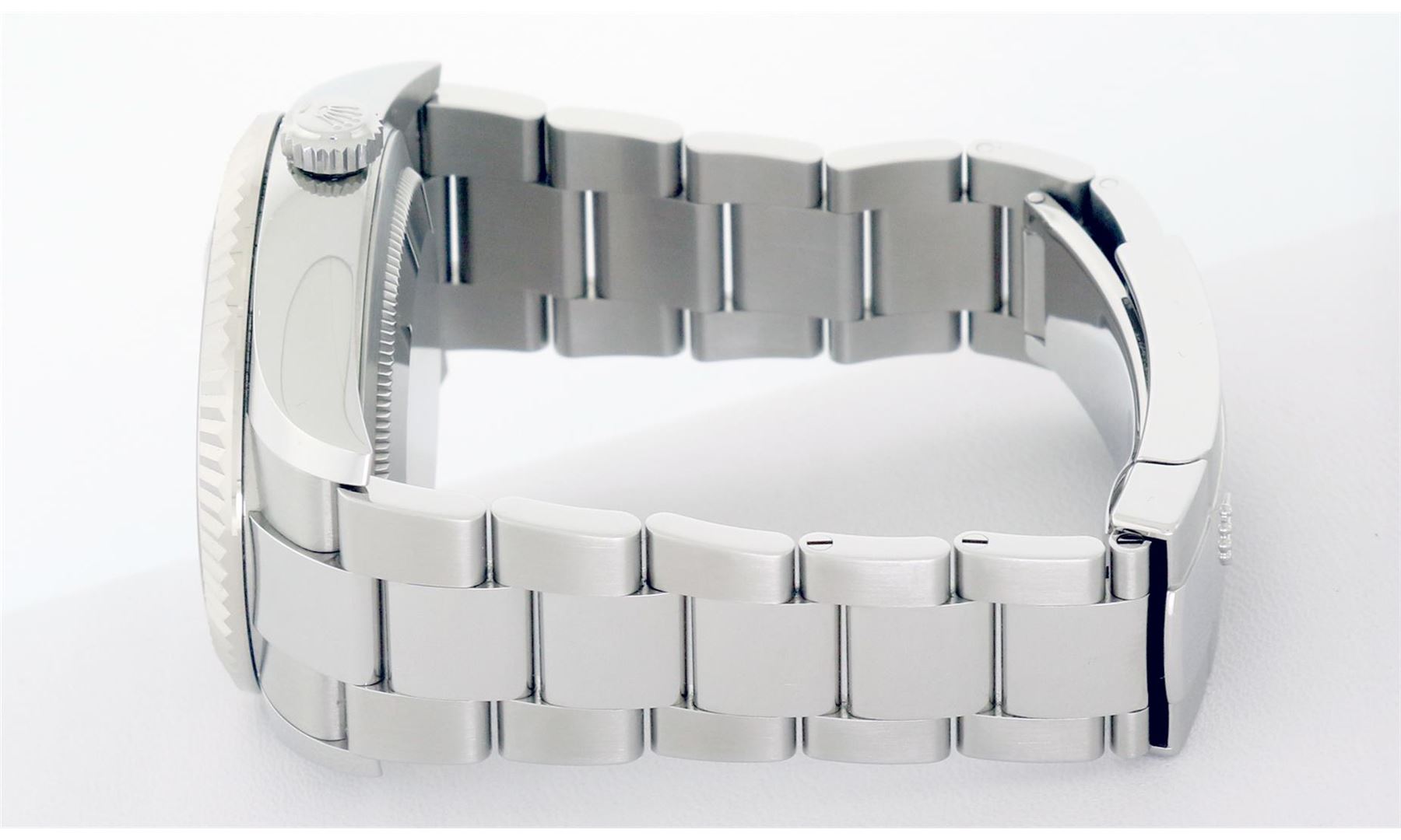 One Mens Pre Owned Stainless Steel Rolex Sky Dweller With Date Polished, Serviced & Electronically Tested, Rolex Stainless Steel Case: 42mm, Rolex Stainless Steel Crown, Rolex Bezel: 18K White Gold Rotatable Fluted Bezel. Rolex Crystal: Sapphire With Magnified Date Window. Rolex Movement: Automatic Winding Movement Caliber 9001. Rolex Dial: Rolex White Sky Dweller Dial with Luminous Index Hour Markers. Date Window: 3 O'Clock Position Date Display, Model: Sky Dweller, Quickset, Month Calendar Feature, Dual Time. Condition: G-6 Extra Fine. Rolex Bracelet: Stainless Steel Oyster Band. Bright Polish & Satin Finish. 7.25 Inch Length, Adjustable. Standard Clasp, With Rolex Logo. This Watch Has Been Serviced Time Tested And Is In Excellent Condition It Is Free Of All Scratches And Dents. This Watch Comes With A Rolex Box, Rolex Papers, And Rolex Booklet.