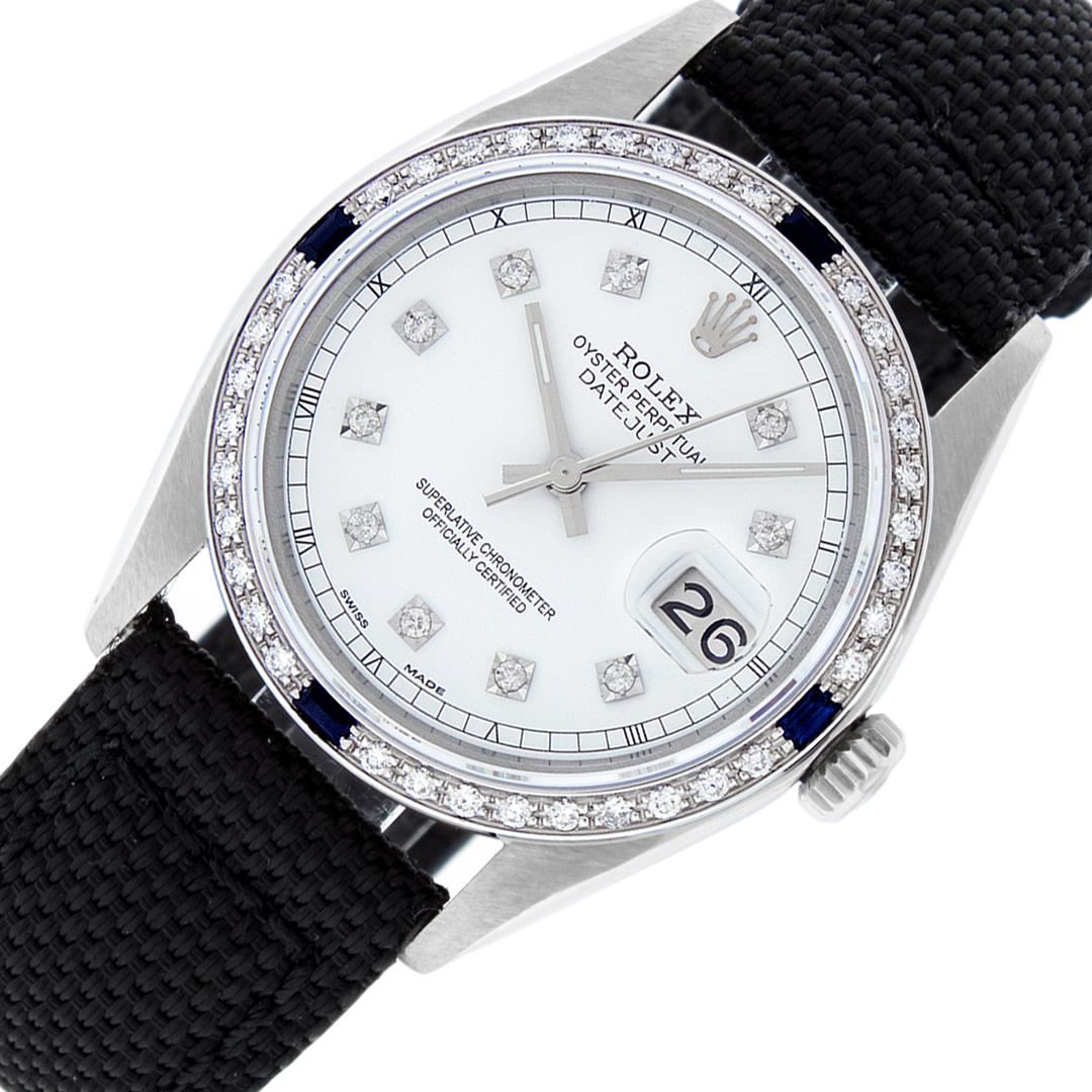 One Mens Pre Owned Stainless Steel Rolex Datejust Polished, Serviced & Electronically Tested, Rolex Stainless Steel Case: 36mm, Rolex Stainless Steel Crown, Custom Bezel: New 18K White Gold Sapphire Beadset Diamond Bezel, Diamond + Gem Count: 36 Diamonds + 4 Sapphires, Clarity: SI-VS, Color: G to H. Custom Crystal: New Sapphire With Magnified Date Window. Custom Hands: New Luminescent Hands. Rolex Movement: Automatic Winding Movement 3035. Custom Dial: Refinished To White With Custom Added Diamonds, 10 Diamonds In Dial, G To H In Color, Clarity: SI-VS. Date Window: 3 O'Clock Position Date Display, Quickset, Model: Datejust. Condition: G-6 Extra Fine. Band: Black Nylon Strap. 7.5 Inch Length. This Watch Has Been Serviced Time Tested And Is In Excellent Condition It Is Free Of All Scratches And Dents.