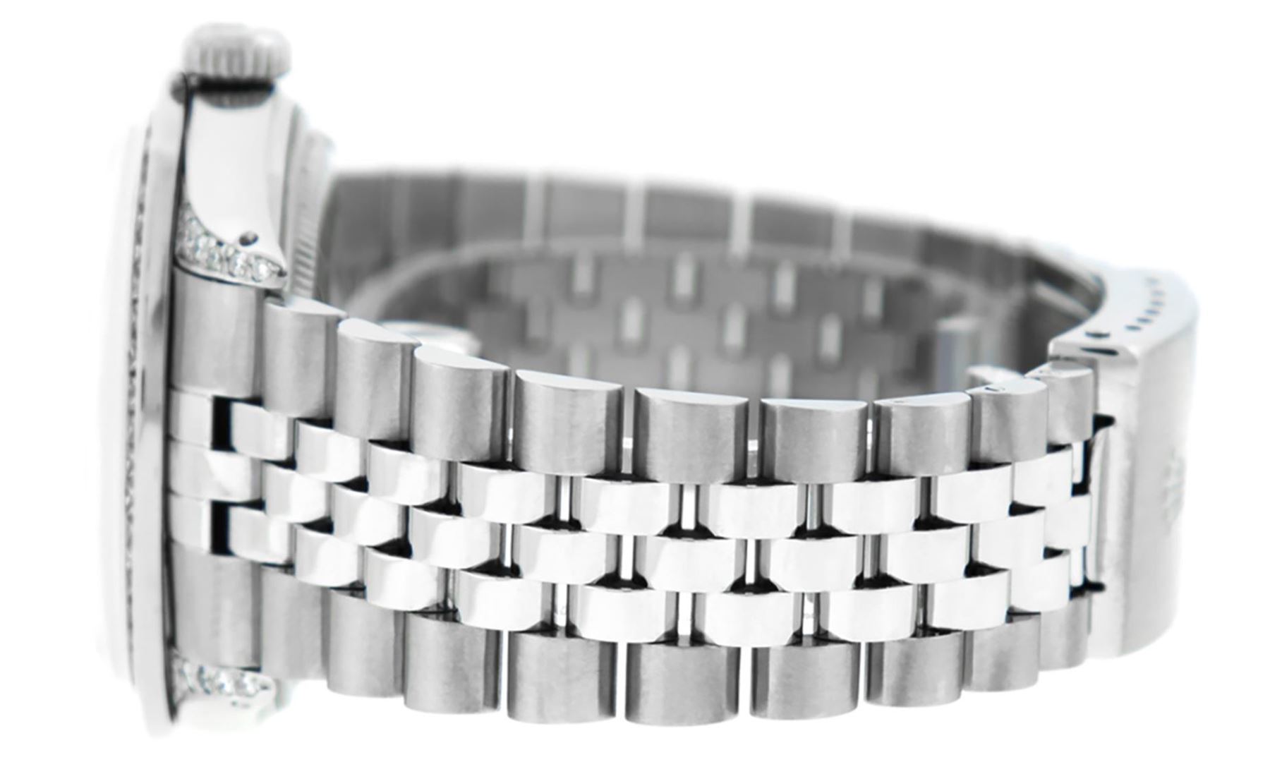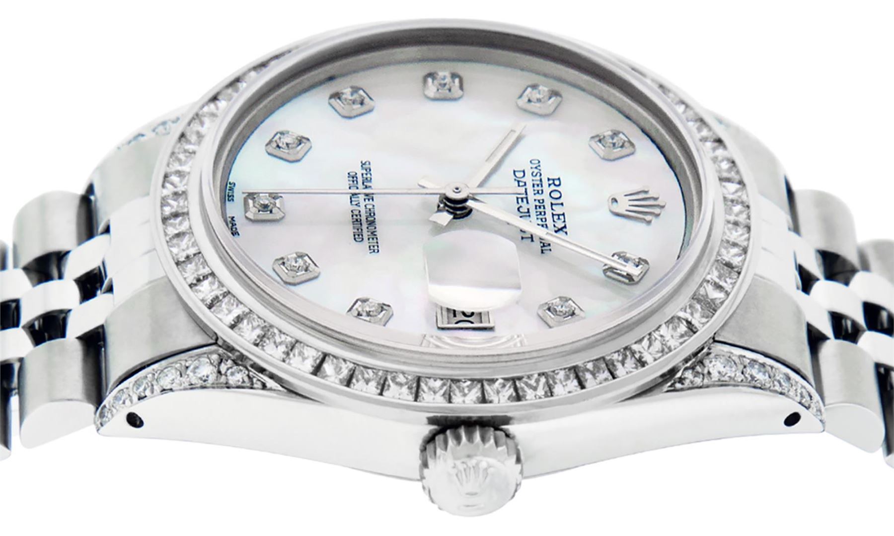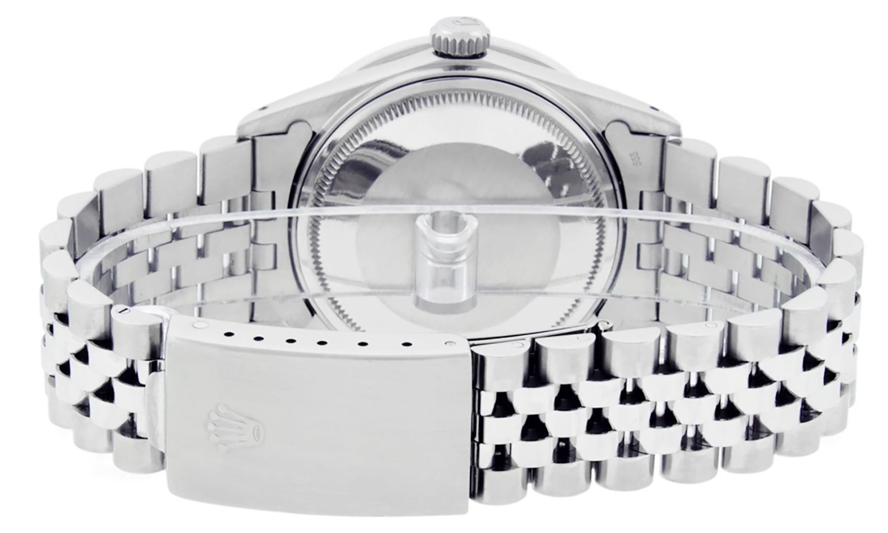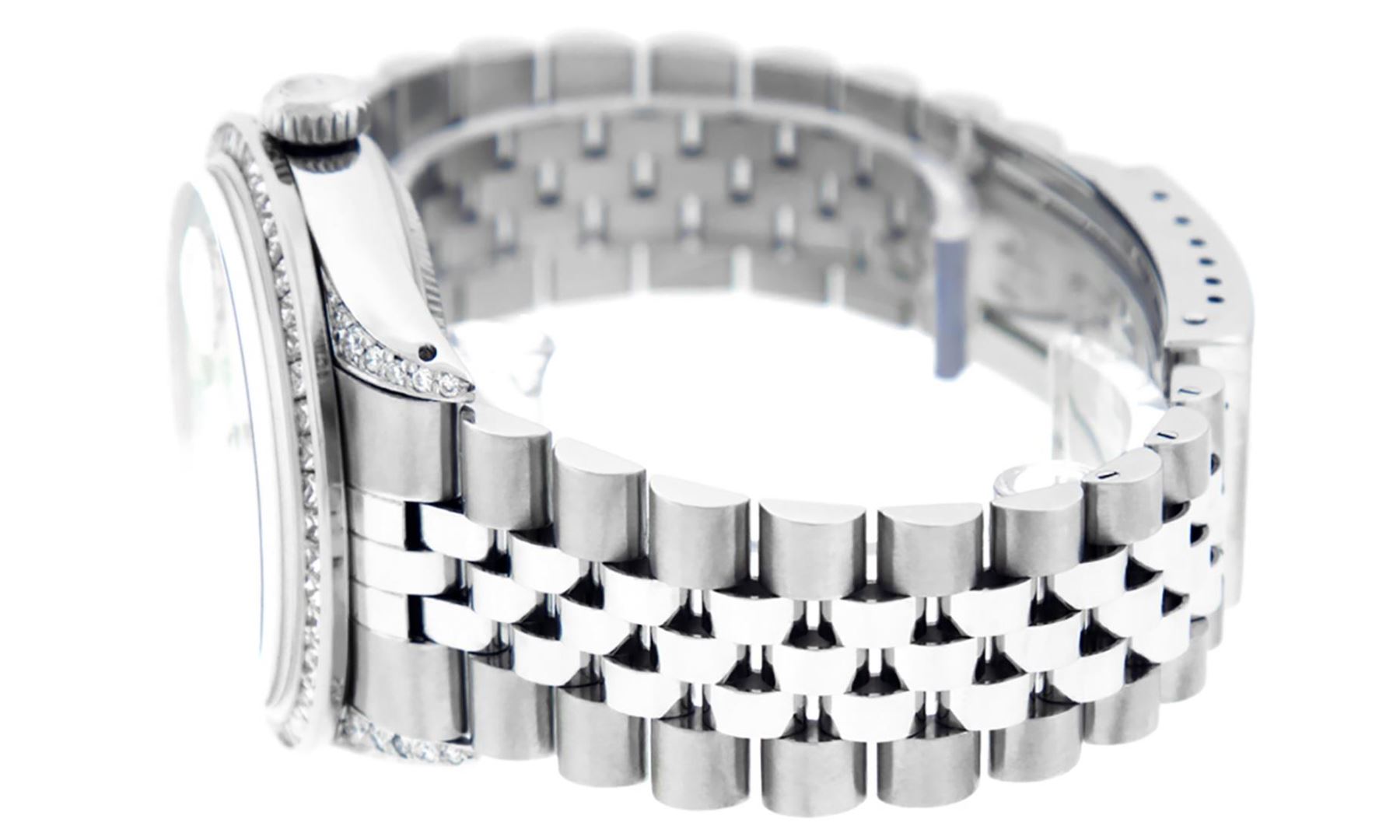 One Mens Pre Owned Stainless Steel Rolex Datejust Polished Bright with Satin Finish, Serviced And Electronically Tested, Rolex Stainless Steel Case: 36mm, Custom Diamond Lugs: 28 Added Diamonds On Lugs. Rolex Stainless Steel Crown, Custom Bezel: New 14K White Gold Princess Cut Diamond Bezel, Diamond Count: 53 Diamonds, Total Weight 2.75 Carat. Custom Crystal: New Sapphire With Magnified Date Window. Custom Hands: New Luminescent Hands. Rolex Movement: Automatic Winding Movement 3035. Custom Dial: Custom White Dial With Added Diamond Hour Markers, Diamond Count: 10 Diamonds On Dial. Date Window: 3 O'Clock Position Date Display, Quickset, Model: Datejust Condition: G-6 Extra Fine. Rolex Bracelet: Stainless Steel Jubilee Band. Bright Polish And Satin Finish. 7.0 Inch Length, Adjustable. Standard Clasp, With Rolex Logo. This Watch Has Been Serviced And Polished And Its Free Of All Dents And Scratches.