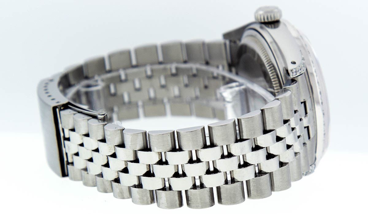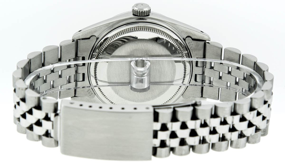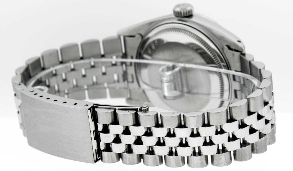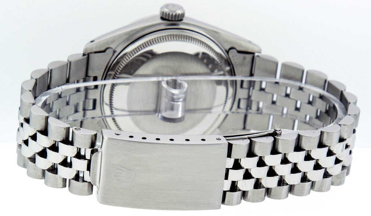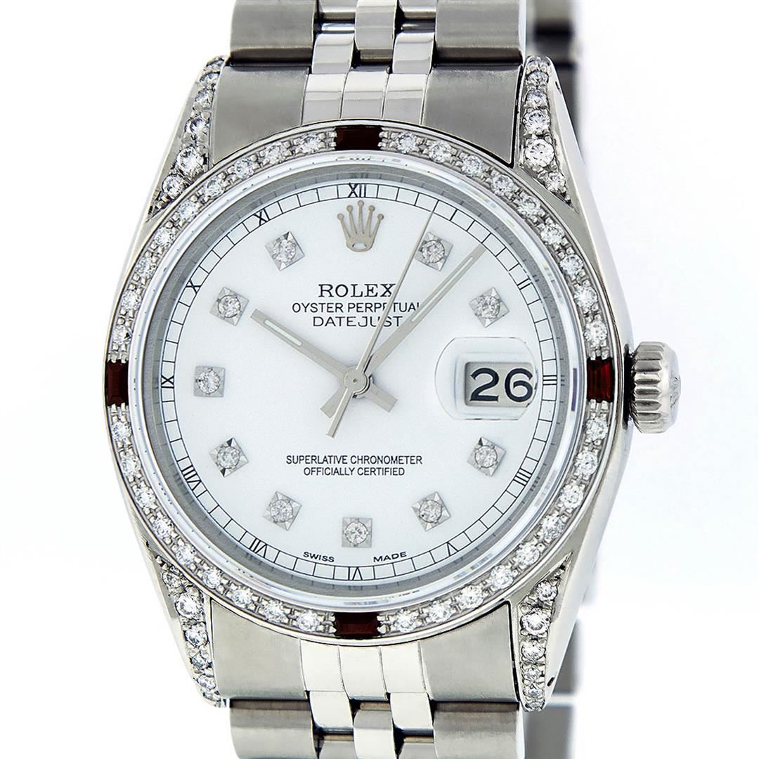 One Mens Rolex Datejust Polished Bright with Satin Finish, Serviced & Electronically Tested, Stainless Steel Case:36mm, Diamond Lugs: 28 Diamonds In Lugs, Color: G to H, Clarity: SI-VS. Stainless Steel Crown, Custom Bezel: 18K White Gold Diamond + Ruby Beadset, Diamond Count: 36 Diamonds + 4 Rubies, Total Weight 1.00 Carat, Clarity: SI-VS, Color: G to H. Custom Crystal: Synthetic Sapphire Cyclops Lens. Movement: Automatic Winding Movement Caliber 3035. Custom Dial: White Diamond Dial With Sqaure Roman Track, Diamond Color: G To H In Color, Clarity: SI-VS. Date Window: 3 O'Clock Position Date Display, Quickset, Model: Datejust Condition: G-6 Extra Fine. Bracelet: Stainless Steel Jubilee Band. Bright Polish & Satin Finish. 7.0 Inch Length, Adjustable. Standard Clasp, With Rolex Logo. This watch has been serviced and polished and its free of all dents and scratches.