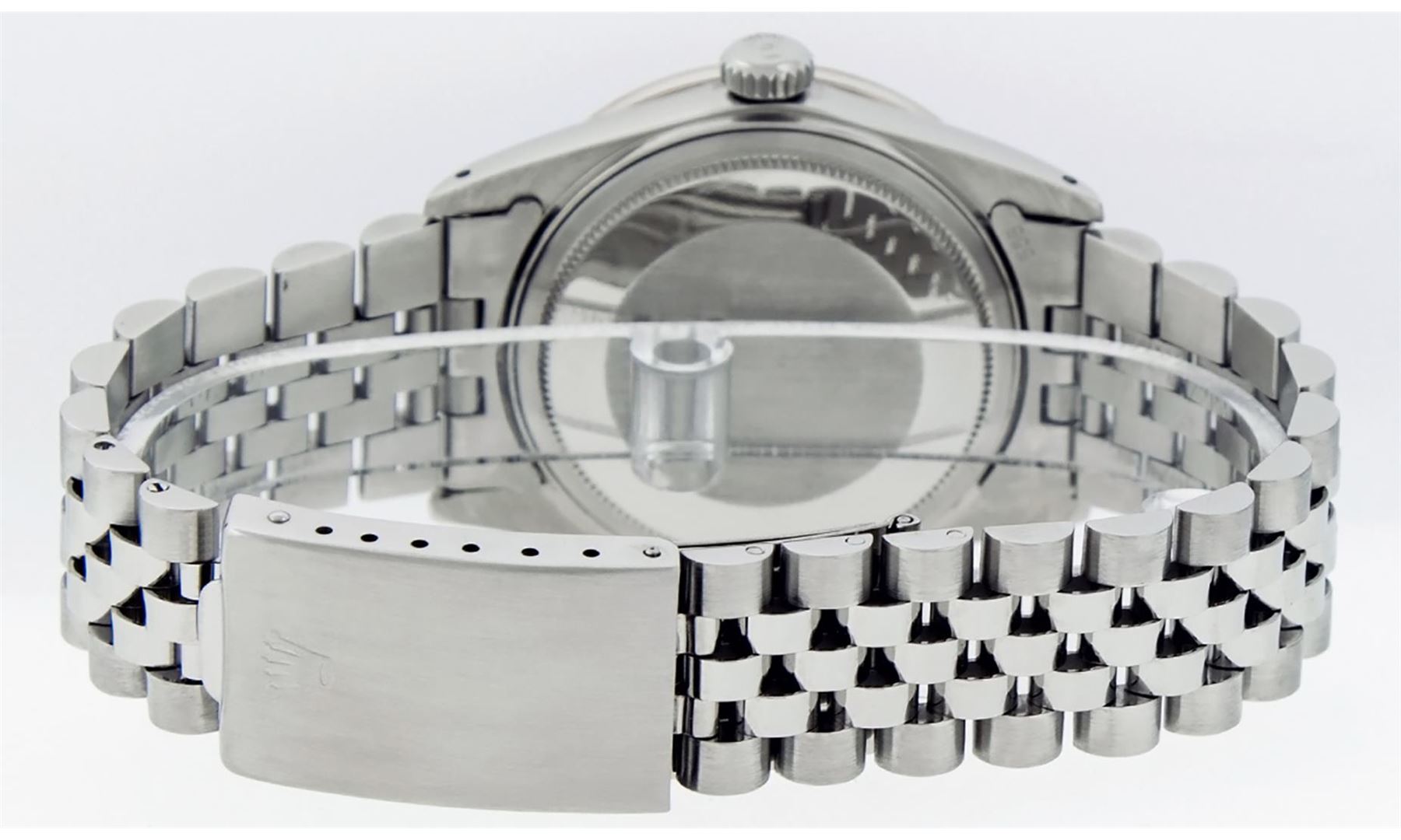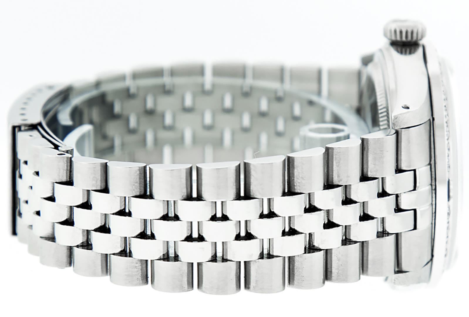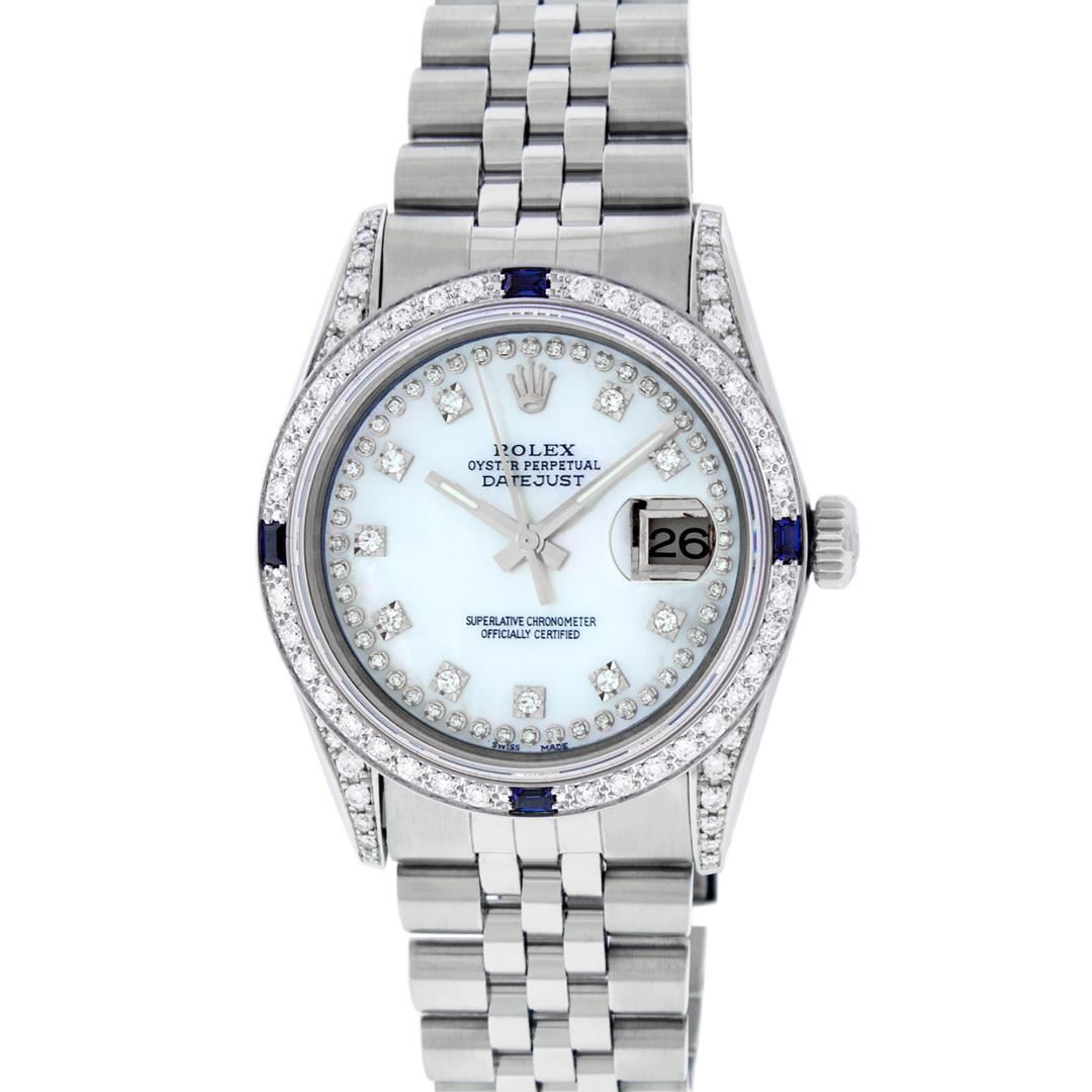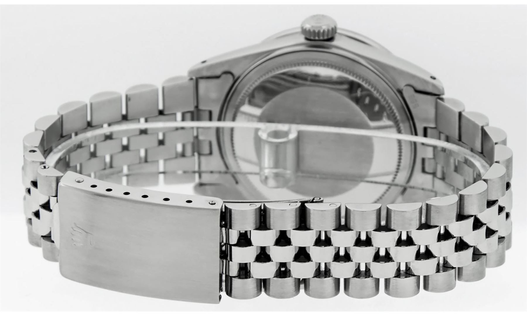 One Mens Pre Owned Stainless Steel Rolex Datejust Polished Bright with Satin Finish, Serviced And Electronically Tested, Rolex Stainless Steel Case: 36mm, Custom Diamond Lugs: 28 Diamonds On Lugs. Rolex Stainless Steel Crown, Custom Bezel: New 18K White Gold Diamond + Sapphire Beadset, Diamond Count: 36 Diamonds + 4 Sapphires. Custom Crystal: New Sapphire With Magnified Date Window. Custom Hands: New Luminescent Hands. Rolex Movement: Automatic Winding Movement 3035. Custom Dial: Custom White Dial With Added Diamonds, Stone Count: 58 Diamonds On Dial. Date Window: 3 O'Clock Position Date Display, Quickset, Model: Datejust Condition: G-6 Extra Fine. Rolex Bracelet: Stainless Steel Jubilee Band. Bright Polish And Satin Finish. 7.0 Inch Length, Adjustable. Standard Clasp, With Rolex Logo. This Watch Has Been Serviced And Polished And Its Free Of All Dents And Scratches.