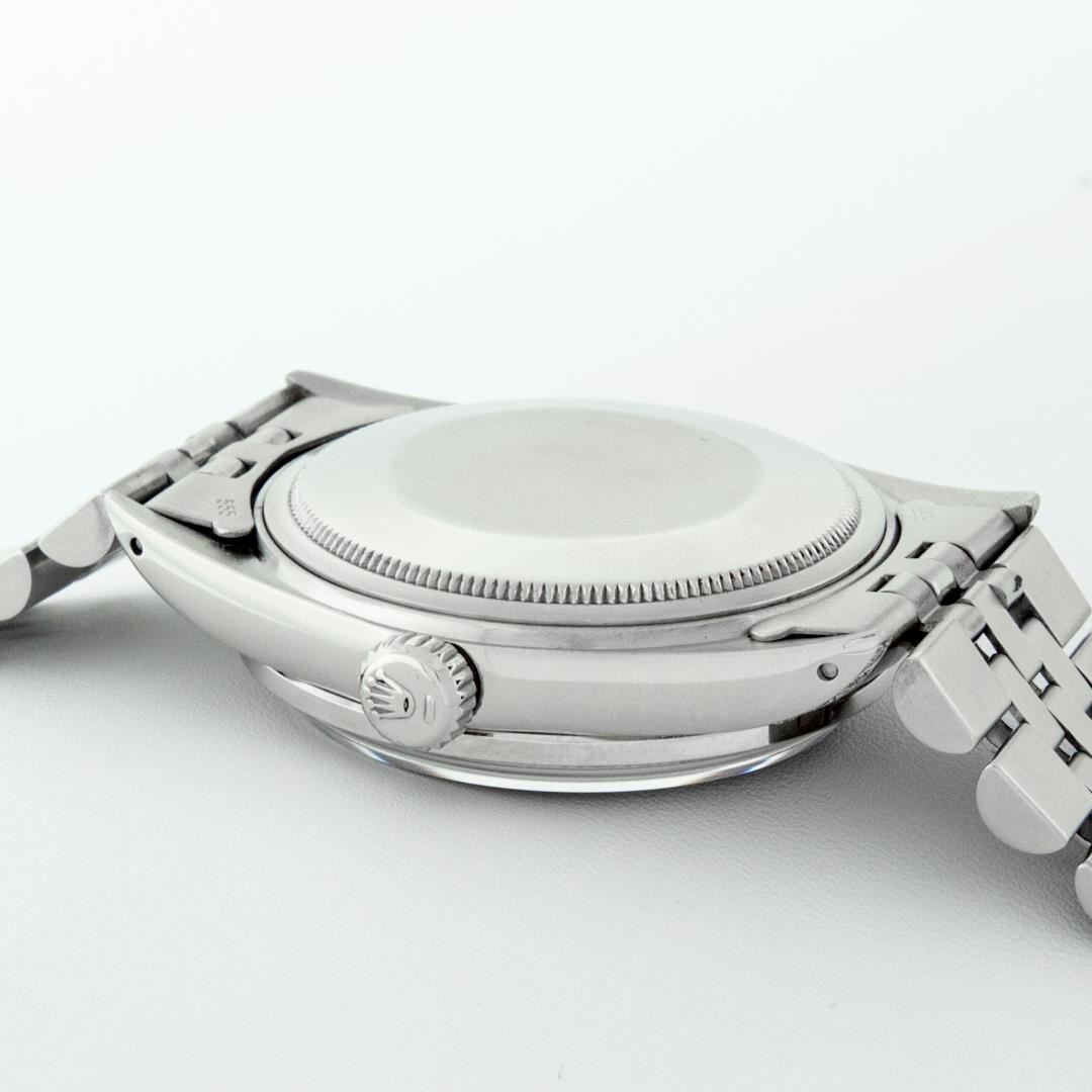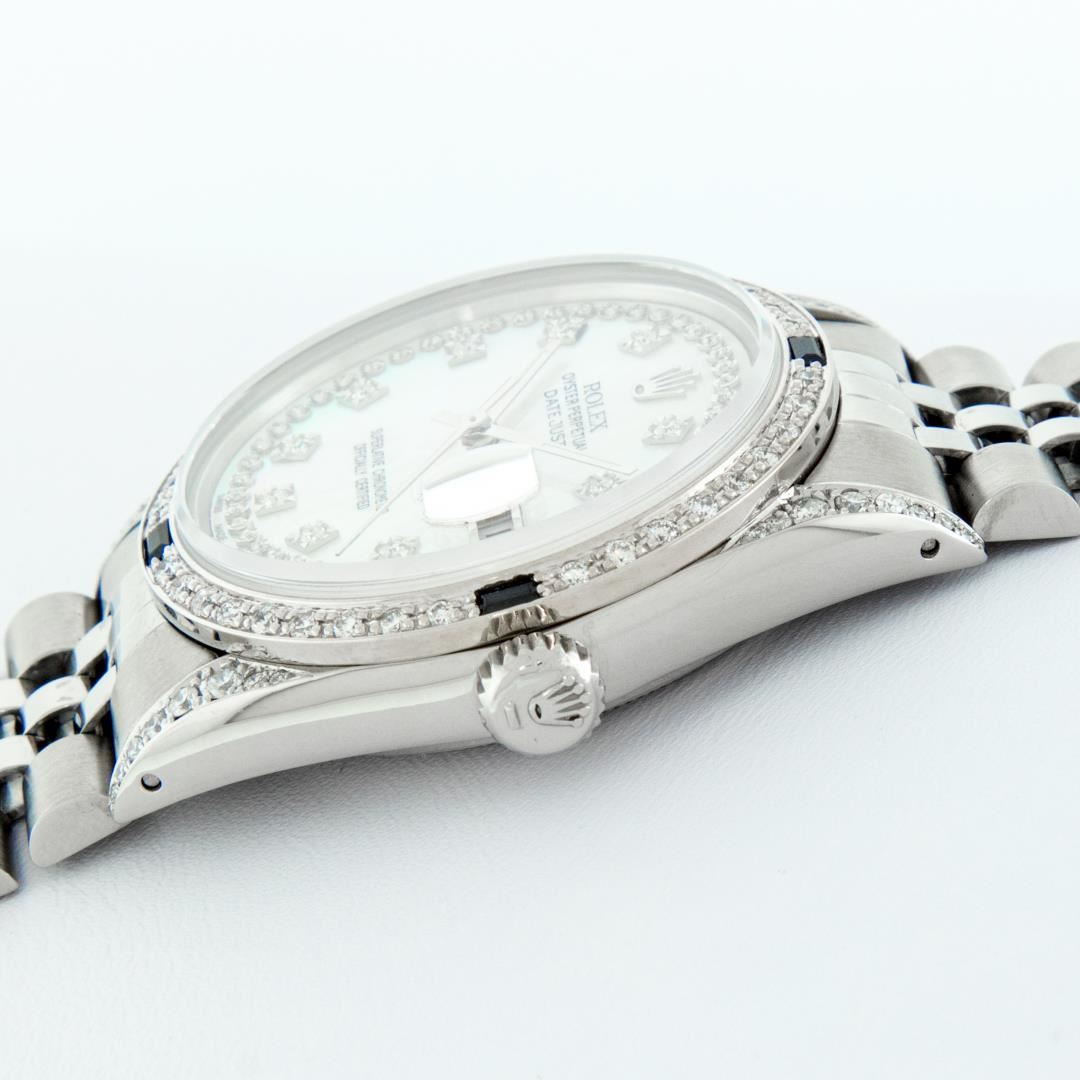 One Mens Pre Owned Stainless Steel Rolex Datejust Polished Bright with Satin Finish, Serviced And Electronically Tested, Rolex Stainless Steel Case: 36mm, Custom Diamond Lugs: 28 Diamonds On Lugs. Rolex Stainless Steel Crown, Custom Bezel: New 18K White Gold Diamond + Sapphire Beadset, Diamond Count: 36 Diamonds + 4 Sapphires. Custom Crystal: New Sapphire With Magnified Date Window. Custom Hands: New Luminescent Hands. Rolex Movement: Automatic Winding Movement 3035. Custom Dial: Custom White Dial With Added Diamonds, Stone Count: 58 Diamonds On Dial. Date Window: 3 O'Clock Position Date Display, Quickset, Model: Datejust Condition: G-6 Extra Fine. Rolex Bracelet: Stainless Steel Jubilee Band. Bright Polish And Satin Finish. 7.0 Inch Length, Adjustable. Standard Clasp, With Rolex Logo. This Watch Has Been Serviced And Polished And Its Free Of All Dents And Scratches.