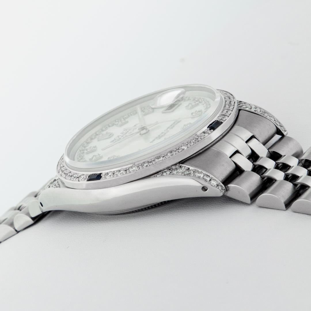 One Mens Pre Owned Stainless Steel Rolex Datejust Polished Bright with Satin Finish, Serviced And Electronically Tested, Rolex Stainless Steel Case: 36mm, Custom Diamond Lugs: 28 Diamonds On Lugs. Rolex Stainless Steel Crown, Custom Bezel: New 18K White Gold Diamond + Sapphire Beadset, Diamond Count: 36 Diamonds + 4 Sapphires. Custom Crystal: New Sapphire With Magnified Date Window. Custom Hands: New Luminescent Hands. Rolex Movement: Automatic Winding Movement 3035. Custom Dial: Custom White Dial With Added Diamonds, Stone Count: 58 Diamonds On Dial. Date Window: 3 O'Clock Position Date Display, Quickset, Model: Datejust Condition: G-6 Extra Fine. Rolex Bracelet: Stainless Steel Jubilee Band. Bright Polish And Satin Finish. 7.0 Inch Length, Adjustable. Standard Clasp, With Rolex Logo. This Watch Has Been Serviced And Polished And Its Free Of All Dents And Scratches.
