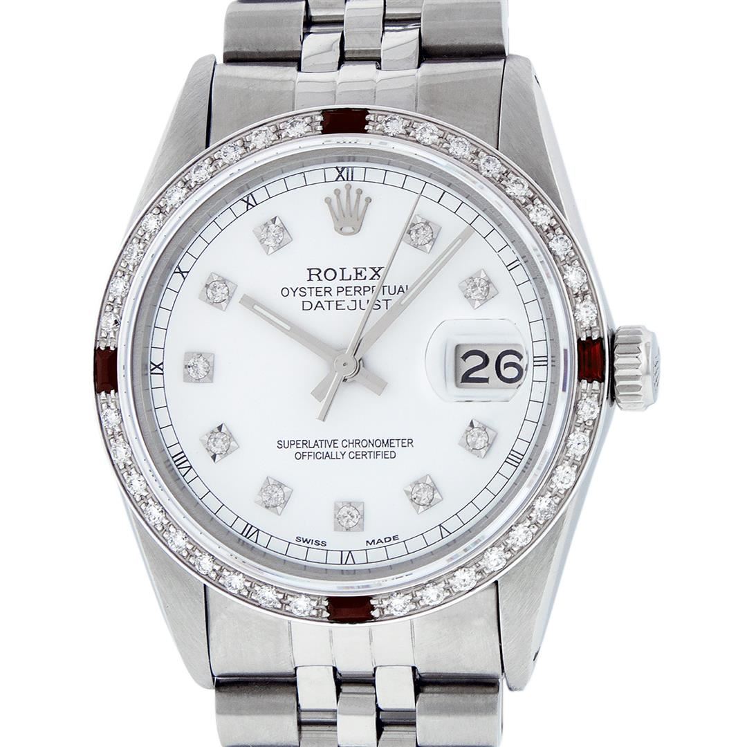 One Mens Pre Owned Stainless Steel Rolex Datejust Polished, Serviced & Electronically Tested, Rolex Stainless Steel Case: 36mm, Rolex Stainless Steel Crown, Custom Bezel: New 18K White Gold Sapphire Bead set Diamond Bezel, Diamond + Gem Count: 36 Diamonds