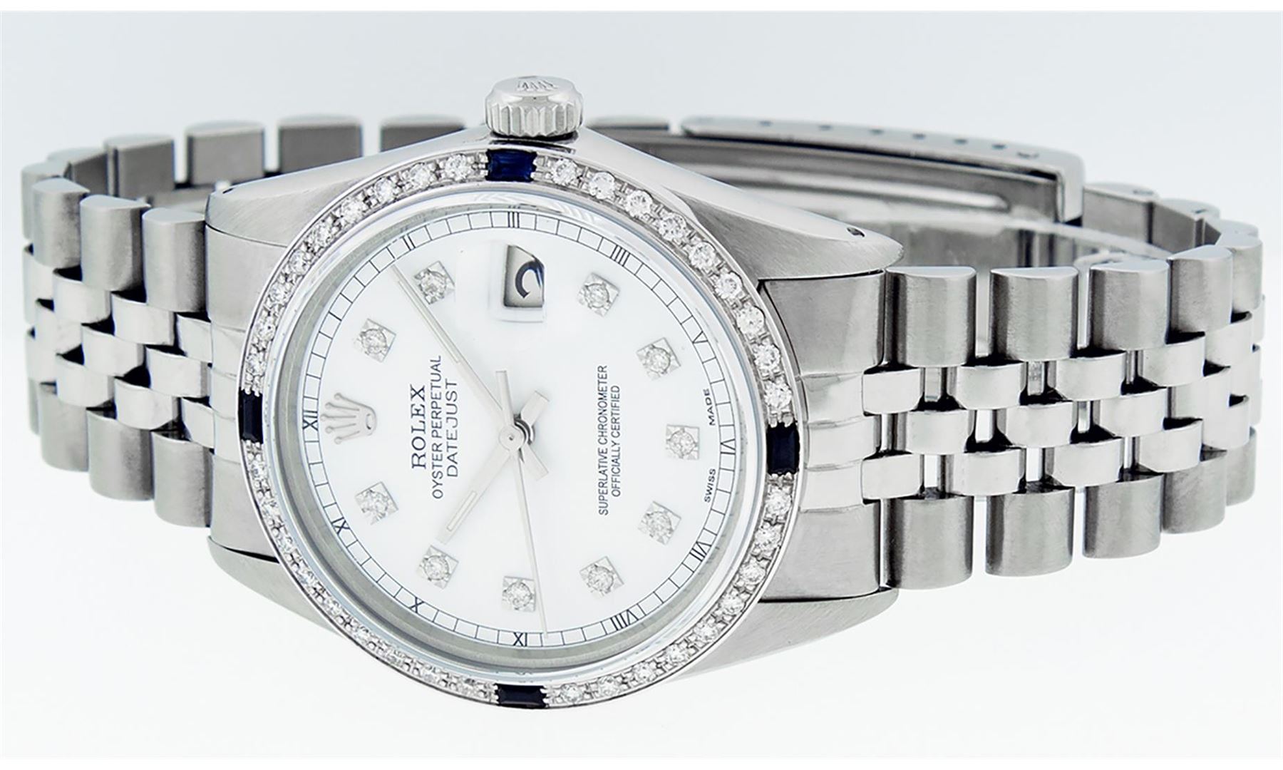 One Mens Pre Owned Stainless Steel Rolex Datejust Polished, Serviced & Electronically Tested, Rolex Stainless Steel Case: 36mm, Rolex Stainless Steel Crown, Custom Bezel: New 18K White Gold Sapphire Bead set Diamond Bezel, Diamond + Gem Count: 36 Diamonds