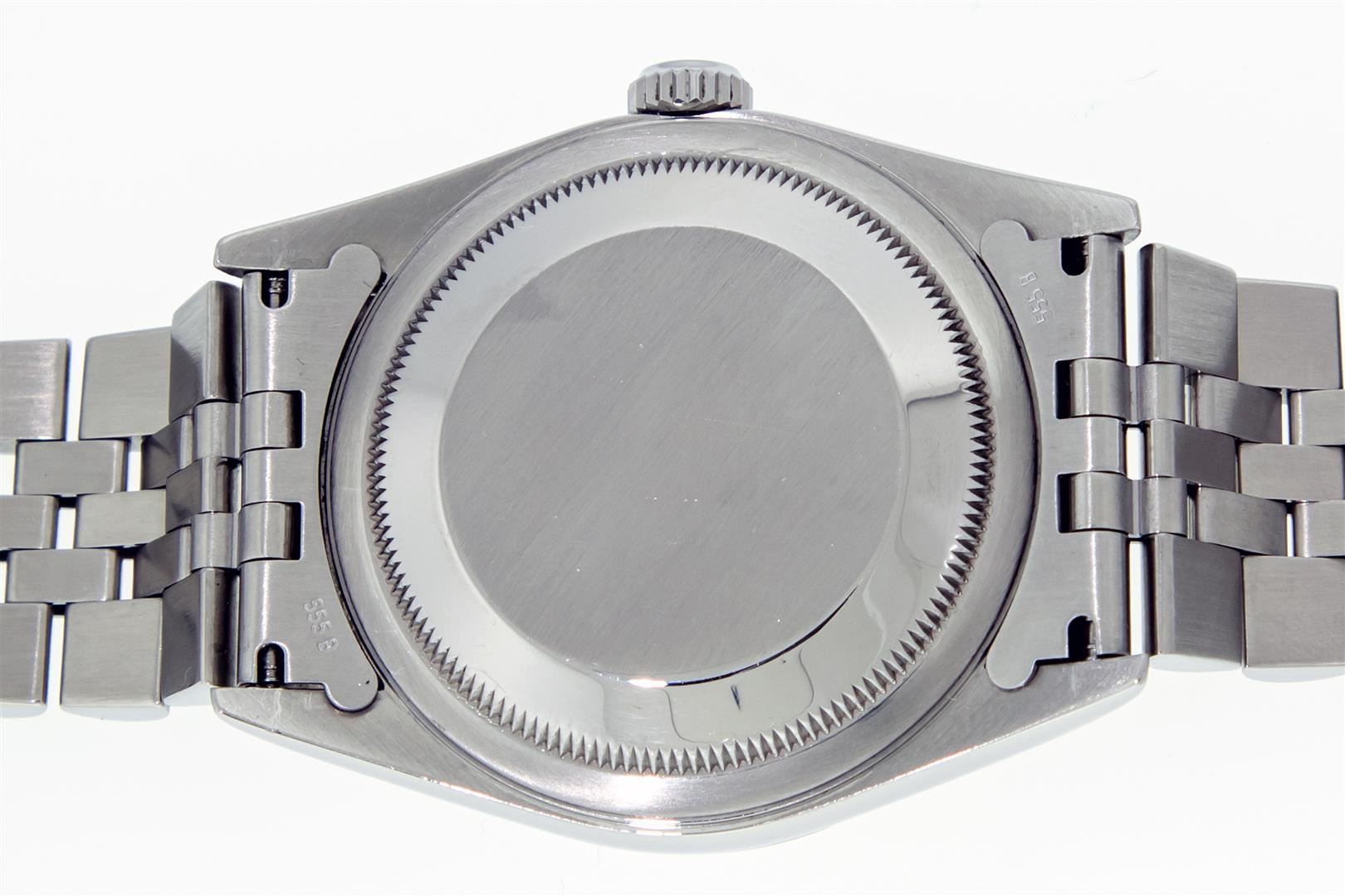 One Mens Pre Owned Stainless Steel Rolex Datejust Polished Bright with Satin Finish, This Watch Has Been Serviced & Electronically Tested, Rolex Stainless Steel Case: 36mm, Rolex Stainless Steel Crown, Rolex Bezel: 18K White Gold Fluted Bezel. Custom Crystal: New Sapphire With Magnified Date Window. Custom Hands: New Luminescent Hands. Rolex Movement: Automatic Winding Movement Caliber 3135. Custom Dial: White Index With Square Track. Date Window: 3 O'Clock Position Date Display, Quickset, Model: Sapphire Datejust, Condition: G-6 Extra Fine. Rolex Bracelet: Stainless Steel Jubilee Band. Bright Polish & Satin Finish. 7.0 Inch Length, Adjustable. Standard Clasp, With Rolex Logo. This Watch Has Been Serviced Time Tested And Is In Excellent Condition It Is Free Of All Scratches And Dents. This Watch Comes With Rolex Box, Booklets, Hang Tag, & Wallet.