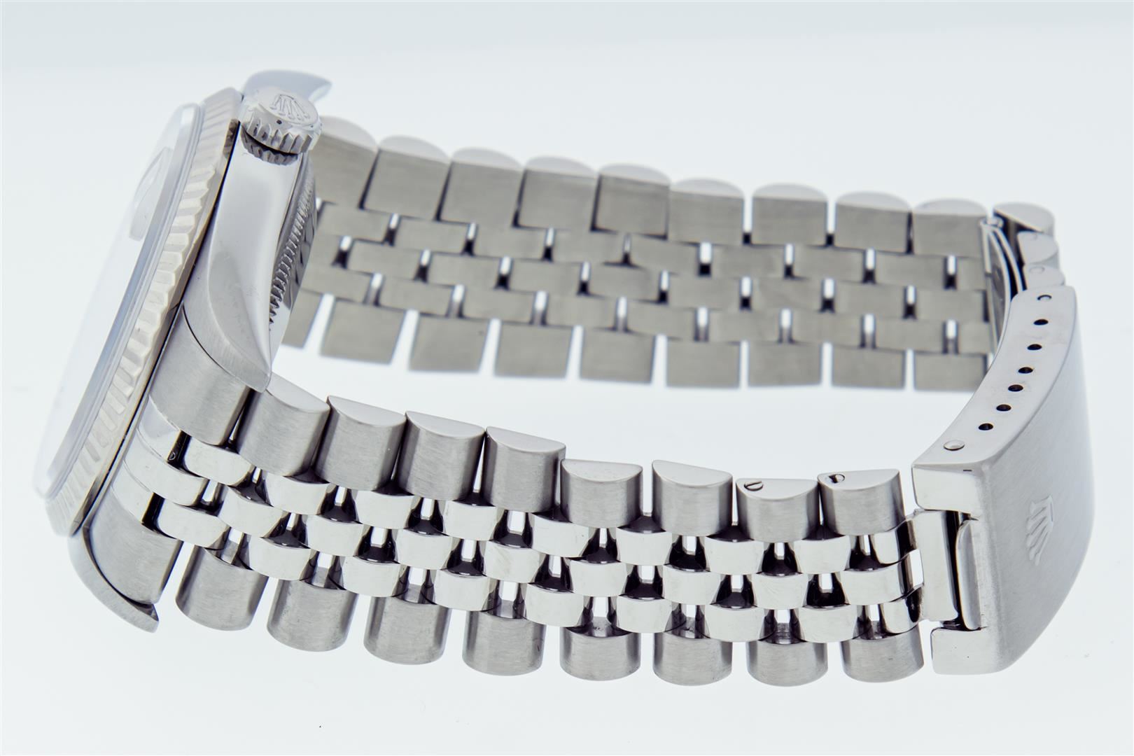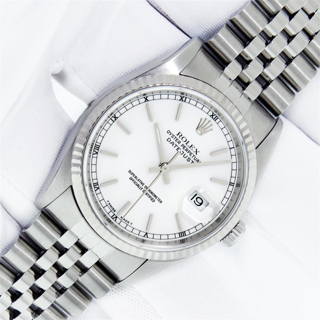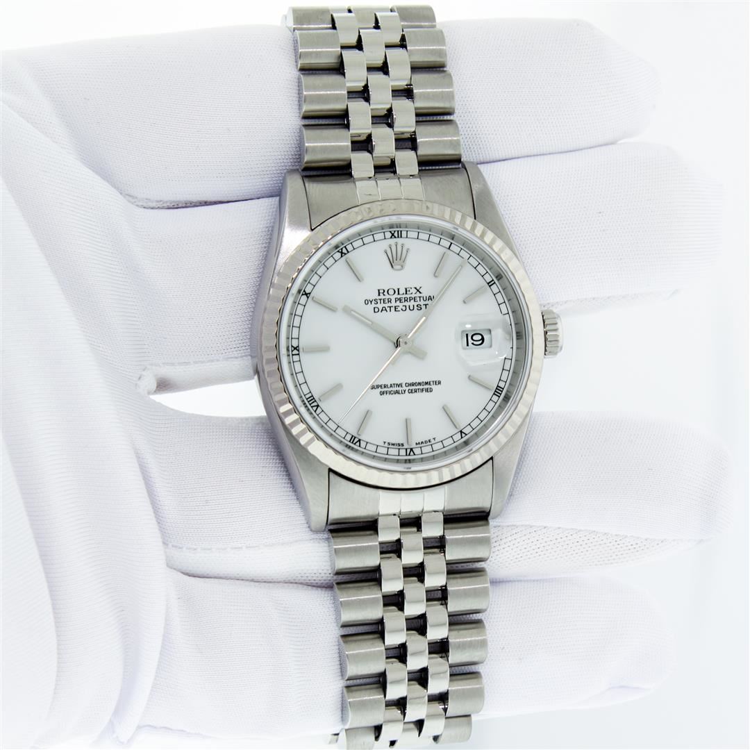 One Mens Pre Owned Stainless Steel Rolex Datejust Polished Bright with Satin Finish, This Watch Has Been Serviced & Electronically Tested, Rolex Stainless Steel Case: 36mm, Rolex Stainless Steel Crown, Rolex Bezel: 18K White Gold Fluted Bezel. Custom Crystal: New Sapphire With Magnified Date Window. Custom Hands: New Luminescent Hands. Rolex Movement: Automatic Winding Movement Caliber 3135. Custom Dial: White Index With Square Track. Date Window: 3 O'Clock Position Date Display, Quickset, Model: Sapphire Datejust, Condition: G-6 Extra Fine. Rolex Bracelet: Stainless Steel Jubilee Band. Bright Polish & Satin Finish. 7.0 Inch Length, Adjustable. Standard Clasp, With Rolex Logo. This Watch Has Been Serviced Time Tested And Is In Excellent Condition It Is Free Of All Scratches And Dents. This Watch Comes With Rolex Box, Booklets, Hang Tag, & Wallet.