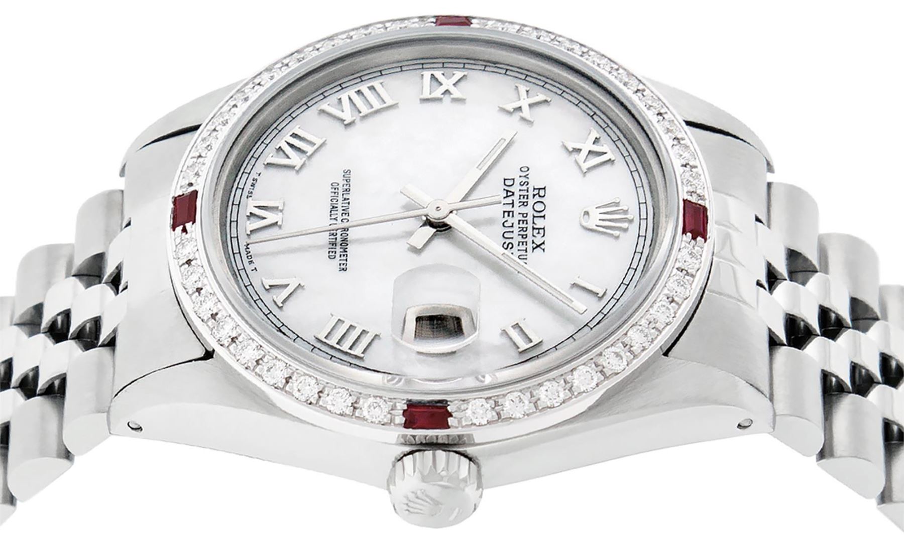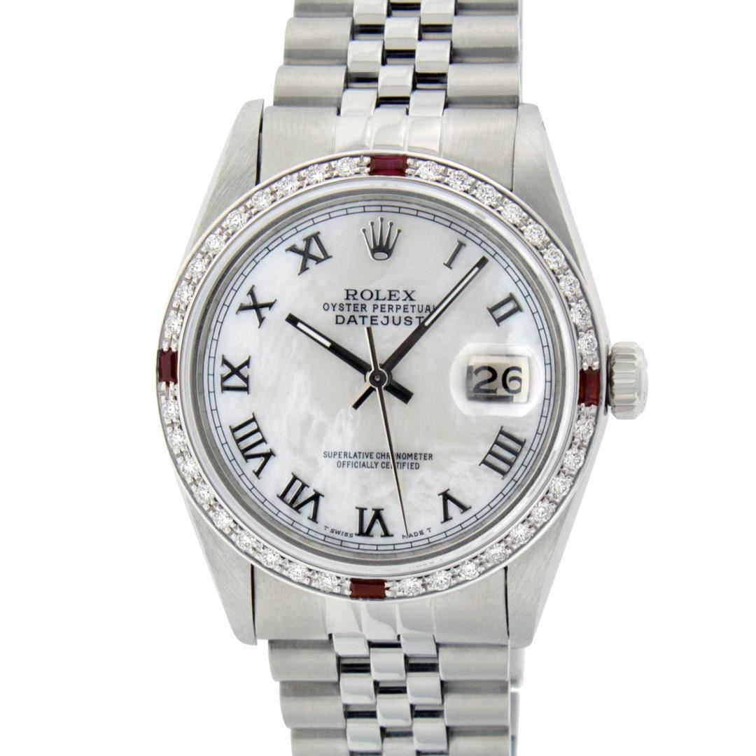 One Mens Pre Owned Stainless Steel Rolex Datejust Polished Bright with Satin Finish, This Watch Has Been Serviced And Electronically Tested, Rolex Stainless Steel Case: 36mm, Rolex Stainless Steel Crown, Custom Bezel: New 18K White Gold Ruby Beadset Diamond Bezel, Diamond + Gem Count: 36 Diamonds + 4 Rubies. Custom Crystal: New Sapphire With Magnified Date Window. Custom Hands: New Luminescent Hands. Rolex Movement: Automatic Winding Movement 3035. Custom Dial: Custom White Dial With Roman Hour Markers. Date Window: 3 O'Clock Position Date Display, Quickset, Model: Datejust, Condition: G-6 Extra Fine. Rolex Bracelet: Stainless Steel Jubilee Band. Bracelet: 7.0 Inch Length, Adjustable. Standard Clasp, With Rolex Logo. This Watch Has Been Serviced Time Tested And Is In Excellent Condition It Is Free Of All Scratches And Dents.