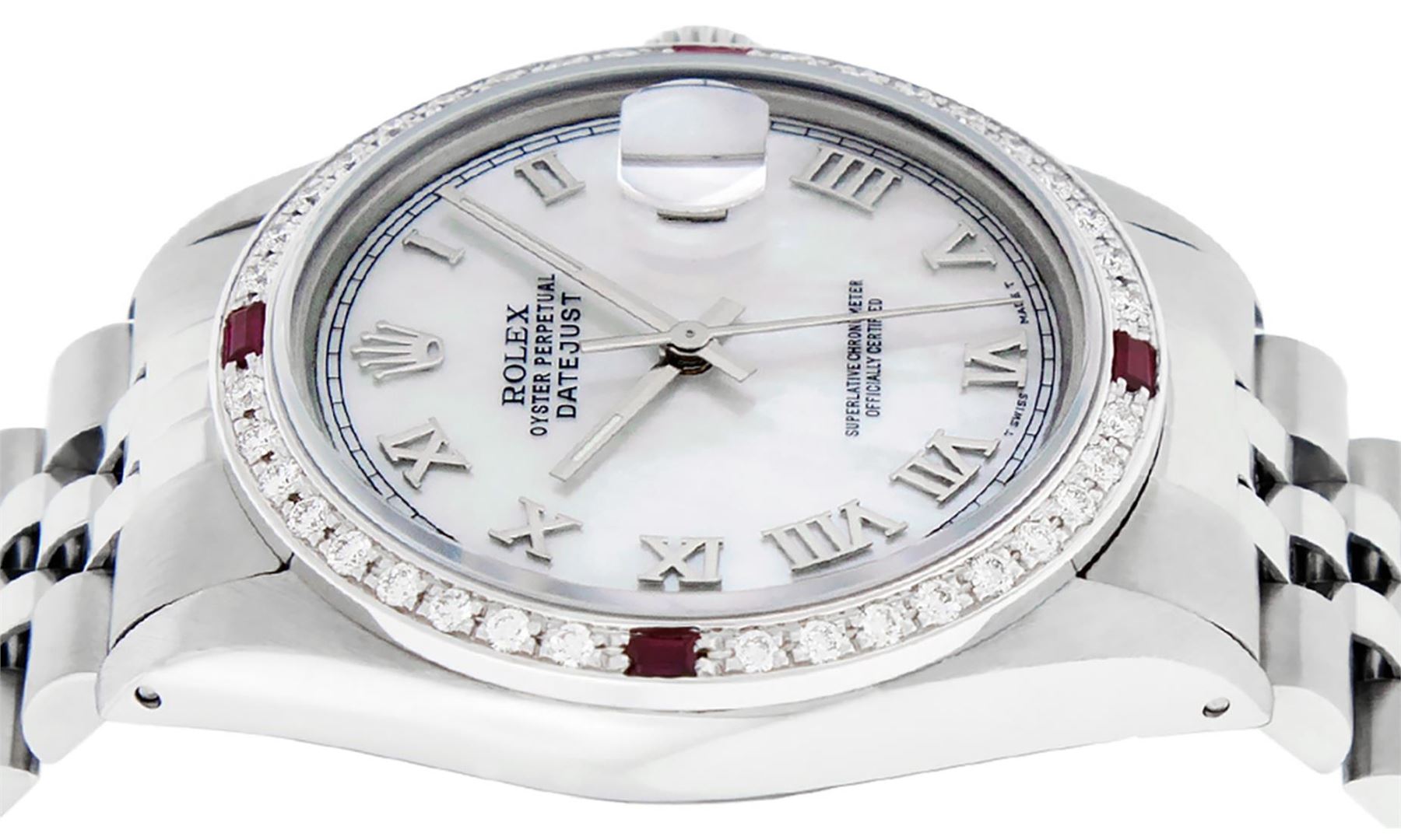 One Mens Pre Owned Stainless Steel Rolex Datejust Polished Bright with Satin Finish, This Watch Has Been Serviced And Electronically Tested, Rolex Stainless Steel Case: 36mm, Rolex Stainless Steel Crown, Custom Bezel: New 18K White Gold Ruby Beadset Diamond Bezel, Diamond + Gem Count: 36 Diamonds + 4 Rubies. Custom Crystal: New Sapphire With Magnified Date Window. Custom Hands: New Luminescent Hands. Rolex Movement: Automatic Winding Movement 3035. Custom Dial: Custom White Dial With Roman Hour Markers. Date Window: 3 O'Clock Position Date Display, Quickset, Model: Datejust, Condition: G-6 Extra Fine. Rolex Bracelet: Stainless Steel Jubilee Band. Bracelet: 7.0 Inch Length, Adjustable. Standard Clasp, With Rolex Logo. This Watch Has Been Serviced Time Tested And Is In Excellent Condition It Is Free Of All Scratches And Dents.