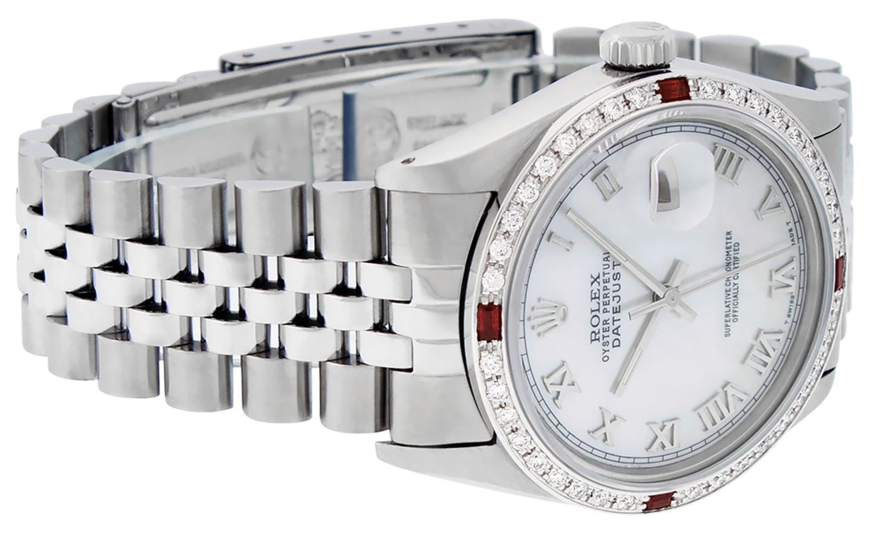 One Mens Pre Owned Stainless Steel Rolex Datejust Polished Bright with Satin Finish, This Watch Has Been Serviced And Electronically Tested, Rolex Stainless Steel Case: 36mm, Rolex Stainless Steel Crown, Custom Bezel: New 18K White Gold Ruby Beadset Diamond Bezel, Diamond + Gem Count: 36 Diamonds + 4 Rubies. Custom Crystal: New Sapphire With Magnified Date Window. Custom Hands: New Luminescent Hands. Rolex Movement: Automatic Winding Movement 3035. Custom Dial: Custom White Dial With Roman Hour Markers. Date Window: 3 O'Clock Position Date Display, Quickset, Model: Datejust, Condition: G-6 Extra Fine. Rolex Bracelet: Stainless Steel Jubilee Band. Bracelet: 7.0 Inch Length, Adjustable. Standard Clasp, With Rolex Logo. This Watch Has Been Serviced Time Tested And Is In Excellent Condition It Is Free Of All Scratches And Dents.