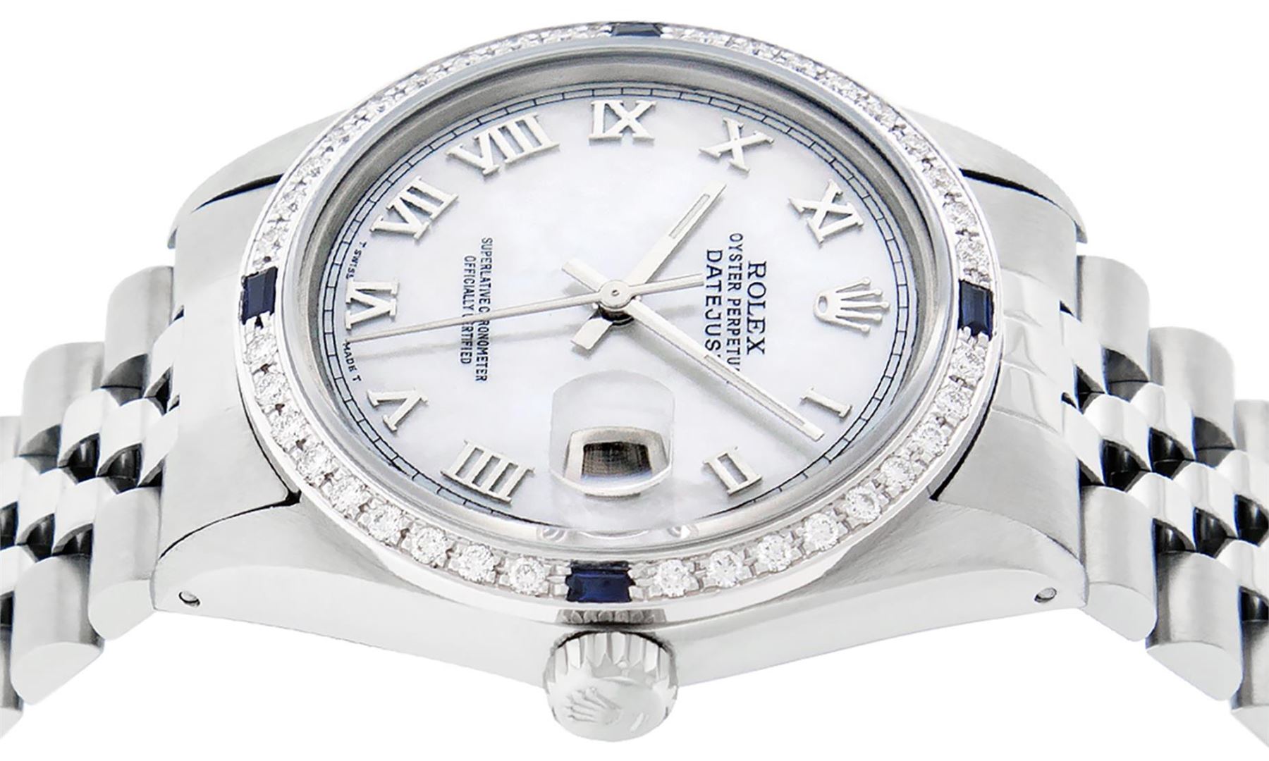 One Mens Pre Owned Stainless Steel Rolex Datejust Polished Bright with Satin Finish, Rolex Stainless Steel Case: 36mm, Rolex Stainless Steel Crown, Custom Bezel: New 18K White Gold Sapphire Beadset Diamond Bezel, Diamond + Gem Count: 36 Diamonds + 4 Sapphires. Custom Crystal: New Sapphire Magnified Date Window. Custom Hands: New Luminescent Hands. Rolex Movement: Automatic Winding Movement 3035. Custom Dial: Custom White Dial With Roman Track. Date Window: 3 O'Clock Position Date Display, Quickset, Model: Datejust, Condition: G-6 Extra Fine. Rolex Bracelet: Stainless Steel Jubilee Band. Rolex Bracelet: 7.0 Inch Length, Adjustable. Standard Clasp, With Rolex Logo. This Watch Has Been Serviced Time Tested And Is In Excellent Condition It Is Free Of All Scratches And Dents.