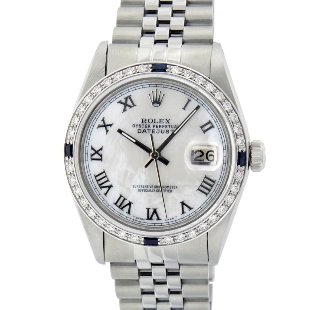 One Mens Pre Owned Stainless Steel Rolex Datejust Polished Bright with Satin Finish, Rolex Stainless Steel Case: 36mm, Rolex Stainless Steel Crown, Custom Bezel: New 18K White Gold Sapphire Beadset Diamond Bezel, Diamond + Gem Count: 36 Diamonds + 4 Sapphires. Custom Crystal: New Sapphire Magnified Date Window. Custom Hands: New Luminescent Hands. Rolex Movement: Automatic Winding Movement 3035. Custom Dial: Custom White Dial With Roman Track. Date Window: 3 O'Clock Position Date Display, Quickset, Model: Datejust, Condition: G-6 Extra Fine. Rolex Bracelet: Stainless Steel Jubilee Band. Rolex Bracelet: 7.0 Inch Length, Adjustable. Standard Clasp, With Rolex Logo. This Watch Has Been Serviced Time Tested And Is In Excellent Condition It Is Free Of All Scratches And Dents.