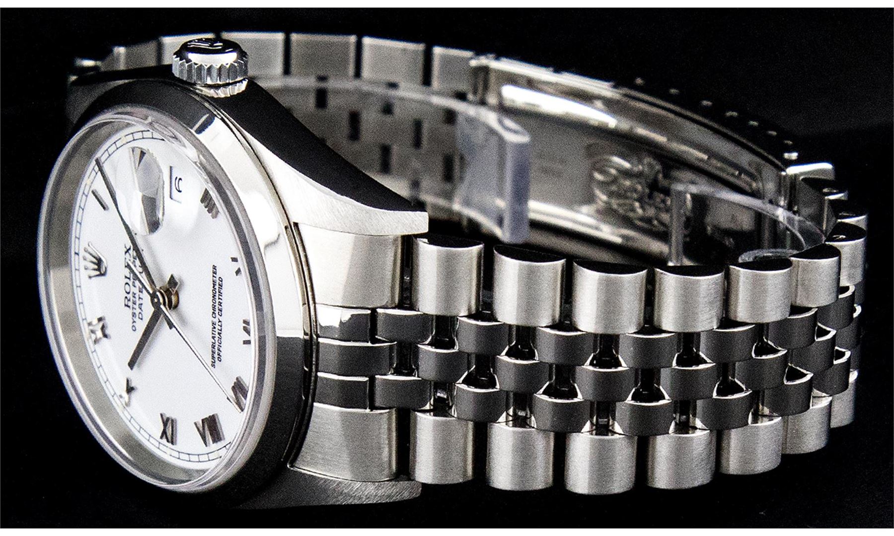 One Mens Rolex Stainless Steel Datejust Polished Bright with Satin Finish, Serviced & Electronically Tested, Rolex Stainless Steel Case: 36mm, Rolex Stainless Steel Crown, Rolex Bezel: Stainless Steel Smooth Bezel. Crystal: Sapphire Cyclops Lens. Rolex Mo