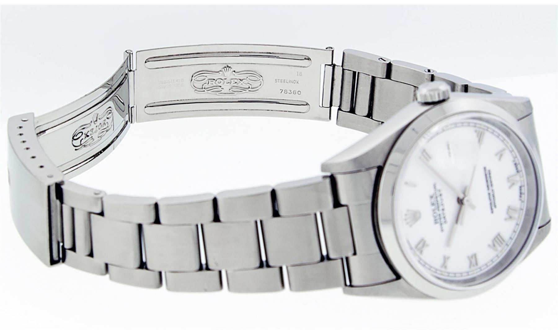 One Mens Rolex Stainless Steel Datejust Polished Bright with Satin Finish, Serviced & Electronically Tested, Rolex Stainless Steel Case: 36mm, Rolex Stainless Steel Crown, Rolex Bezel: Stainless Steel Smooth Bezel. Custom Crystal: New Scratch Resistant Synthetic Sapphire Cyclops Lens. Rolex Movement: Automatic Winding Movement Caliber 3135. Rolex Dial: White Roman With Square Track and Lumi Dot. Custom Hands: New Solid Hands, Date Window: 3 O'Clock Position Date Display, Quickset, Model: Quickset Datejust. Condition: G-6 Extra Fine. Rolex Bracelet: Stainless Steel Oyster Band. Bright Polish & Satin Finish. 7.0 Inch Length, Adjustable. Standard Clasp, With Rolex Logo. This Pre Owned Watch Has Been Serviced Time Tested And Is In Excellent Condition It Is Free Of All Scratches And Dents.