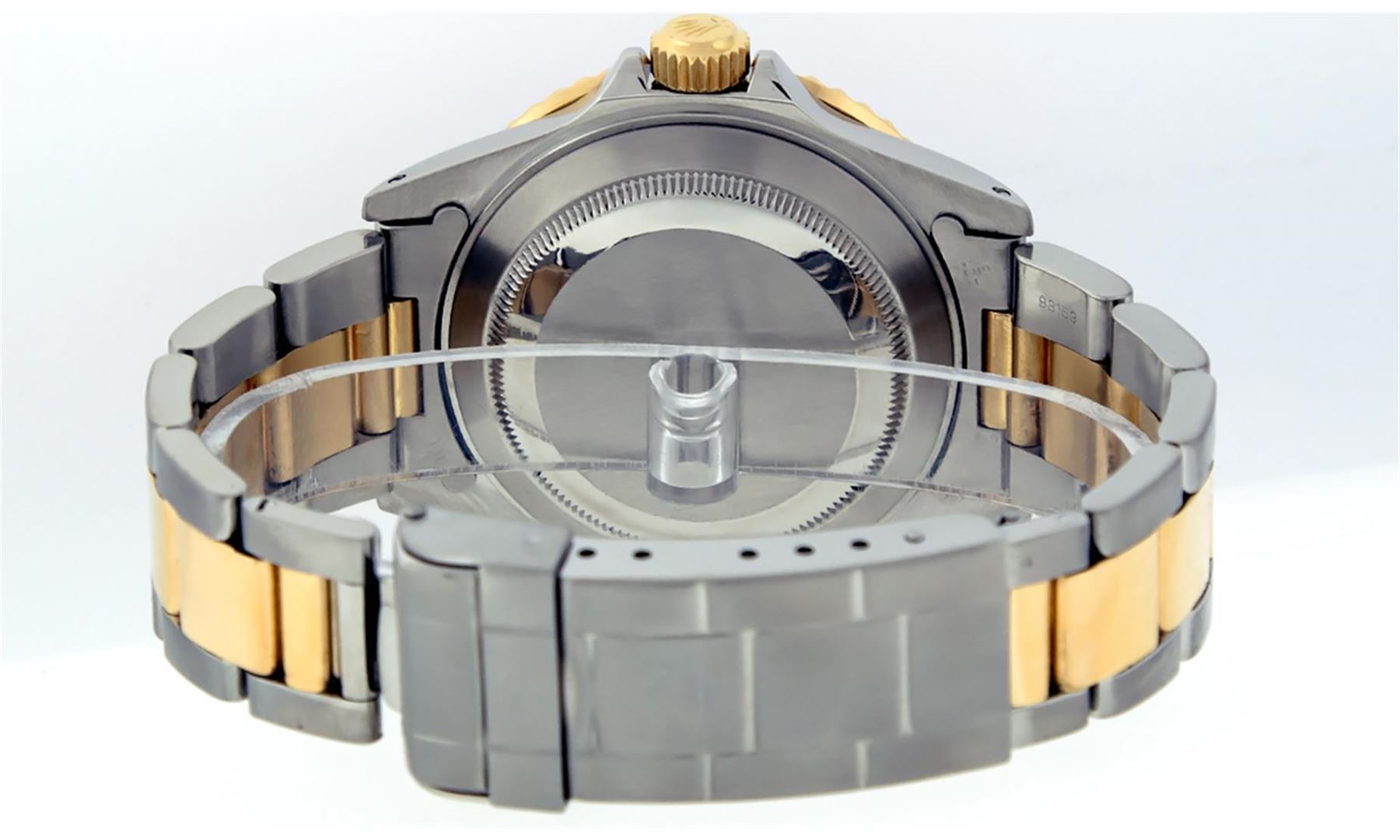 One Mens Pre Owned Rolex Two Tone Submariner With Date Polished, Serviced & Electronically Tested, Rolex Stainless Steel Case: 40mm, Rolex 18K Yellow Gold Crown, Rolex Bezel: 18K Yellow Gold Rotatable Bezel With Blue Insert. Custom Crystal: New Sapphire With Magnified Date Window. Rolex Movement: Automatic Winding Movement Caliber 3135. Rolex Dial: Blue Submariner Dial with Luminous Index Hour Markers. Date Window: 3 O'Clock Position Date Display, Model: Submariner, Quickset, Condition: G-6 Extra Fine. Rolex Bracelet: 18K Yellow Gold And Stainless Steel Band. Bright Polish & Satin Finish. 7.0 Inch Length, Adjustable. Standard Clasp, With Rolex Logo.