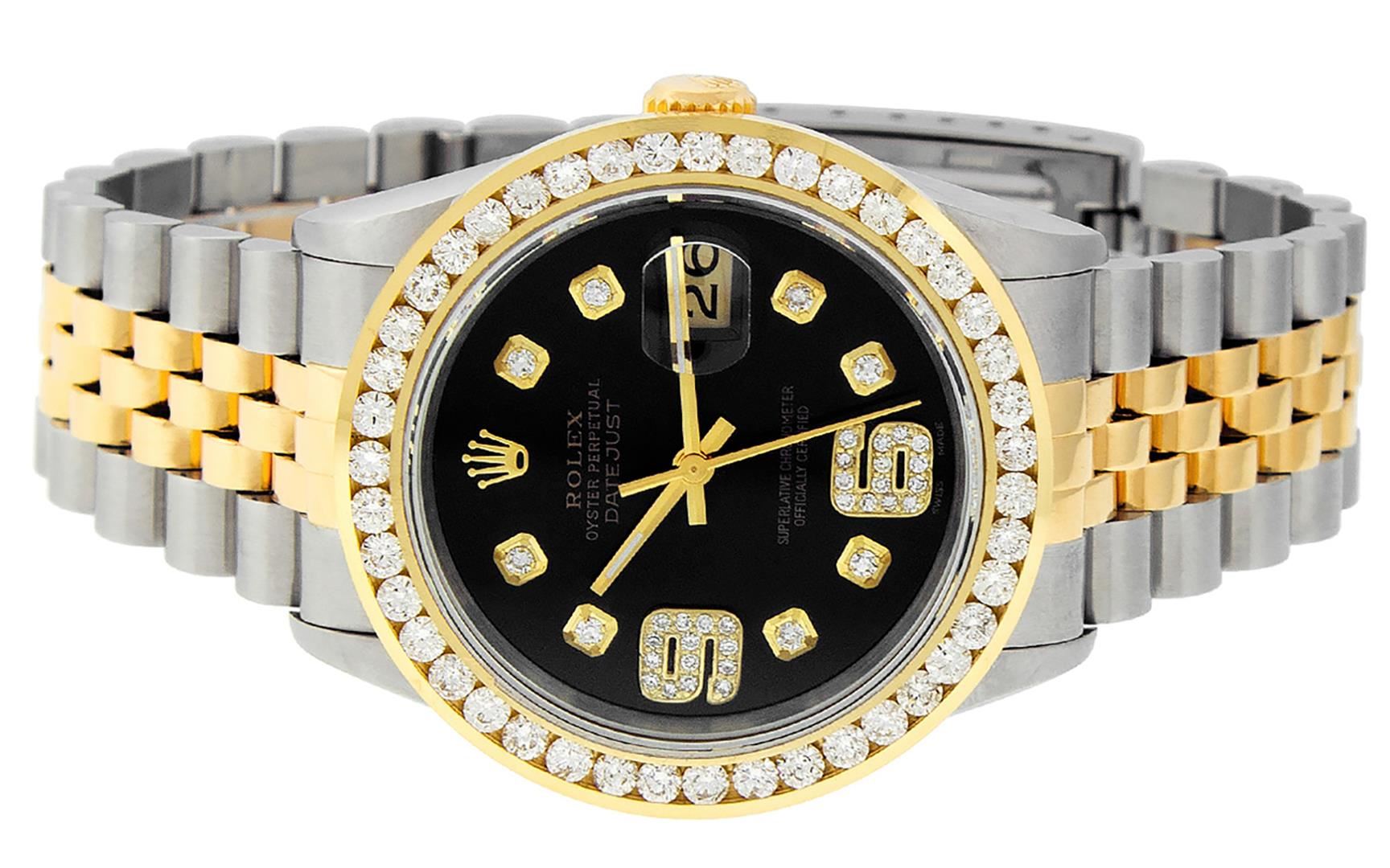 One Mens Pre Owned Rolex Two Tone Stainless Steel and Yellow Gold Datejust Polished Bright with Satin Finish, Serviced & Electronically Tested, Stainless Steel Case: 36mm, Stainless Steel Crown Custom Bezel: New 18K Yellow Gold 3ct Channel Set Diamond Bezel, Diamond Count: 40 Diamonds, Total Weight 3.00 Carat. Custom Crystal: New Sapphire With Magnified Date Window. Rolex Movement: Automatic Winding Movement Caliber 3135. Custom Dial: Refinish To Black With Custom Added Diamonds on 9 & 6 Diamond With Diamond Hour Markers, Diamond Count: 8 Diamonds + 28 Diamonds On 6 & 9 Hour Markers. Date Window: 3 O'Clock Position Date Display, Quickset, Model: Quickset Datejust. Condition: G-6 Extra Fine. Rolex Bracelet: Stainless Steel and Yellow Gold Jubilee Band. Bright Polish & Satin Finish. 7.0 Inch Length, Adjustable. Standard Clasp, With Rolex Logo.