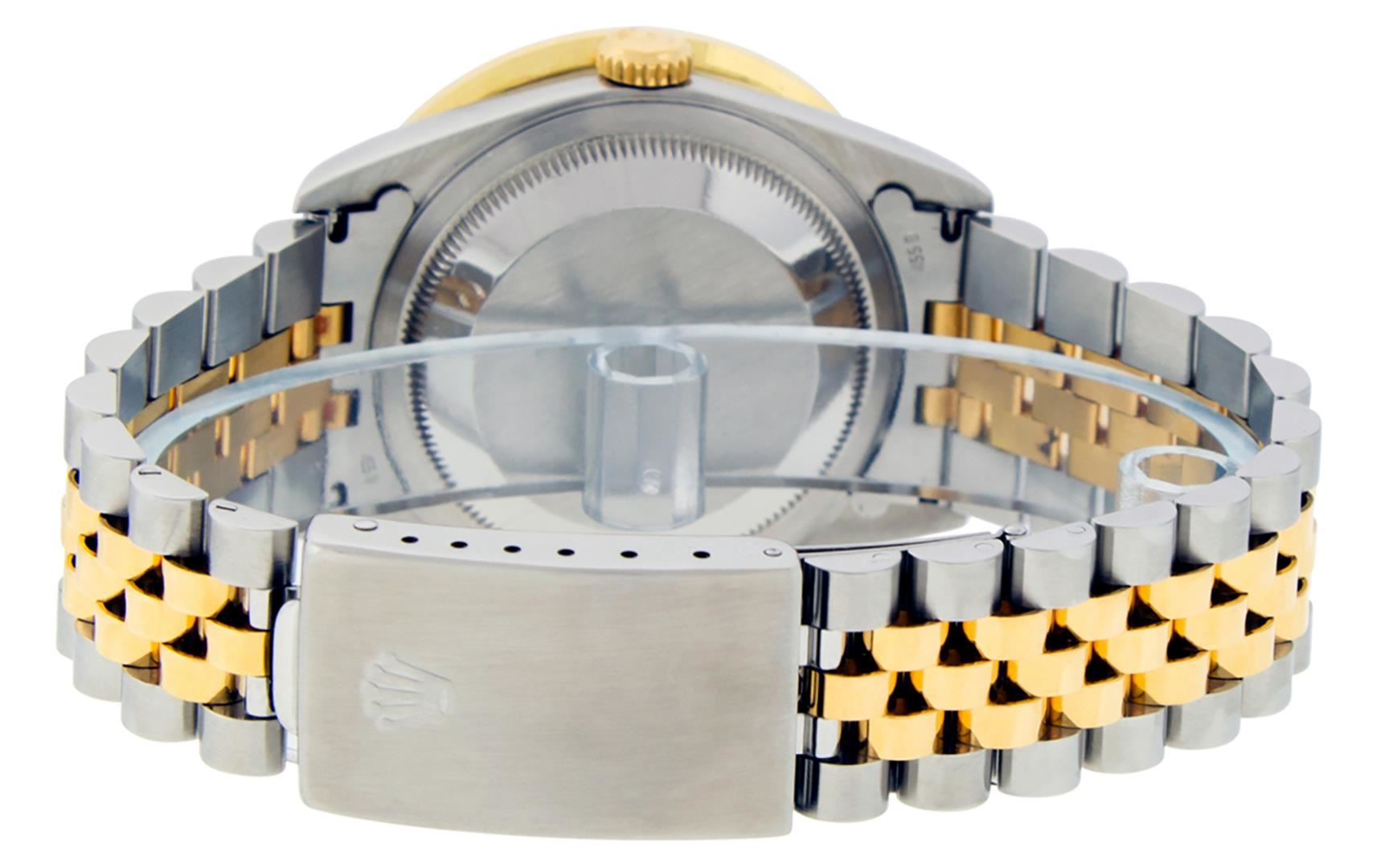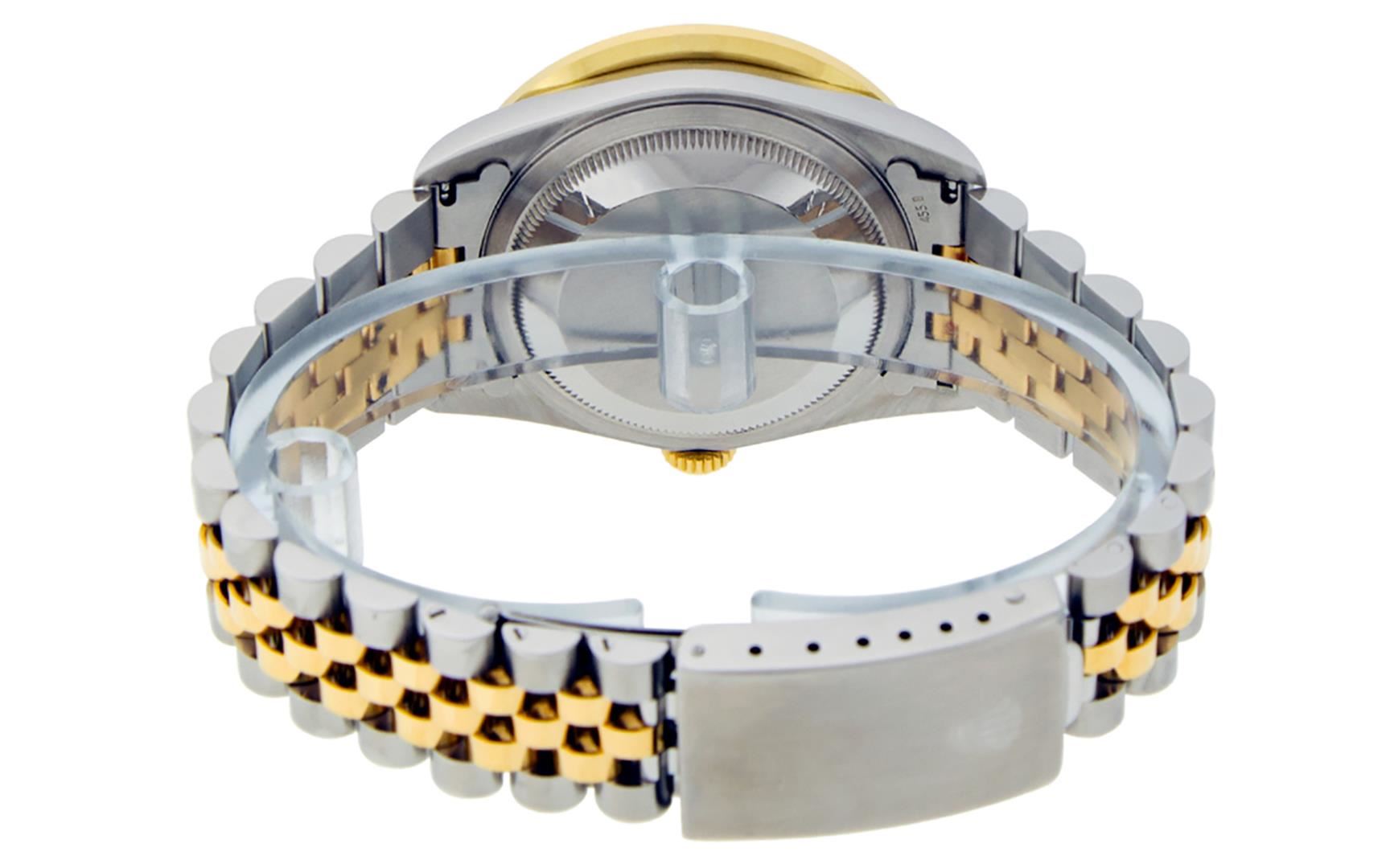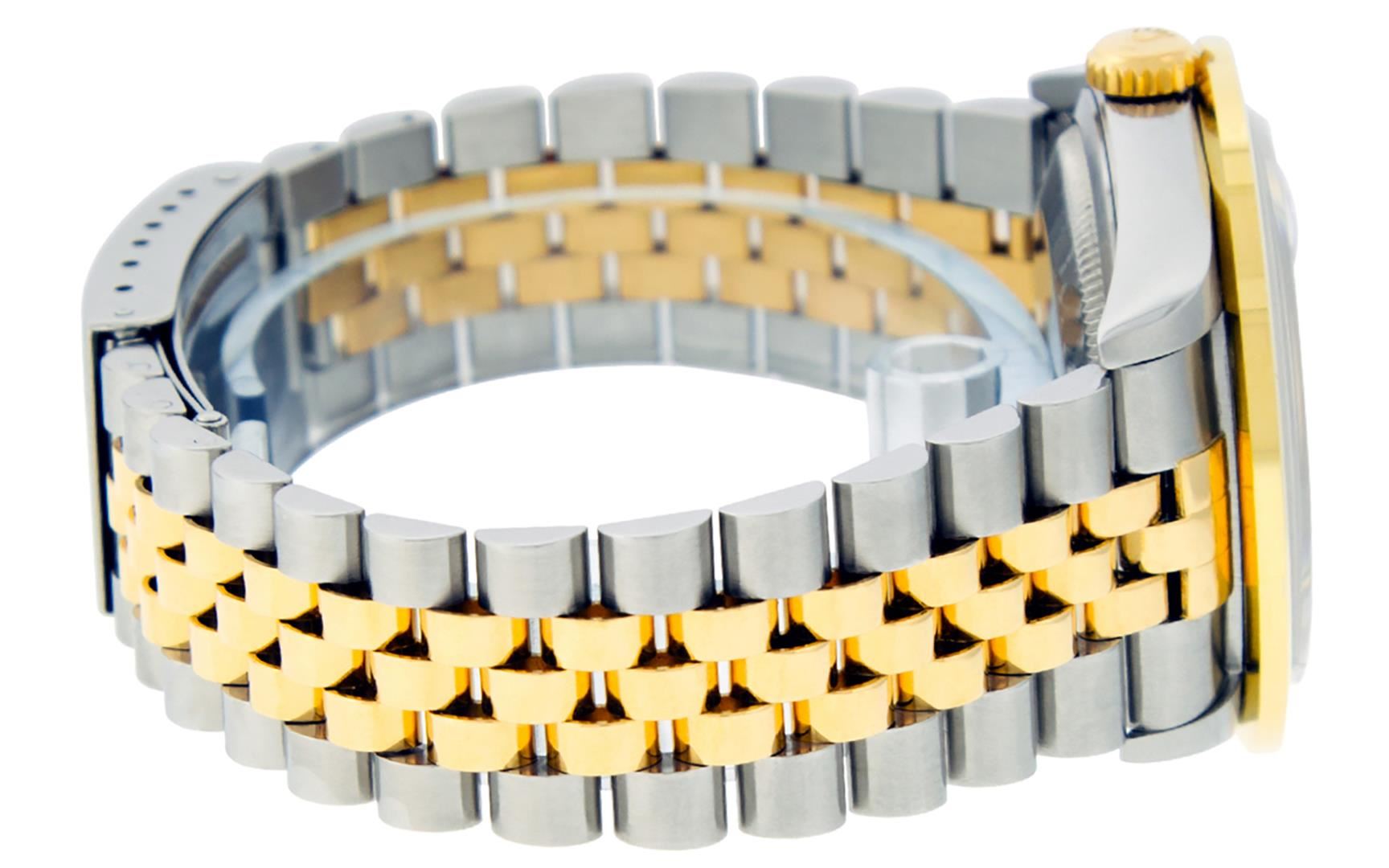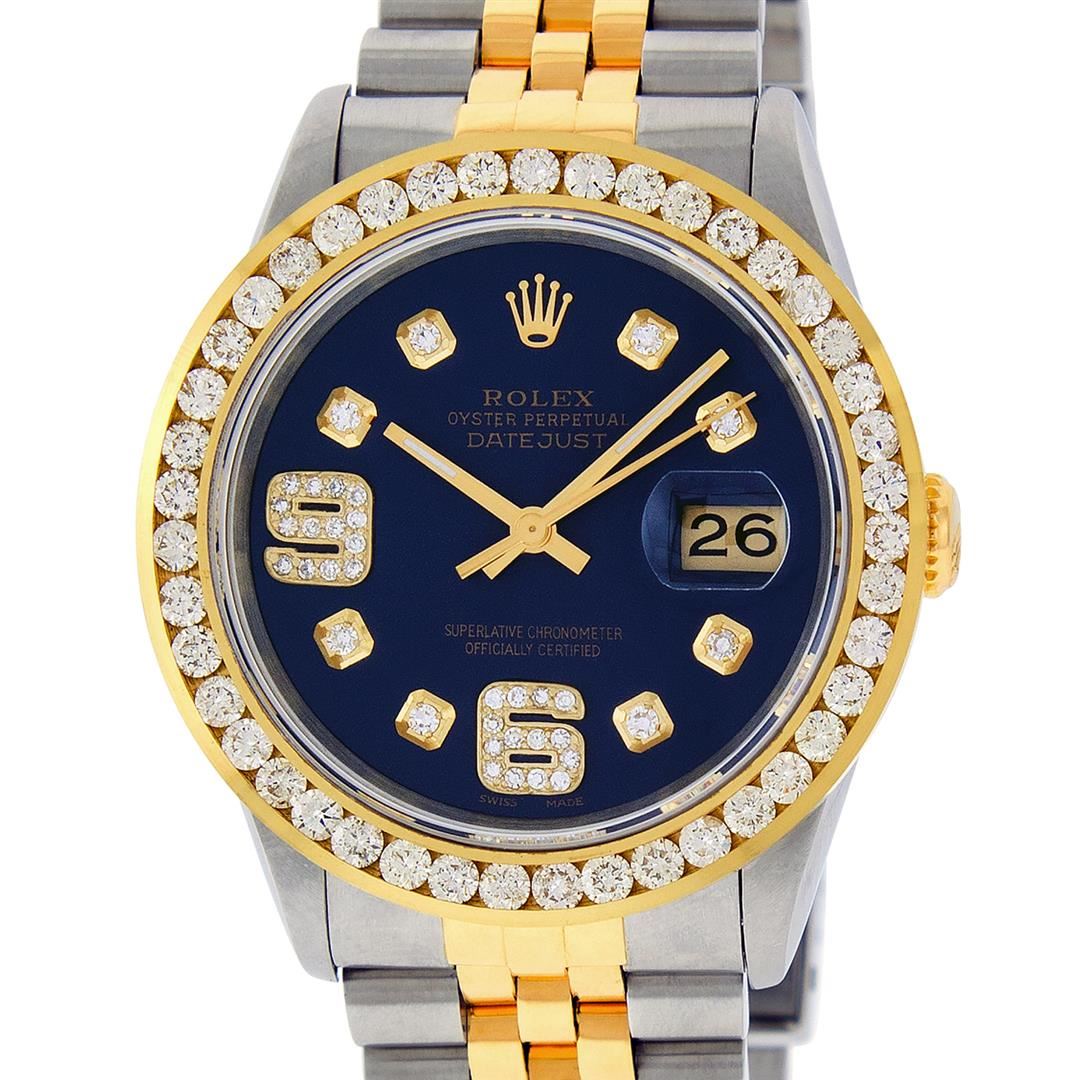 One Mens Pre Owned Rolex Two Tone Stainless Steel and Yellow Gold Datejust Polished Bright with Satin Finish, Serviced & Electronically Tested, Stainless Steel Case: 36mm, Stainless Steel Crown, Custom Bezel: New 18K Yellow Gold 3ct Channel Set Diamond Bezel, Diamond Count: 40 Diamonds, Total Weight 3.00 Carat. Custom Crystal: New Sapphire With Magnified Date Window. Rolex Movement: Automatic Winding Movement Caliber 3135. Custom Dial: Refinish To Blue With Custom Added Diamonds on 9 & 6 Diamond With Diamond Hour Markers, Diamond Count: 8 Diamonds + 28 Diamonds On 6 & 9 Hour Markers. Date Window: 3 O'Clock Position Date Display, Quickset, Model: Quickset Datejust. Condition: G-6 Extra Fine. Rolex Bracelet: Stainless Steel and Yellow Gold Jubilee Band. Bright Polish & Satin Finish. 7.0 Inch Length, Adjustable. Standard Clasp, With Rolex Logo.
