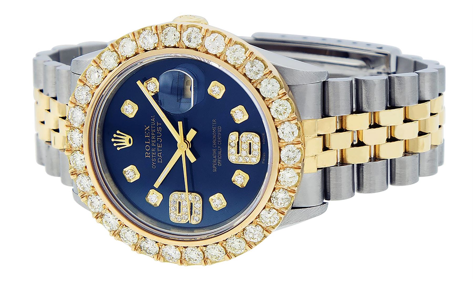 One Mens Pre Owned Rolex Two Tone Stainless Steel and Yellow Gold Datejust Polished Bright with Satin Finish, Serviced & Electronically Tested, Stainless Steel Case: 36mm, Stainless Steel Crown, Custom Bezel: New 18K Yellow Gold 4ct Channel Set Diamond Bezel, Diamond Count: 30 Diamonds, Total Weight 4.00 Carat. Custom Crystal: New Sapphire With Magnified Date Window. Rolex Movement: Automatic Winding Movement Caliber 3135. Custom Dial: Refinish To Blue With Custom Added Diamonds on 9 & 6 Diamond With Diamond Hour Markers, Diamond Count: 8 Diamonds + 28 Diamonds On 6 & 9 Hour Markers. Date Window: 3 O'Clock Position Date Display, Quickset, Model: Quickset Datejust. Condition: G-6 Extra Fine. Rolex Bracelet: Stainless Steel and Yellow Gold Jubilee Band. Bright Polish & Satin Finish. 7.0 Inch Length, Adjustable. Standard Clasp, With Rolex Logo.