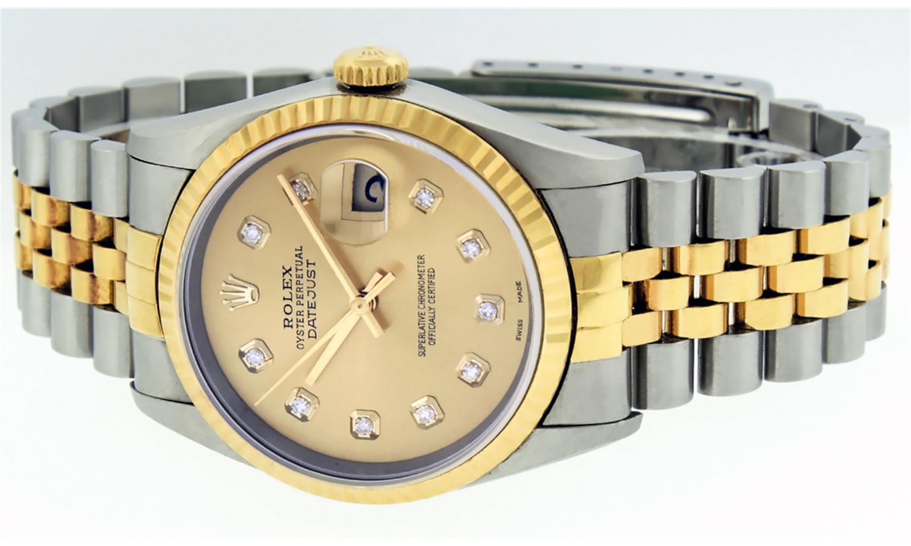 One Mens Pre Owned Rolex Two Tone Stainless Steel and Yellow Gold Datejust Polished Bright with Satin Finish, Serviced & Electronically Tested, Stainless Steel Case: 36mm, Stainless Steel Crown, Rolex Bezel: Yellow Gold Fluted Bezel. Custom Crystal: New Sapphire With Date Window. Custom Hands: New Solid Hands. Rolex Movement: Automatic Winding Movement Caliber 3135. Custom Dial: Champagne With Custom Added Diamond Hour Markers, Diamond Count: 10 Diamonds in Dial. Date Window: 3 O'Clock Position Date Display, Quickset, Model: Quickset Datejust. Condition: G-6 Extra Fine. Rolex Bracelet: Stainless Steel and Yellow Gold Jubilee Band. Bright Polish & Satin Finish. 7.0 Inch Length, Adjustable. Standard Clasp, With Rolex Logo.