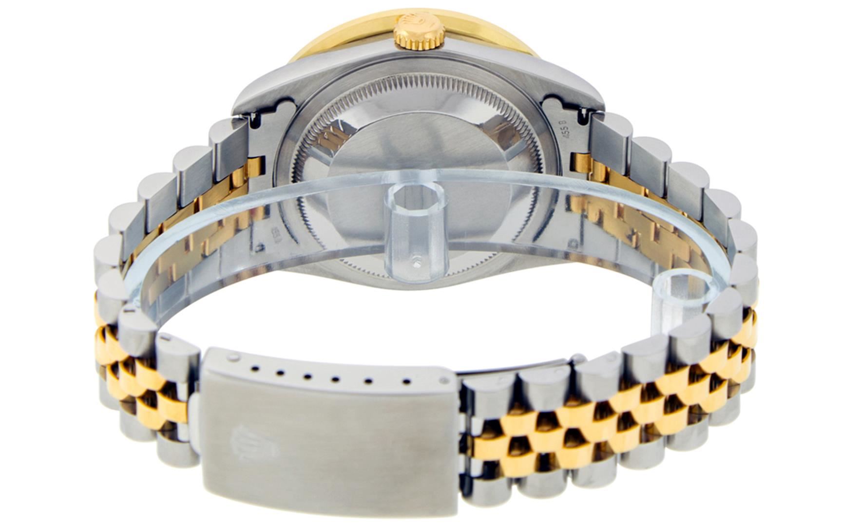 One Mens Pre Owned Rolex Two Tone Stainless Steel and Yellow Gold Datejust Polished Bright with Satin Finish, Serviced & Electronically Tested, Stainless Steel Case: 36mm, Stainless Steel Crown Custom Bezel: New 18K Yellow Gold 3ct Channel Set Diamond Bezel, Diamond Count: 40 Diamonds, Total Weight 3.00 Carat. Custom Crystal: New Sapphire With Magnified Date Window. Rolex Movement: Automatic Winding Movement Caliber 3135. Custom Dial: Refinish To Green With Custom Added Diamonds on 9 & 6 Diamond With Diamond Hour Markers, Diamond Count: 8 Diamonds + 28 Diamonds On 6 & 9 Hour Markers. Date Window: 3 O'Clock Position Date Display, Quickset, Model: Quickset Datejust. Condition: G-6 Extra Fine. Rolex Bracelet: Stainless Steel and Yellow Gold Jubilee Band. Bright Polish & Satin Finish. 7.0 Inch Length, Adjustable. Standard Clasp, With Rolex Logo.