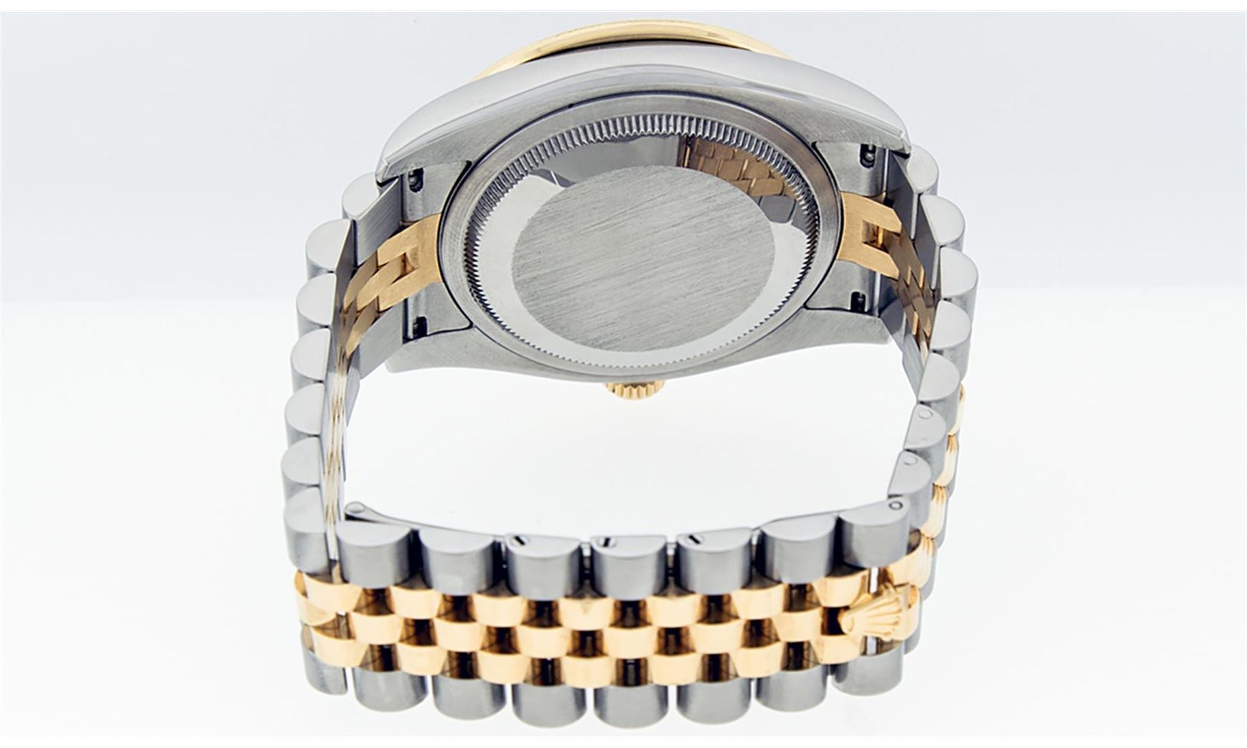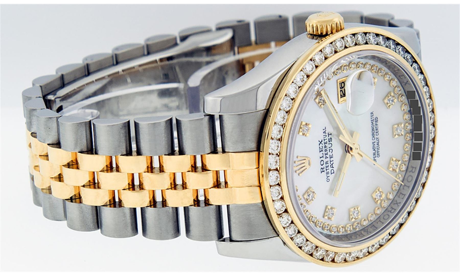 One Mens Pre Owned 18K Yellow Gold & Stainless Steel Rolex Datejust Polished Bright with Satin Finish, Serviced & Electronically Tested, Stainless Steel Case: 36mm, Yellow Gold Crown, Custom Bezel: New 18K Yellow Gold 3ct Channel Set Diamond Bezel, Diamond Count: 40 Diamonds, Total Weight 3.00 Carat. Custom Crystal: New Sapphire With Magnified Date Window. Hands: Luminescent Hands. Rolex Movement: Automatic Winding Movement. Custom Dial: MOP Diamond Dial, Diamond Count: 58 Diamonds In Dial. Date Window: 3 O'Clock Position Date Display, Quickset, Model: Datejust 116233. Condition: G-6 Extra Fine. Rolex Bracelet: Yellow Gold And Stainless Steel Jubilee Band. Bright Polish & Satin Finish. 7.0 Inch Length, Adjustable. Standard Clasp, With Rolex Logo. This Watch Has Been Serviced And Polished It Is Free Of All Scratches And Dents.