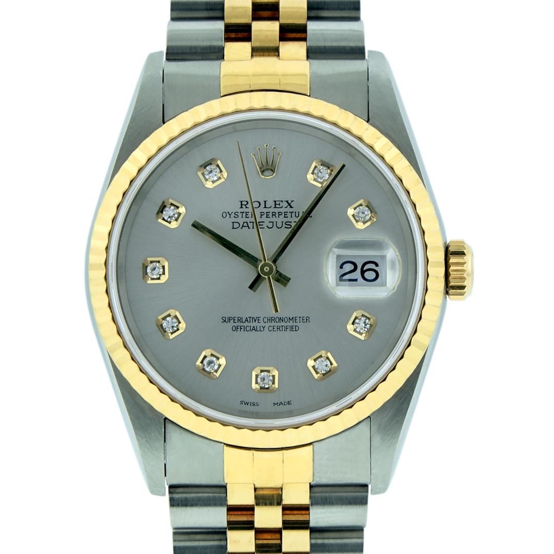 One Mens Pre Owned Rolex Two Tone Stainless Steel and Yellow Gold Datejust Polished Bright with Satin Finish, Serviced & Electronically Tested, Stainless Steel Case: 36mm, Stainless Steel Crown, Rolex Bezel: Yellow Gold Fluted Bezel. Custom Crystal: New Sapphire With Date Window. Custom Hands: New Solid Hands. Rolex Movement: Automatic Winding Movement Caliber 3135. Custom Dial: Gray With Custom Added Diamond Hour Markers, Diamond Count: 10 Diamonds in Dial. Date Window: 3 O'Clock Position Date Display, Quickset, Model: Quickset Datejust. Condition: G-6 Extra Fine. Rolex Bracelet: Stainless Steel and Yellow Gold Jubilee Band. Bright Polish & Satin Finish. 7.0 Inch Length, Adjustable. Standard Clasp, With Rolex Logo.