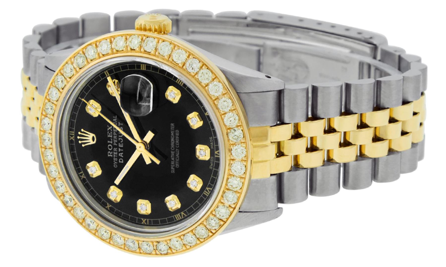 One Mens Pre Owned Two Tone Yellow Gold And Stainless Steel Rolex Datejust Polished Bright with Satin Finish, Serviced And Electronically Tested, Rolex Yellow Gold And Stainless Steel Case: 36mm, Rolex Yellow Gold Crown, Custom Bezel: New 18K Yellow Gold Beadset Diamond Bezel, Diamond Count: 40 Diamonds On Bezel, Total Weight 2.0 Carat. Custom Crystal: New Sapphire With Date Window. Custom Hands: New Luminescent Hands. Rolex Movement: Automatic Winding Movement 3035. Custom Dial: Custom Black Dial With Added Diamonds, Diamond Count: 10 Diamonds On Dial. Date Window: 3 O'Clock Position Date Display, Quickset, Model: Datejust. Condition: G-6 Extra Fine. Rolex Bracelet: Yellow Gold And Stainless Steel Jubilee Band. Bright Polish And Satin Finish. 7.0 Inch Length, Adjustable. Standard Clasp, With Rolex Logo. This Watch Has Been Serviced and Polished And It Is Free Of All Dents And Scratches And Has Been Time Tested.