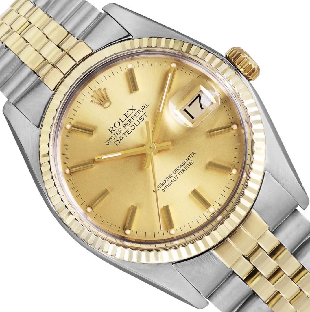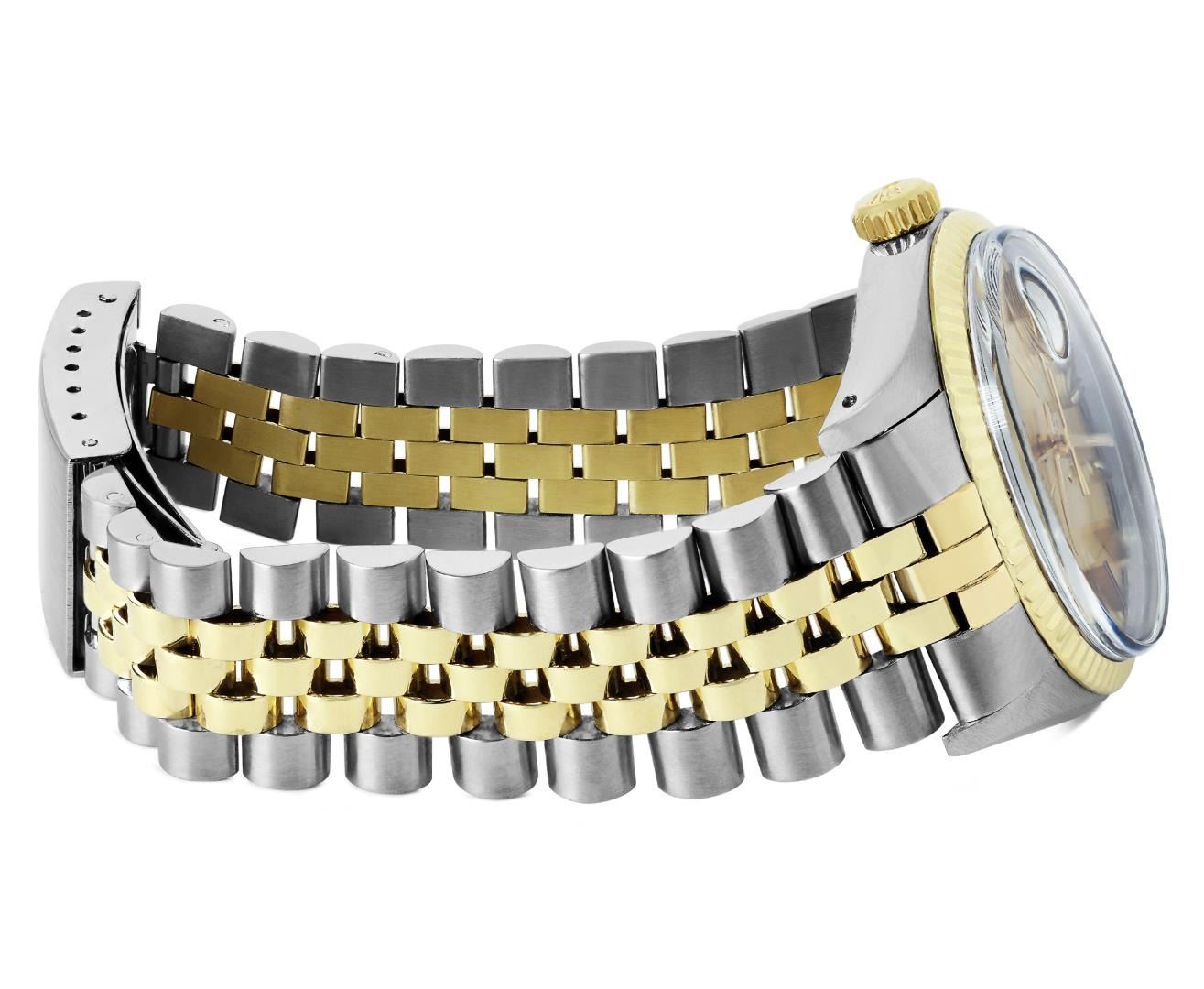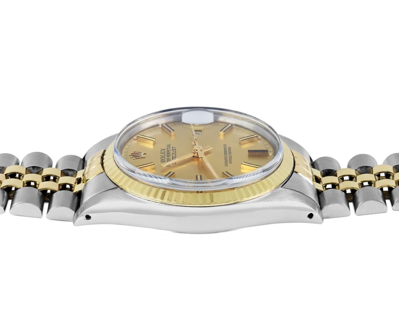 One Mens Pre Owned Yellow Gold Two Tone Rolex Datejust Polished, Serviced And Electronically Tested, Rolex Yellow Gold And Stainless Steel Case: 36mm, Rolex Yellow Gold Crown, Rolex Bezel: Yellow Gold Fluted Bezel. Custom Crystal: New Plastic With Magnified Date Window. Hands: Luminescent Hands. Rolex Movement: Automatic Winding Movement 3035. Rolex Dial: Champagne Dial With Index Hour Markers and Dash Track With Lumi Dots. Date Window: 3 O'Clock Position Date Display, Quickset, Model: Quickset Datejust. Condition: G-6 Extra Fine. Rolex Bracelet: Two Tone Yellow Gold And Stainless Steel Jubilee Band. Bright Polish. 7.0 Inch Length, Adjustable. Standard Clasp, With Rolex Logo. This Watch Has Been Serviced Time Tested And Is In Excellent Condition It Is Free Of All Scratches And Dents. This Watch Comes With A Rolex Box.