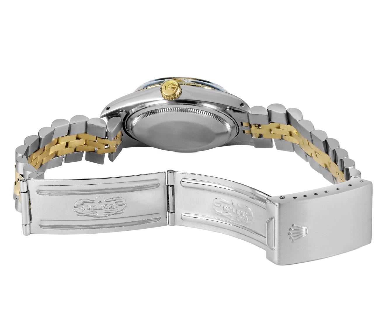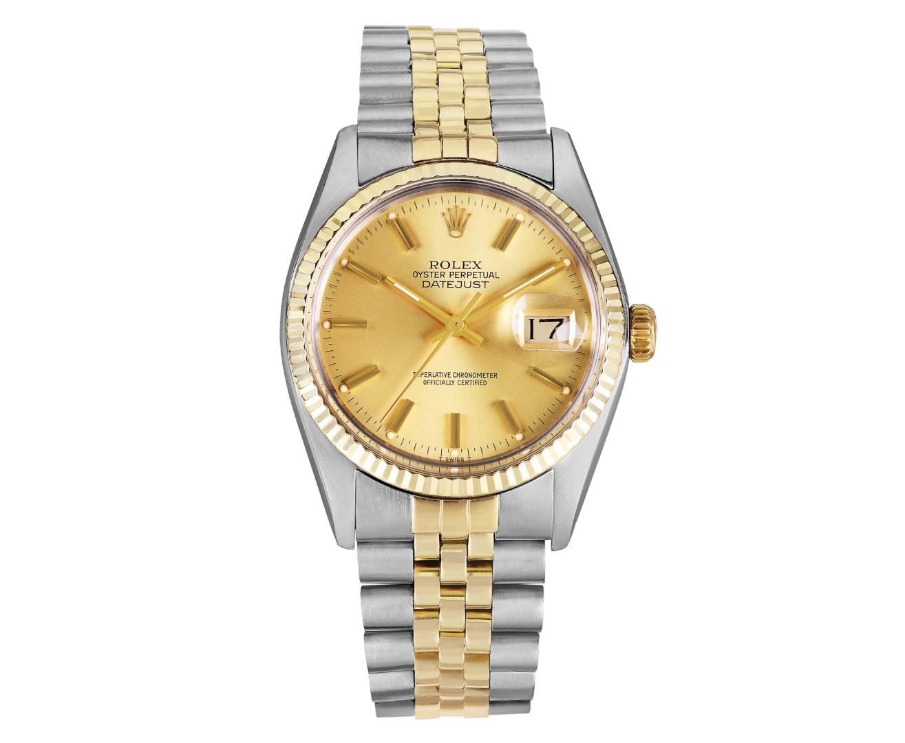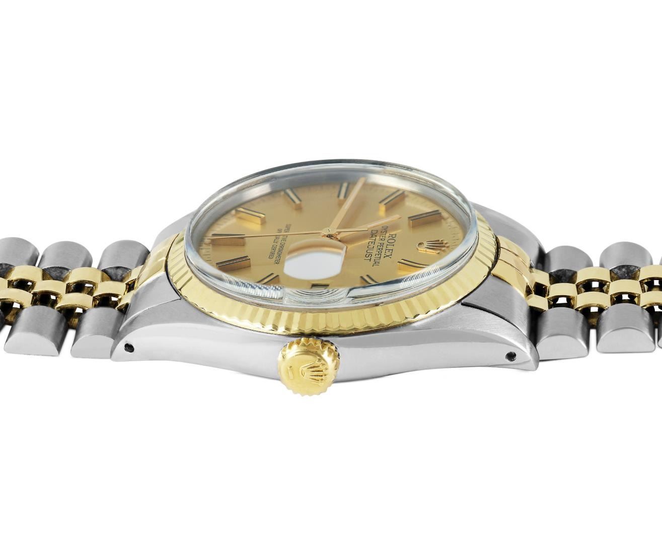 One Mens Pre Owned Yellow Gold Two Tone Rolex Datejust Polished, Serviced And Electronically Tested, Rolex Yellow Gold And Stainless Steel Case: 36mm, Rolex Yellow Gold Crown, Rolex Bezel: Yellow Gold Fluted Bezel. Custom Crystal: New Plastic With Magnified Date Window. Hands: Luminescent Hands. Rolex Movement: Automatic Winding Movement 3035. Rolex Dial: Champagne Dial With Index Hour Markers and Dash Track With Lumi Dots. Date Window: 3 O'Clock Position Date Display, Quickset, Model: Quickset Datejust. Condition: G-6 Extra Fine. Rolex Bracelet: Two Tone Yellow Gold And Stainless Steel Jubilee Band. Bright Polish. 7.0 Inch Length, Adjustable. Standard Clasp, With Rolex Logo. This Watch Has Been Serviced Time Tested And Is In Excellent Condition It Is Free Of All Scratches And Dents. This Watch Comes With A Rolex Box.