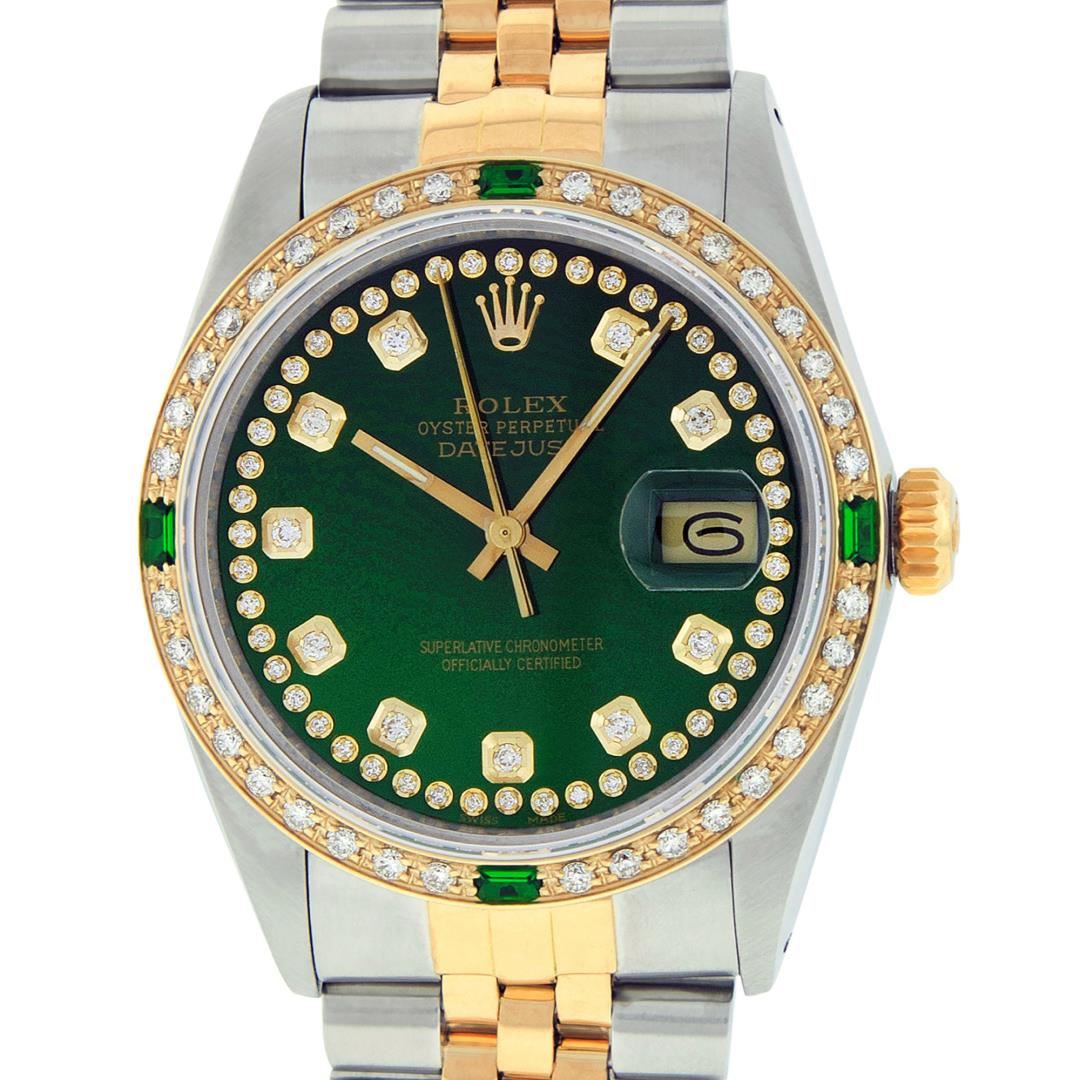 One Mens Pre Owned Two Tone Yellow Gold And Stainless Steel Rolex Datejust Polished, Serviced And Electronically Tested, Rolex Yellow Gold And Stainless Steel Case: 36mm, Rolex Yellow Gold Crown, Custom Bezel: New 18K Yellow Gold Emerald Beadset Diamond Bezel, Diamond Count: 36 Diamonds + 4 Emeralds. Custom Crystal: New Sapphire With Date Window. Custom Hands: New Luminescent Hands. Rolex Movement: Automatic Winding Movement 3035. Custom Dial: Custom Green Dial With Added Diamonds, Diamond Count: 58 Diamonds On Dial. Date Window: 3 O'Clock Position Date Display, Quickset, Model: Quickset Datejust. Condition: G-6 Extra Fine. Rolex Bracelet: Two Tone Yellow Gold And Stainless Steel Jubilee Band. Bright Polish. 7.0 Inch Length, Adjustable. Standard Clasp, With Rolex Logo. This Watch Has Been Serviced Time Tested And Is In Excellent Condition It Is Free Of All Scratches And Dents.