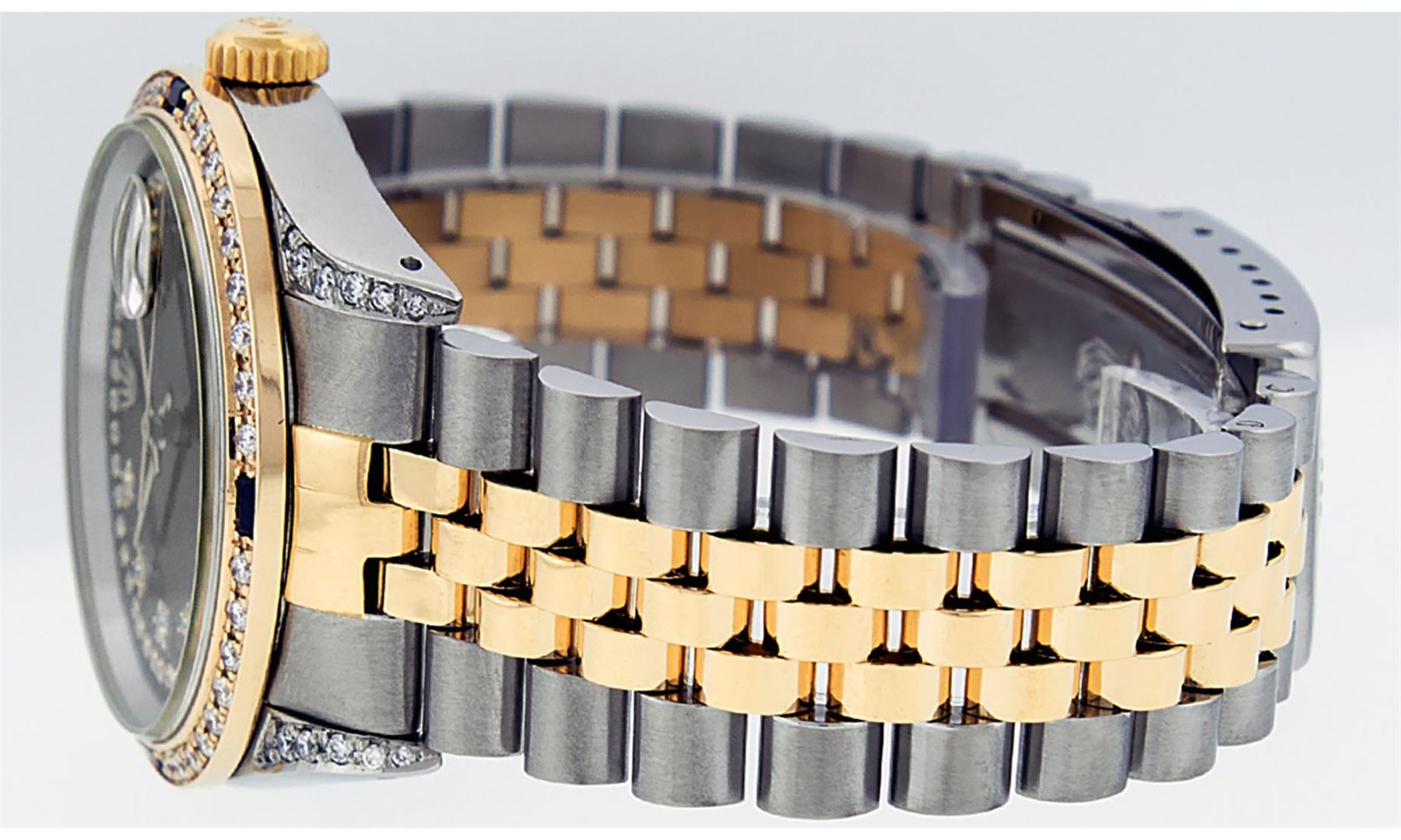 One Mens Pre Owned Two Tone Yellow Gold And Stainless Steel Rolex Datejust Polished Bright with Satin Finish, Serviced And Electronically Tested, Rolex Stainless Steel Case: 36mm, Custom Diamond Lugs: 28 Added Diamonds On Lugs. Rolex Yellow Gold Crown, Custom Bezel: New 18K Yellow Gold Beadset Diamond + Sapphire Bezel, Diamond + Stone Count: 36 Diamonds + 4 Sapphires. Custom Crystal: New Sapphire With Magnified Date Window. Custom Hands: New Luminescent Hands. Rolex Movement: Automatic Winding Movement 3035. Custom Dial: Custom Black Dial With Added Diamonds, Stone Count: 58 Diamonds In Dial. Date Window: 3 O'Clock Position Date Display, Quickset, Model: Datejust. Condition: G-6 Extra Fine. Rolex Bracelet: Yellow Gold And Stainless Steel Jubilee Band. Bright Polish And Satin Finish. 7.0 Inch Length, Adjustable. Standard Clasp, With Rolex Logo. This Watch Has Been Serviced And Polished It Is Free Of All Scratches And Dents.