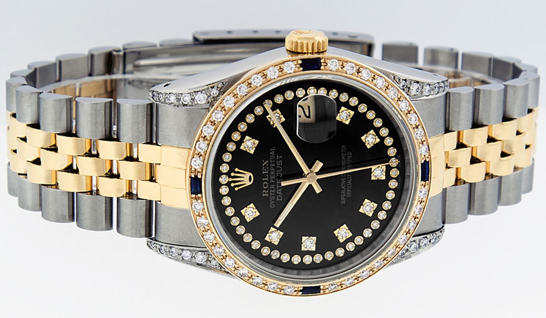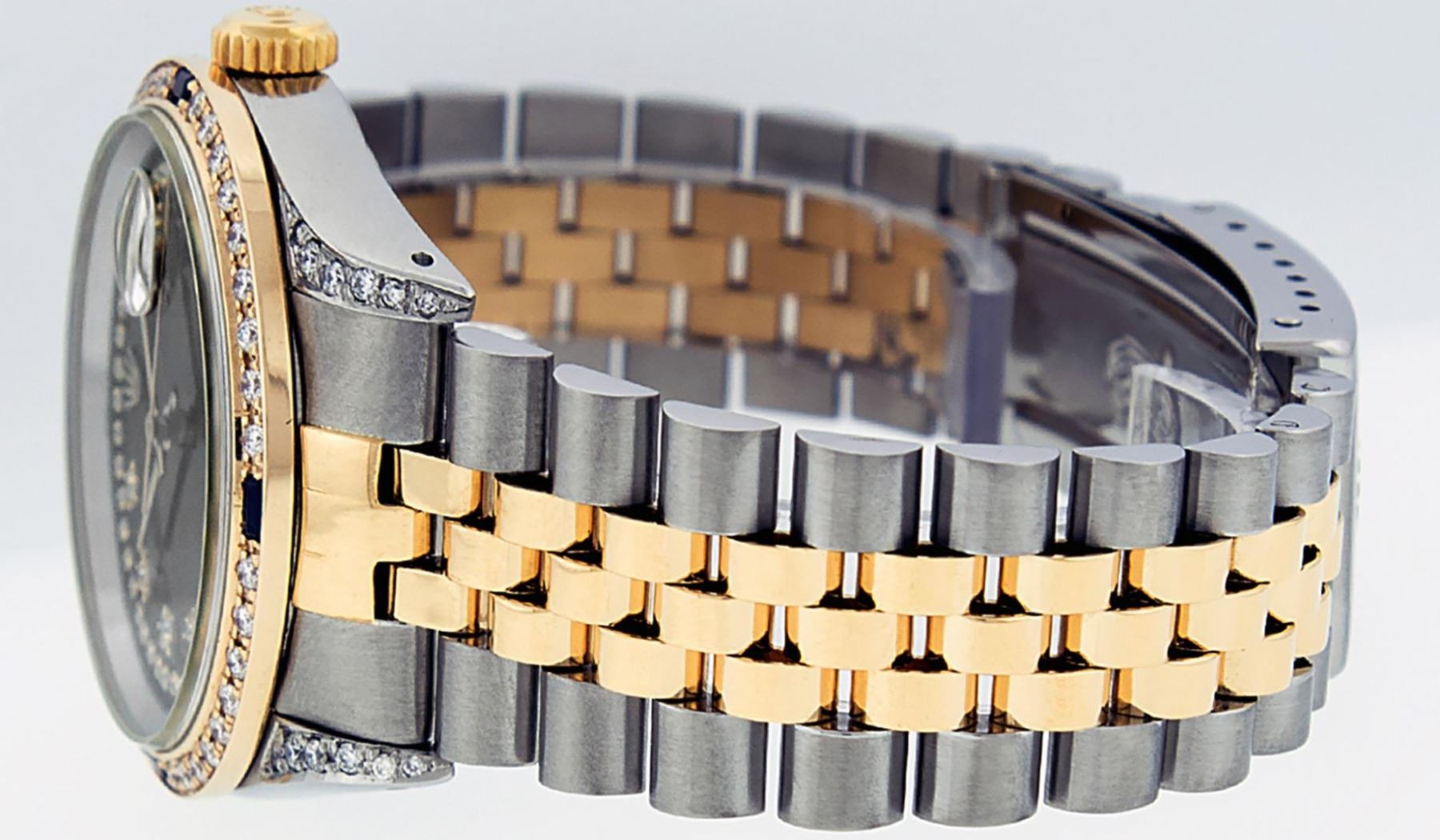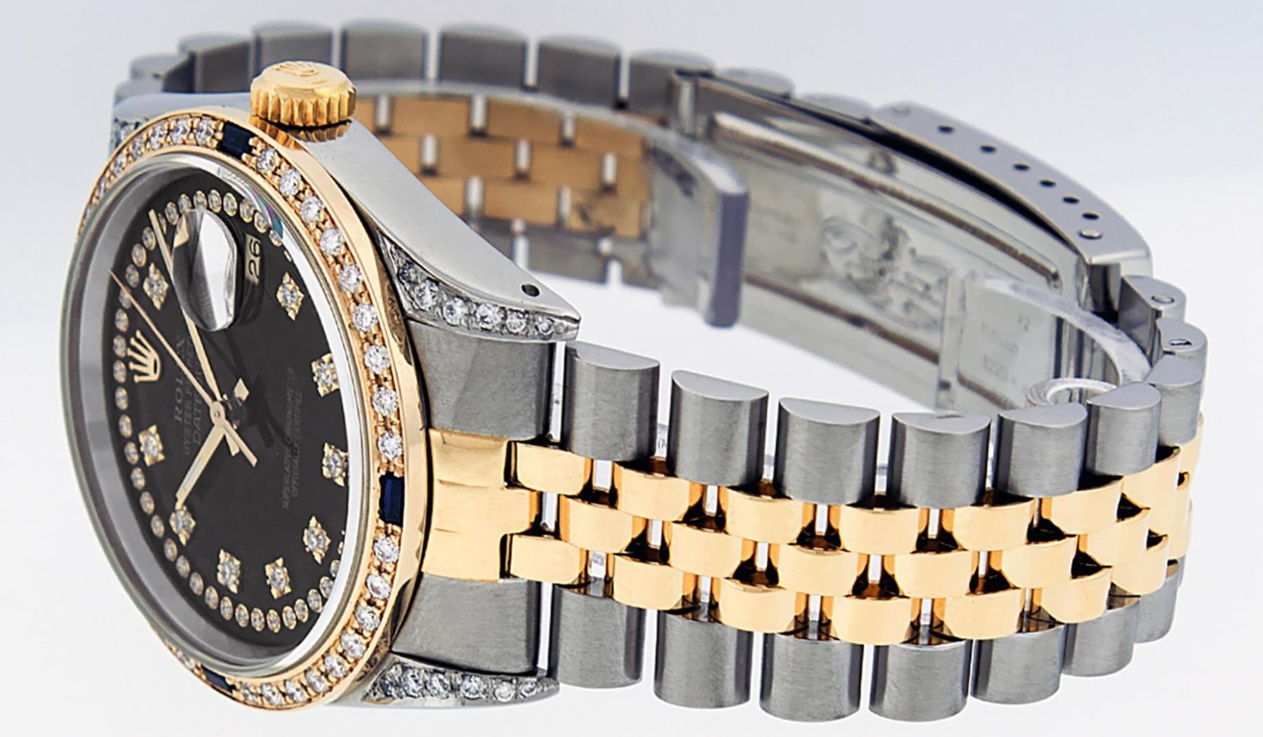 One Mens Pre Owned Two Tone Yellow Gold And Stainless Steel Rolex Datejust Polished Bright with Satin Finish, Serviced And Electronically Tested, Rolex Stainless Steel Case: 36mm, Custom Diamond Lugs: 28 Added Diamonds On Lugs. Rolex Yellow Gold Crown, Custom Bezel: New 18K Yellow Gold Beadset Diamond + Sapphire Bezel, Diamond + Stone Count: 36 Diamonds + 4 Sapphires. Custom Crystal: New Sapphire With Magnified Date Window. Custom Hands: New Luminescent Hands. Rolex Movement: Automatic Winding Movement 3035. Custom Dial: Custom Black Dial With Added Diamonds, Stone Count: 58 Diamonds In Dial. Date Window: 3 O'Clock Position Date Display, Quickset, Model: Datejust. Condition: G-6 Extra Fine. Rolex Bracelet: Yellow Gold And Stainless Steel Jubilee Band. Bright Polish And Satin Finish. 7.0 Inch Length, Adjustable. Standard Clasp, With Rolex Logo. This Watch Has Been Serviced And Polished It Is Free Of All Scratches And Dents.