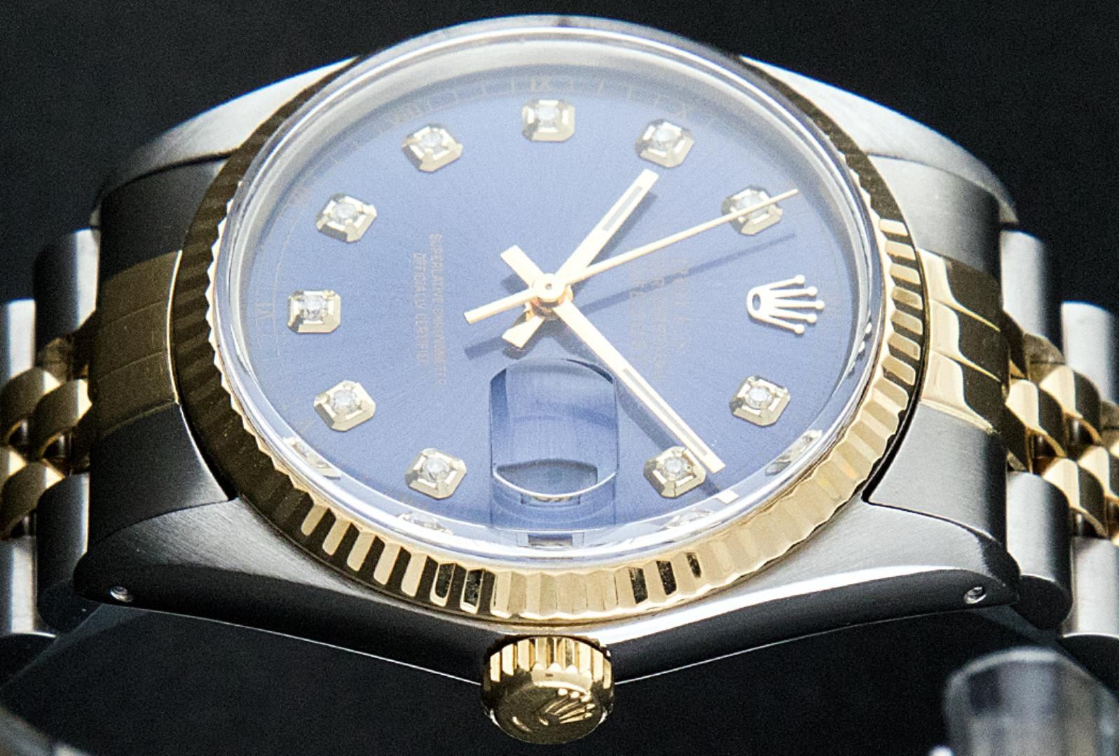 One Mens Pre Owned Two Tone Yellow Gold And Stainless Steel Rolex Datejust Polished, Serviced And Electronically Tested, Rolex Yellow Gold And Stainless Steel Case: 36mm, Rolex Yellow Gold Crown, Rolex Bezel: Yellow Gold Fluted Bezel. Custom Crystal: New Acrylic With Magnified Date Window. Custom Hands: New Luminecent Hands. Rolex Movement: Automatic Winding Movement 3035. Custom Dial: Custom Blue Dial With Added Genuine Diamond Hour Markers And Square Roman Track, Diamond Count: 10 Diamonds On Dial. Date Window: 3 O'Clock Position Date Display, Quickset, Model: Datejust, Condition: G-6 Extra Fine. Rolex Bracelet: Two Tone Yellow Gold And Stainless Steel Jubilee Band. Bright Polish. 7.0 Inch Length, Adjustable. Standard Clasp, With Rolex Logo. This Watch Has Been Serviced And Polished It Is Free Of All Scratches And Dents.
