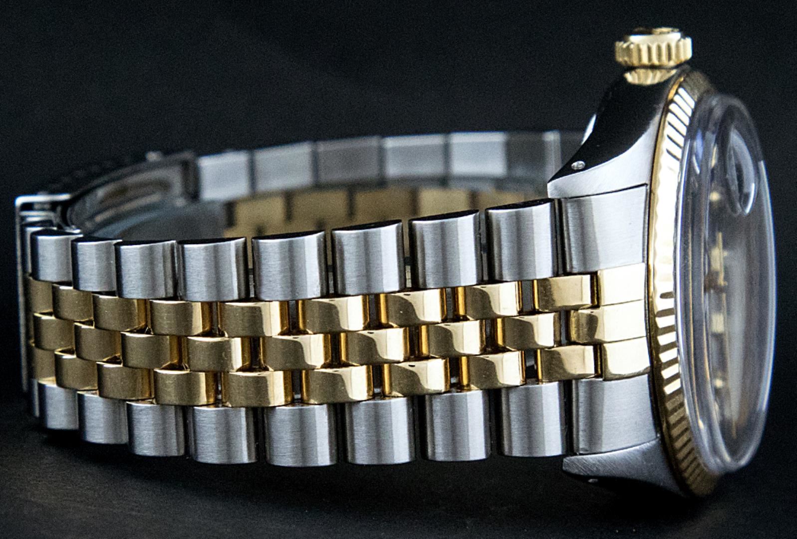 One Mens Pre Owned Two Tone Yellow Gold And Stainless Steel Rolex Datejust Polished, Serviced And Electronically Tested, Rolex Yellow Gold And Stainless Steel Case: 36mm, Rolex Yellow Gold Crown, Rolex Bezel: Yellow Gold Fluted Bezel. Custom Crystal: New Acrylic With Magnified Date Window. Custom Hands: New Luminecent Hands. Rolex Movement: Automatic Winding Movement 3035. Custom Dial: Custom Blue Dial With Added Genuine Diamond Hour Markers And Square Roman Track, Diamond Count: 10 Diamonds On Dial. Date Window: 3 O'Clock Position Date Display, Quickset, Model: Datejust, Condition: G-6 Extra Fine. Rolex Bracelet: Two Tone Yellow Gold And Stainless Steel Jubilee Band. Bright Polish. 7.0 Inch Length, Adjustable. Standard Clasp, With Rolex Logo. This Watch Has Been Serviced And Polished It Is Free Of All Scratches And Dents.